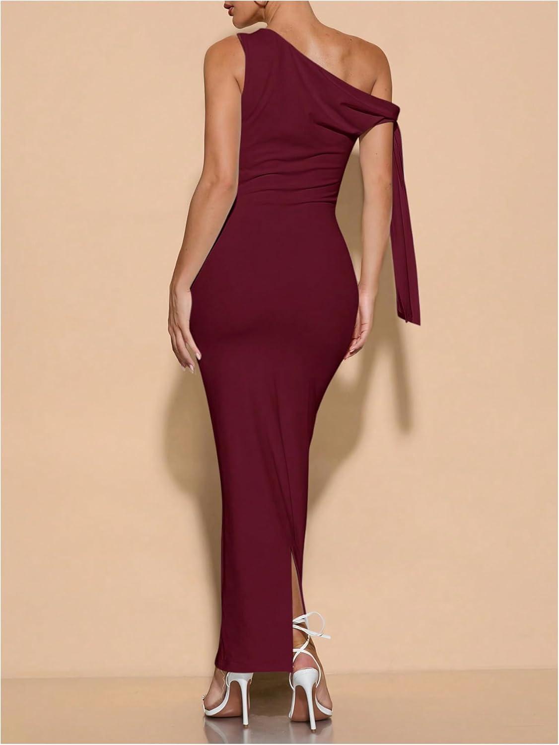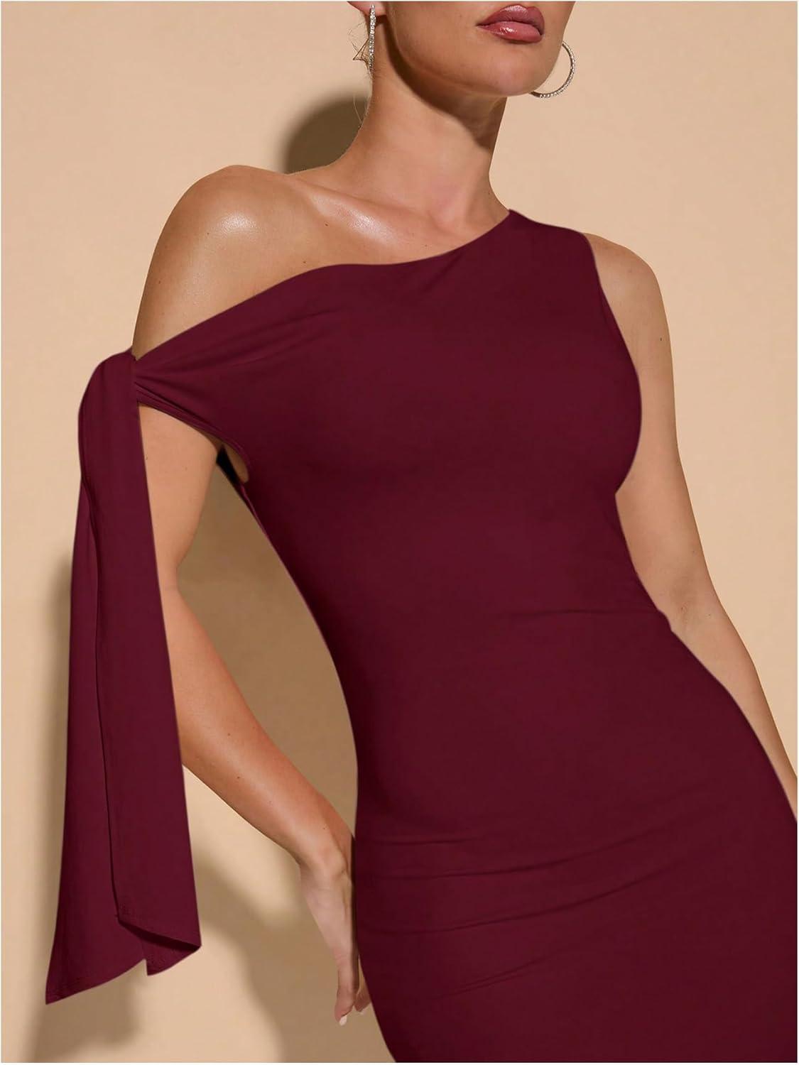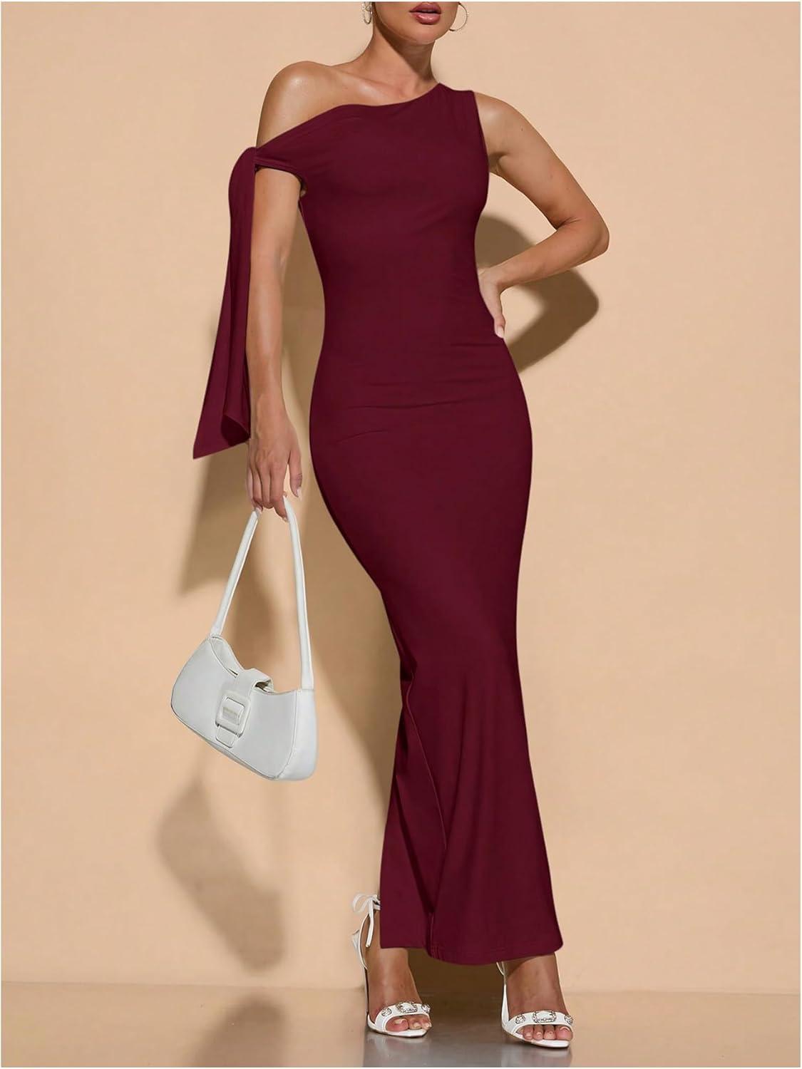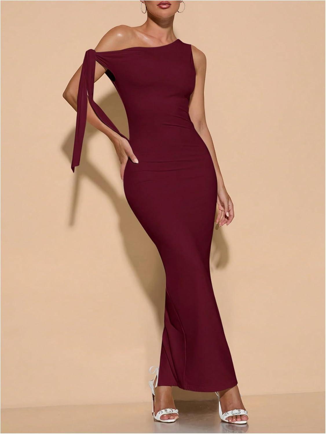 SOLY HUX Women’s Off The Shoudler Bodycon Maxi Dress Asymmetrical Neck Bow Tie Cocktail Party Long Dresses(Solid Burgundy)