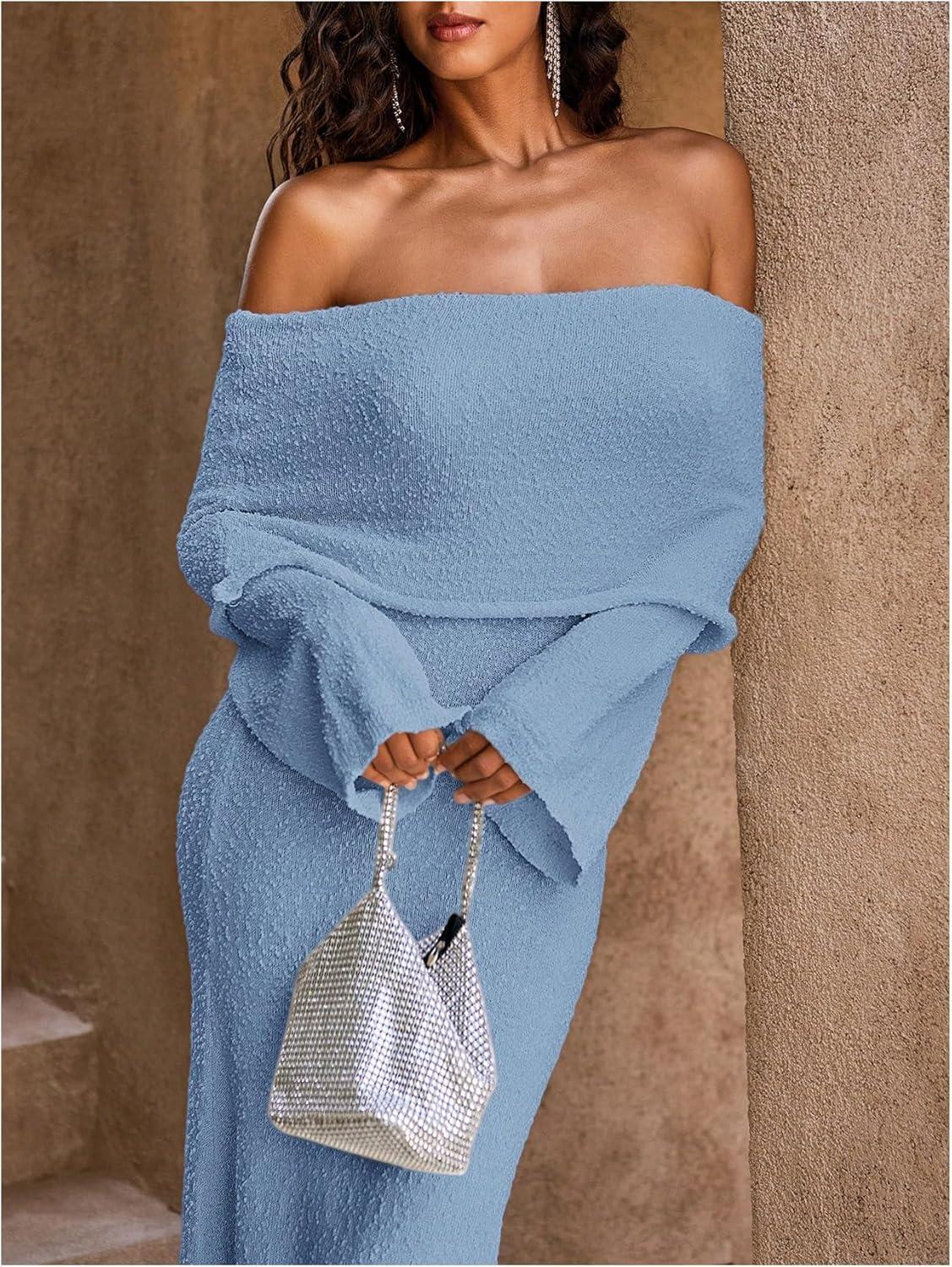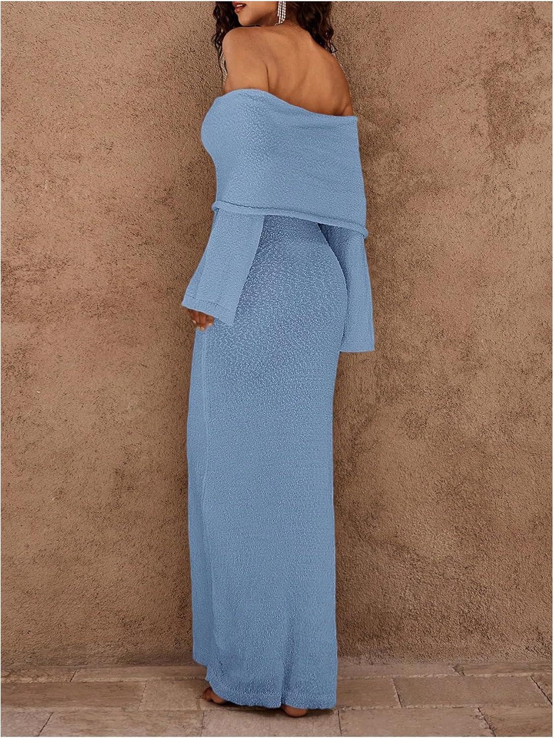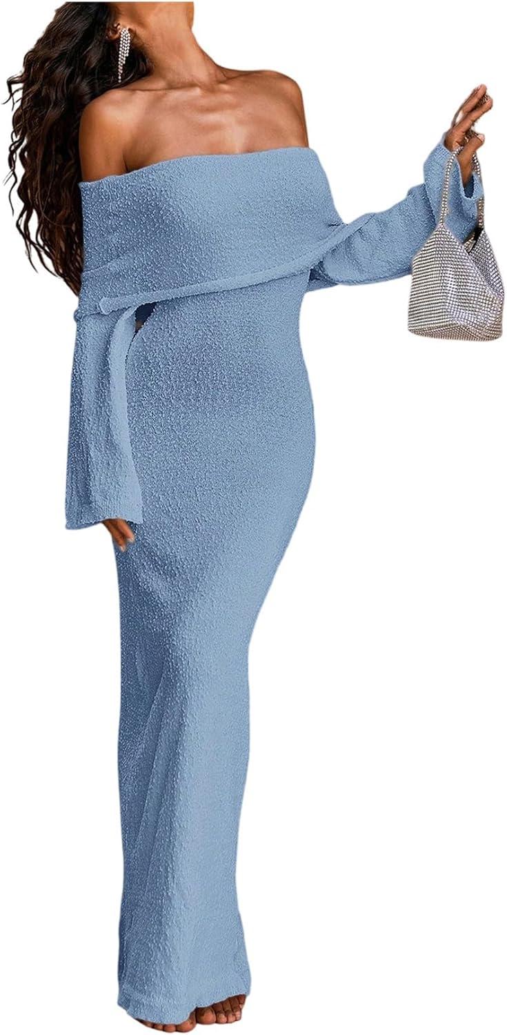 SOLY HUX Women’s Off The Shoulder Long Sleeve Sweater Dress Party Formal Bodycon Maxi Dresses(Plain Blue)