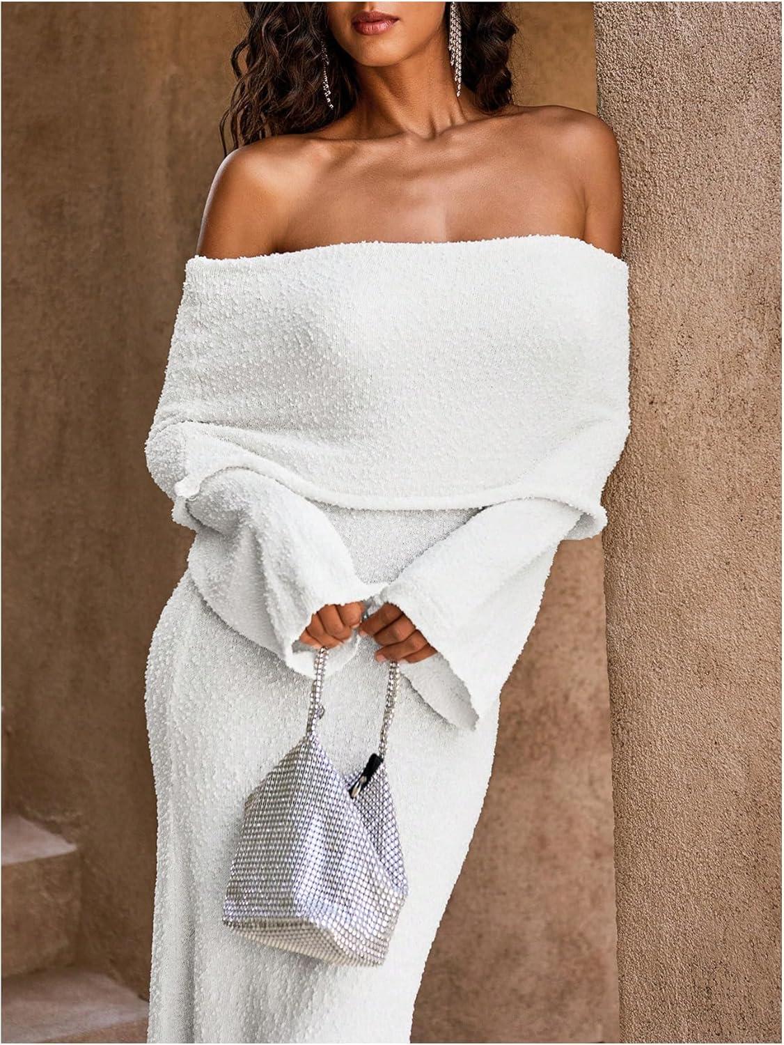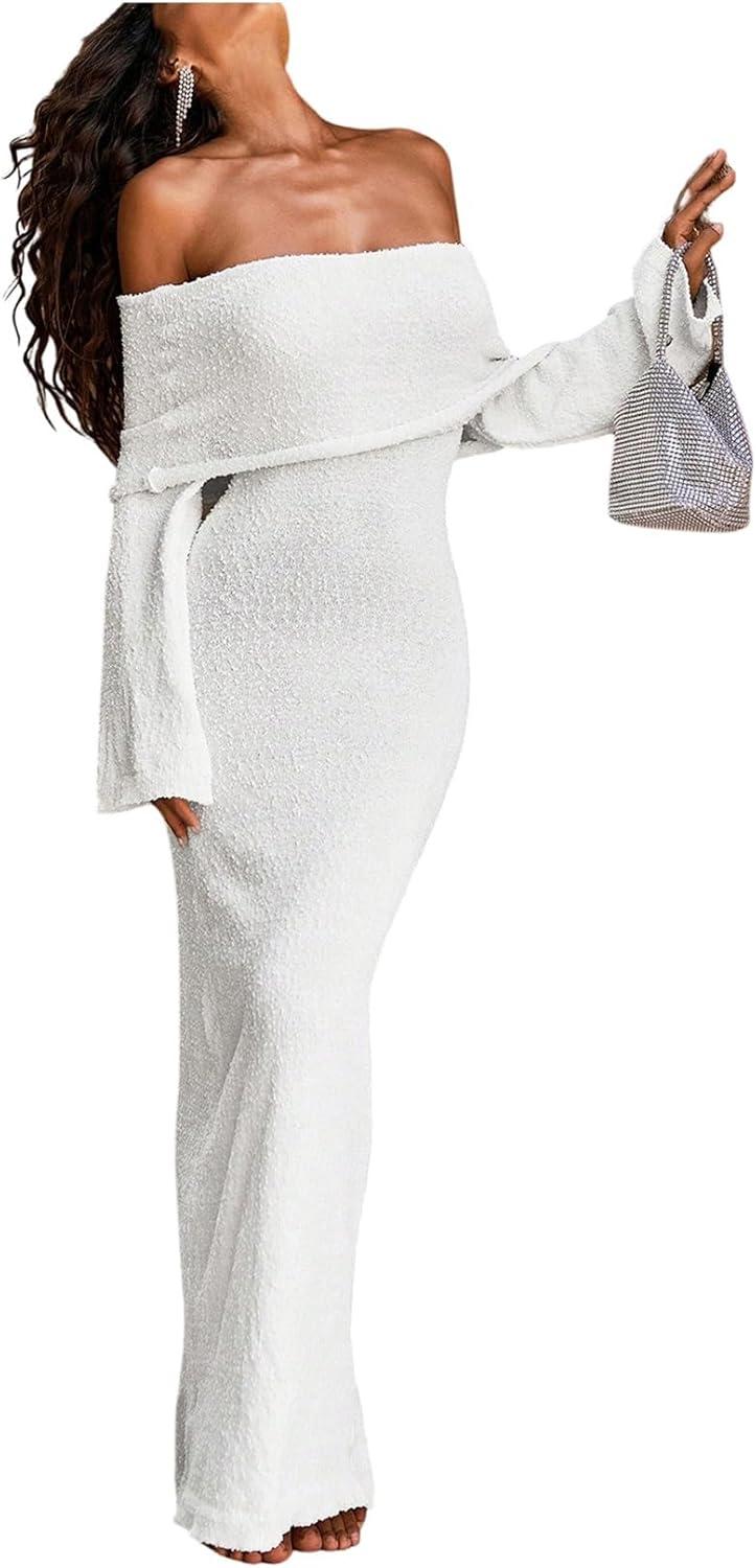 SOLY HUX Women’s Off The Shoulder Long Sleeve Sweater Dress Party Formal Bodycon Maxi Dresses(Plain White)