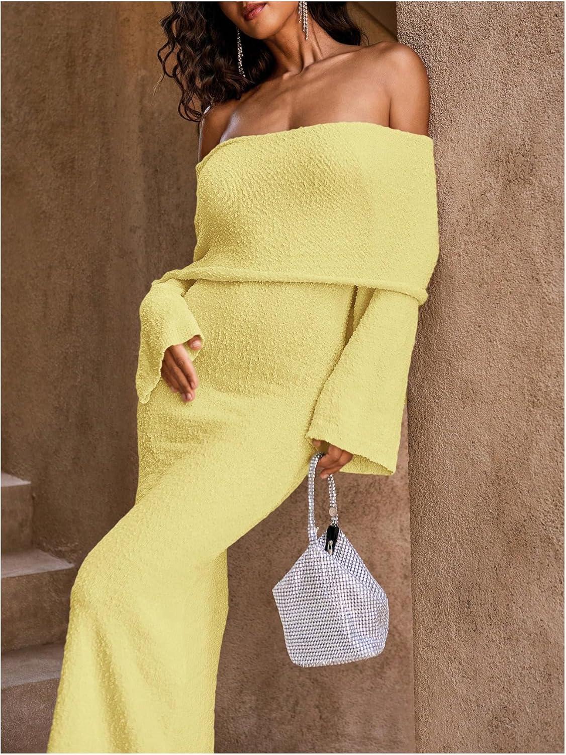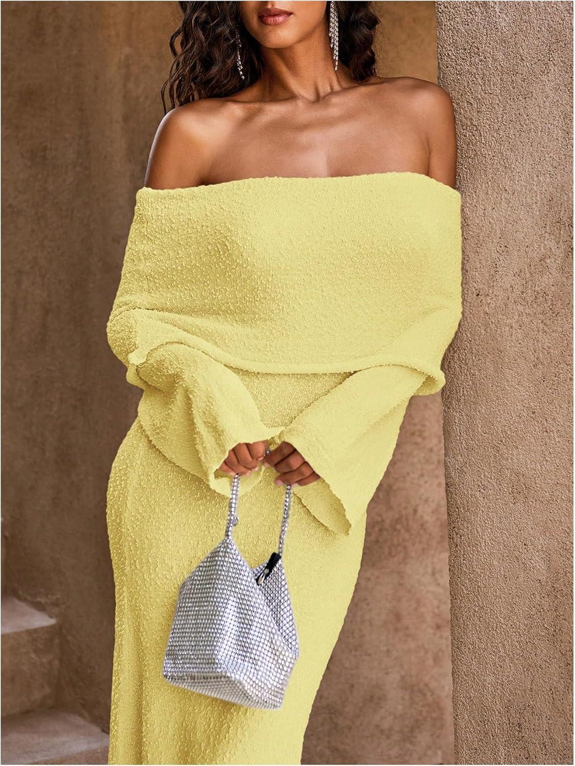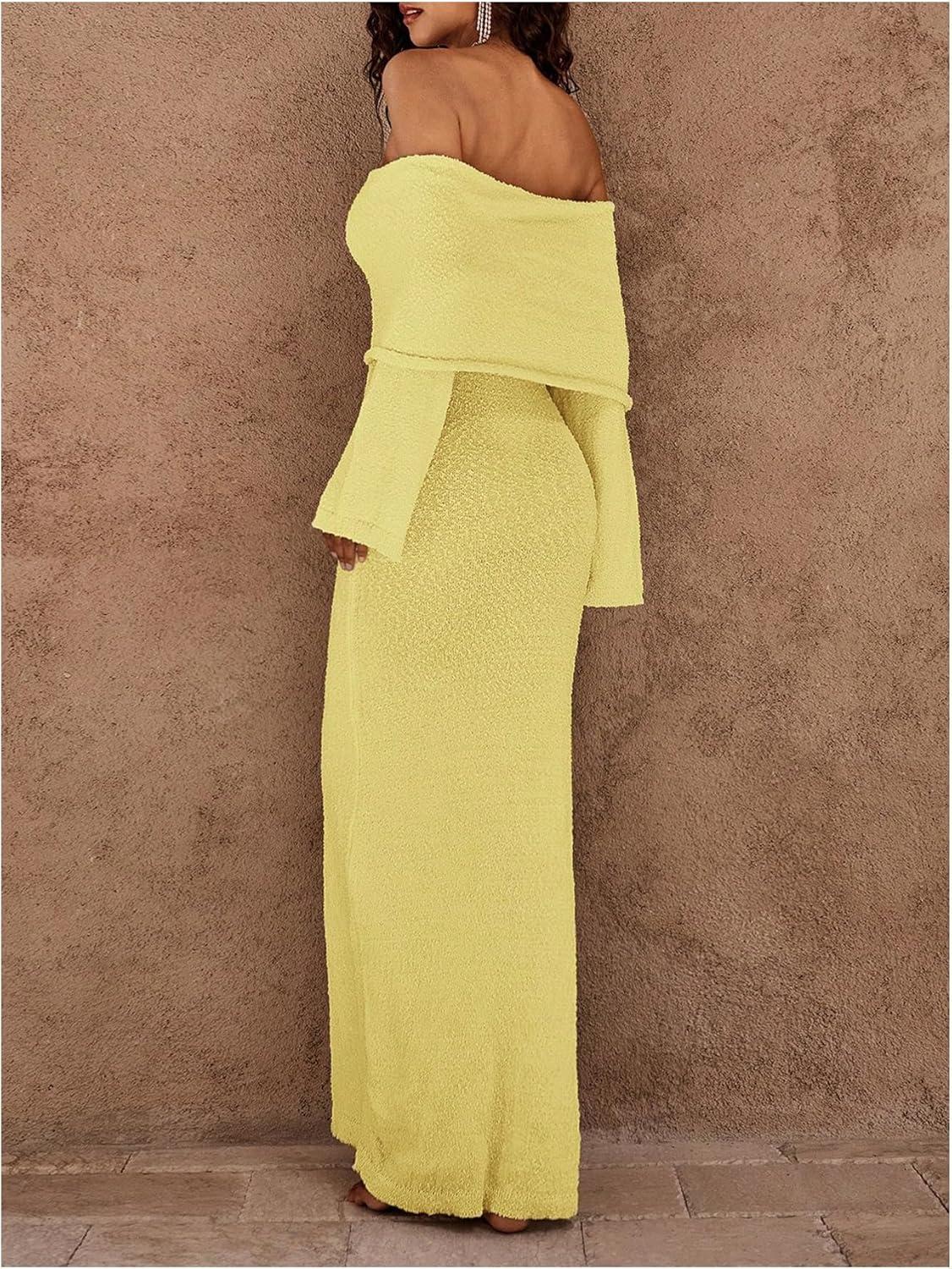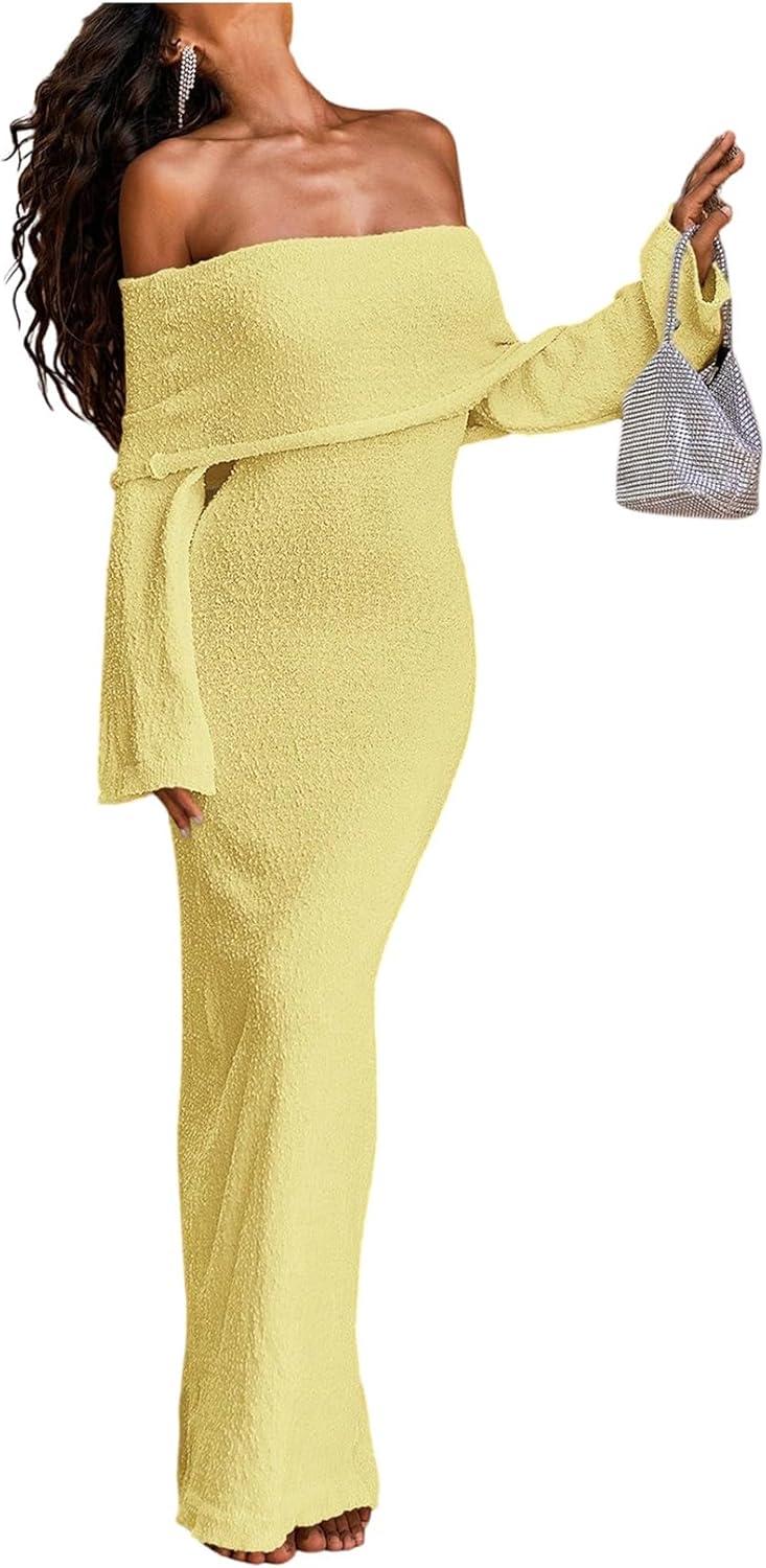 SOLY HUX Women’s Off The Shoulder Long Sleeve Sweater Dress Party Formal Bodycon Maxi Dresses(Plain Yellow)