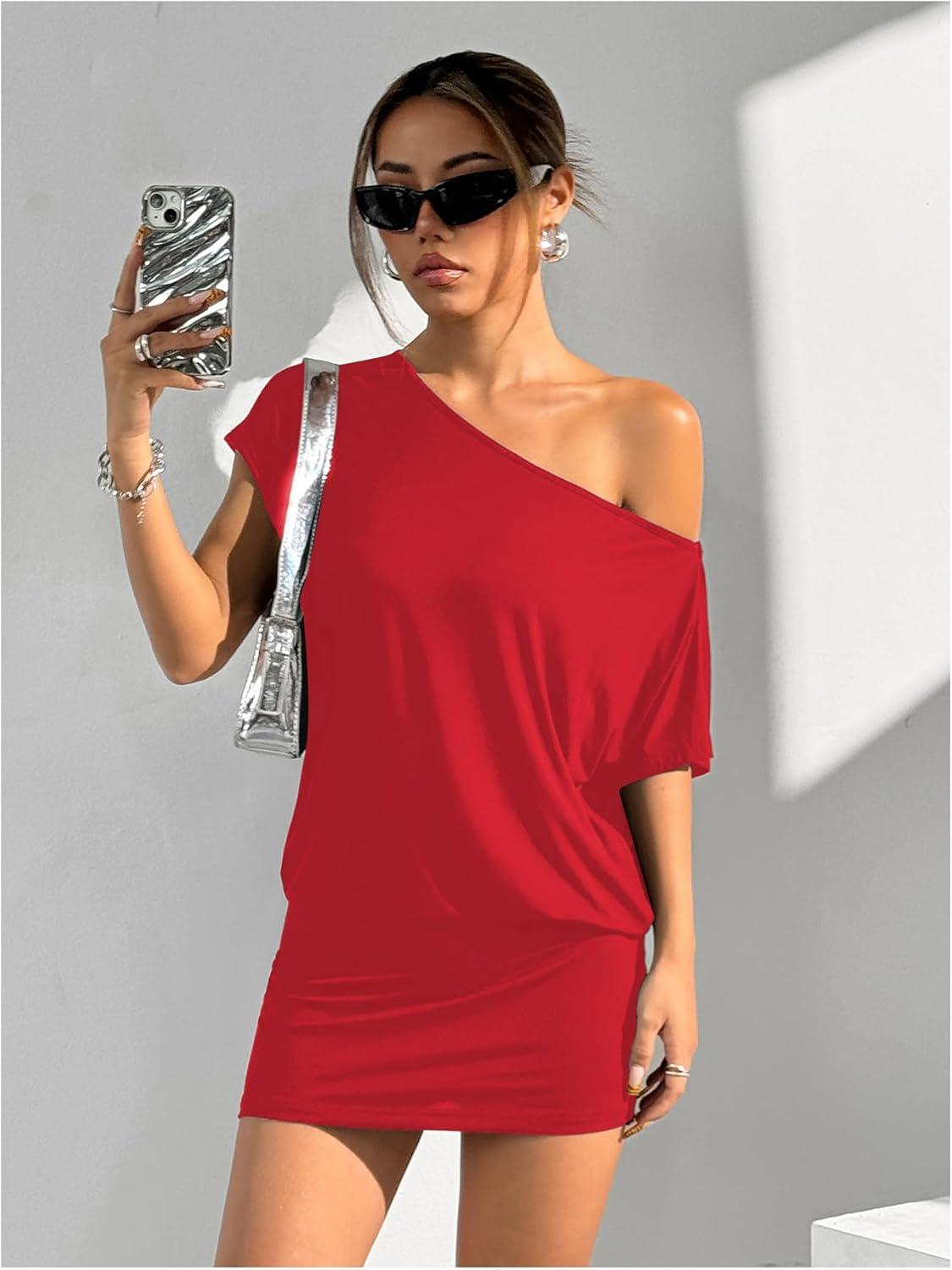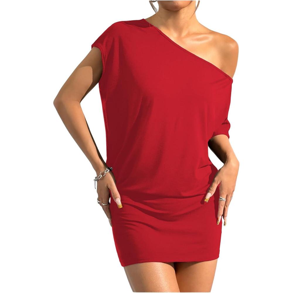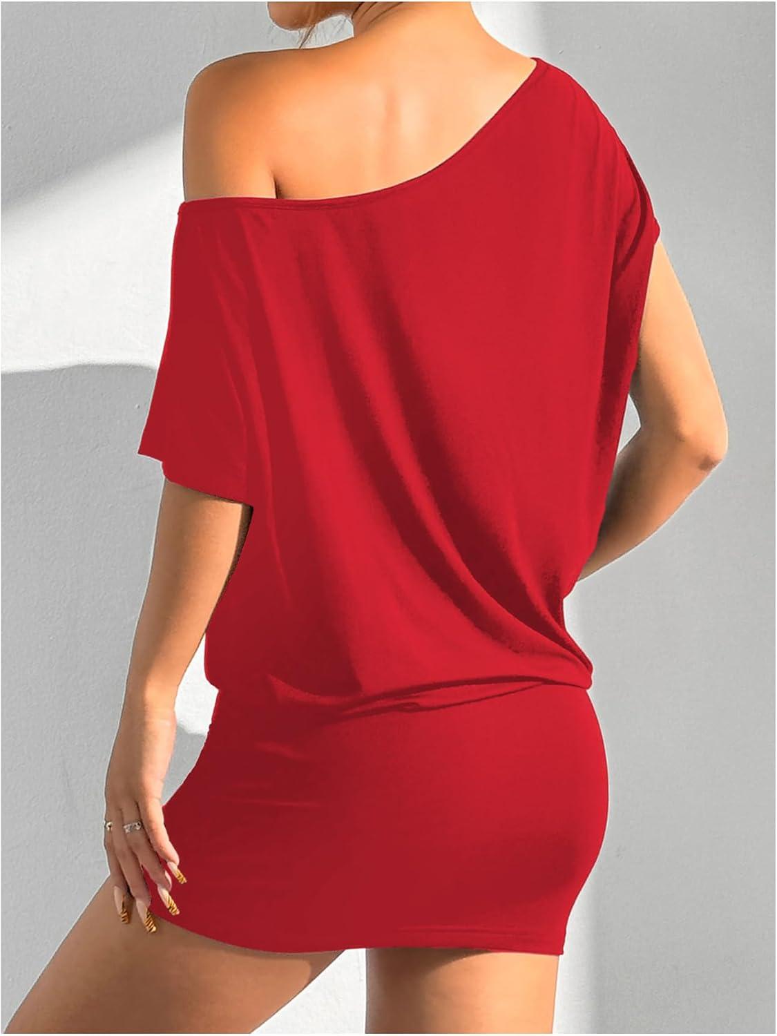 SOLY HUX Women’s Off The Shoulder Mini Dress Asymmetrical Neck Short Sleeve Casual Bodycon T Shirt Dresses(Plain Red)