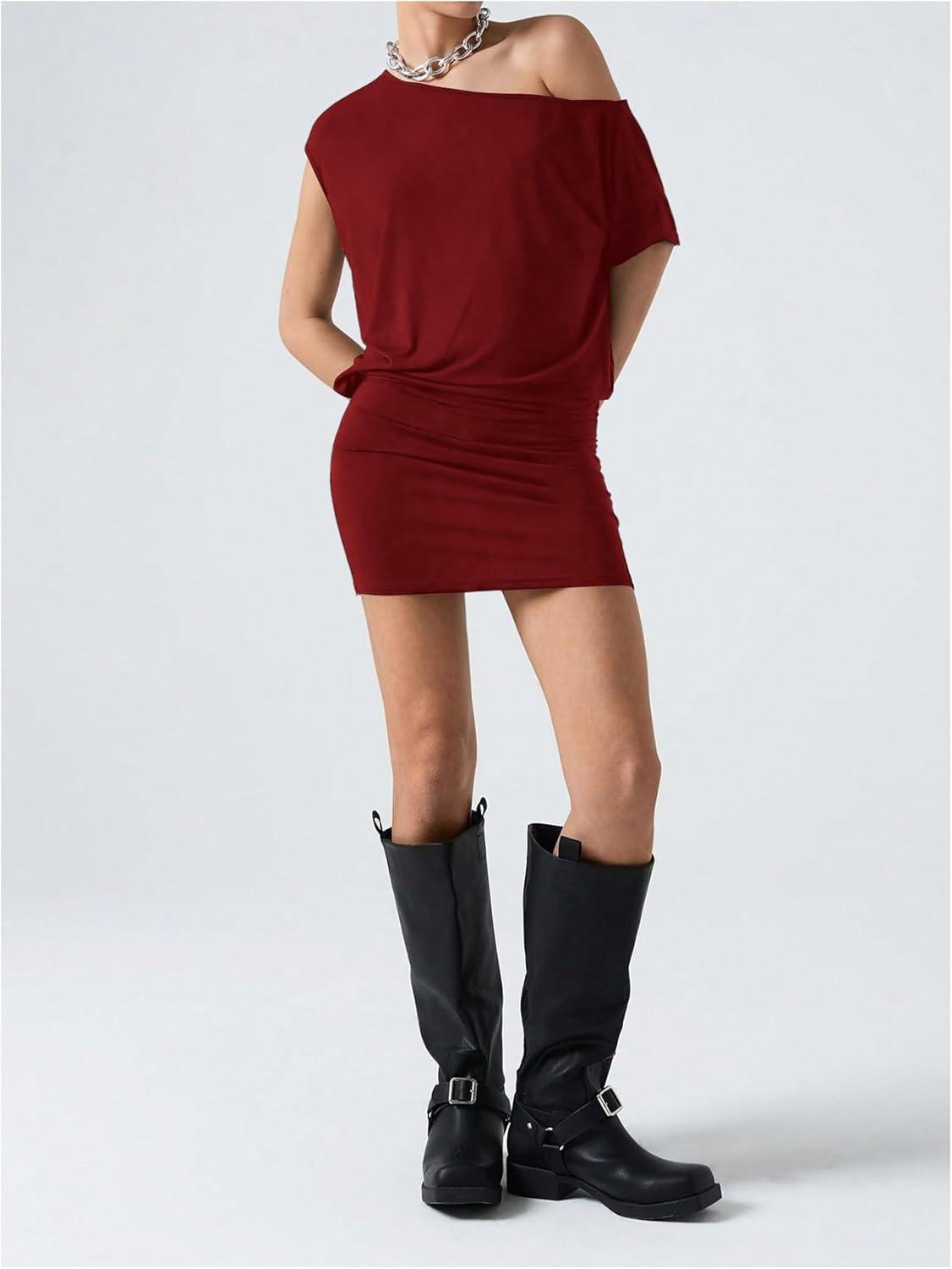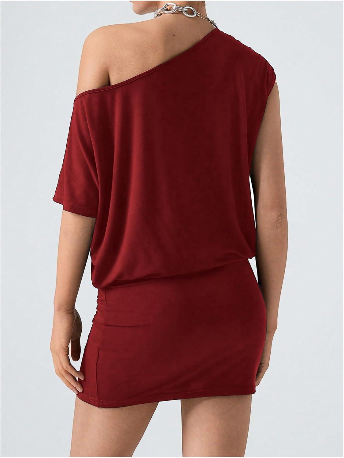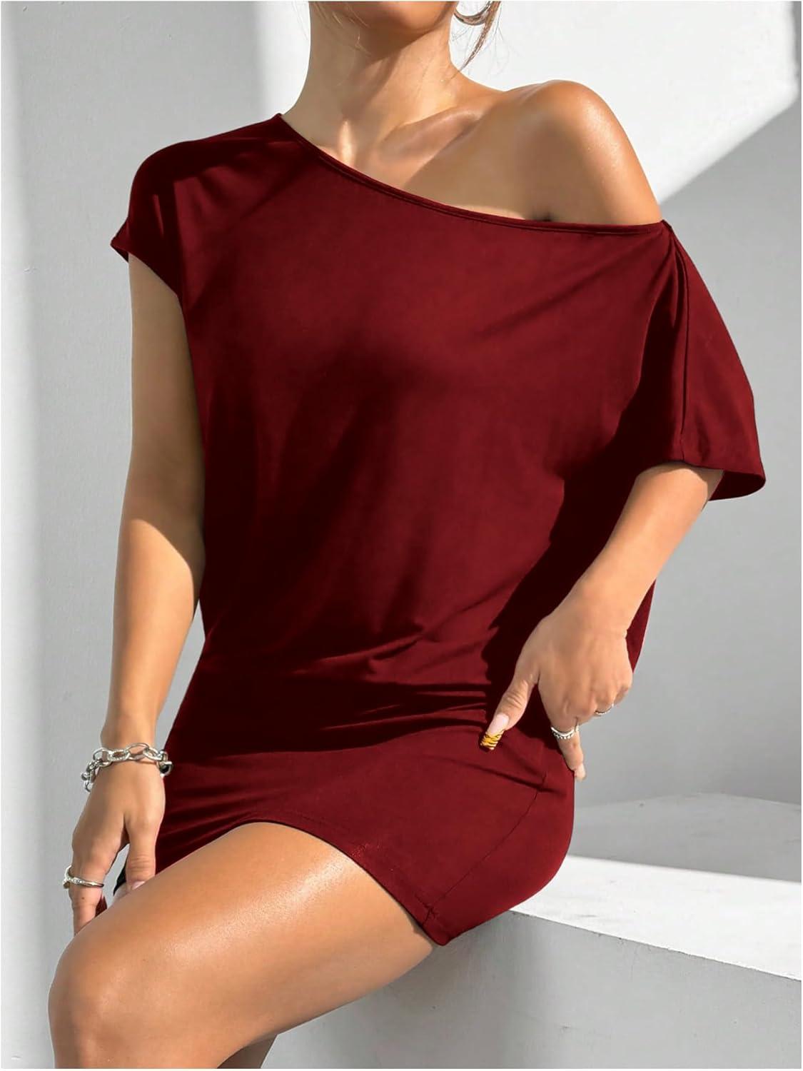 SOLY HUX Women’s Off The Shoulder Mini Dress Going Out Asymmetrical Neck Short Sleeve Casual Bodycon T Shirt Dresses(Plain Burgundy)