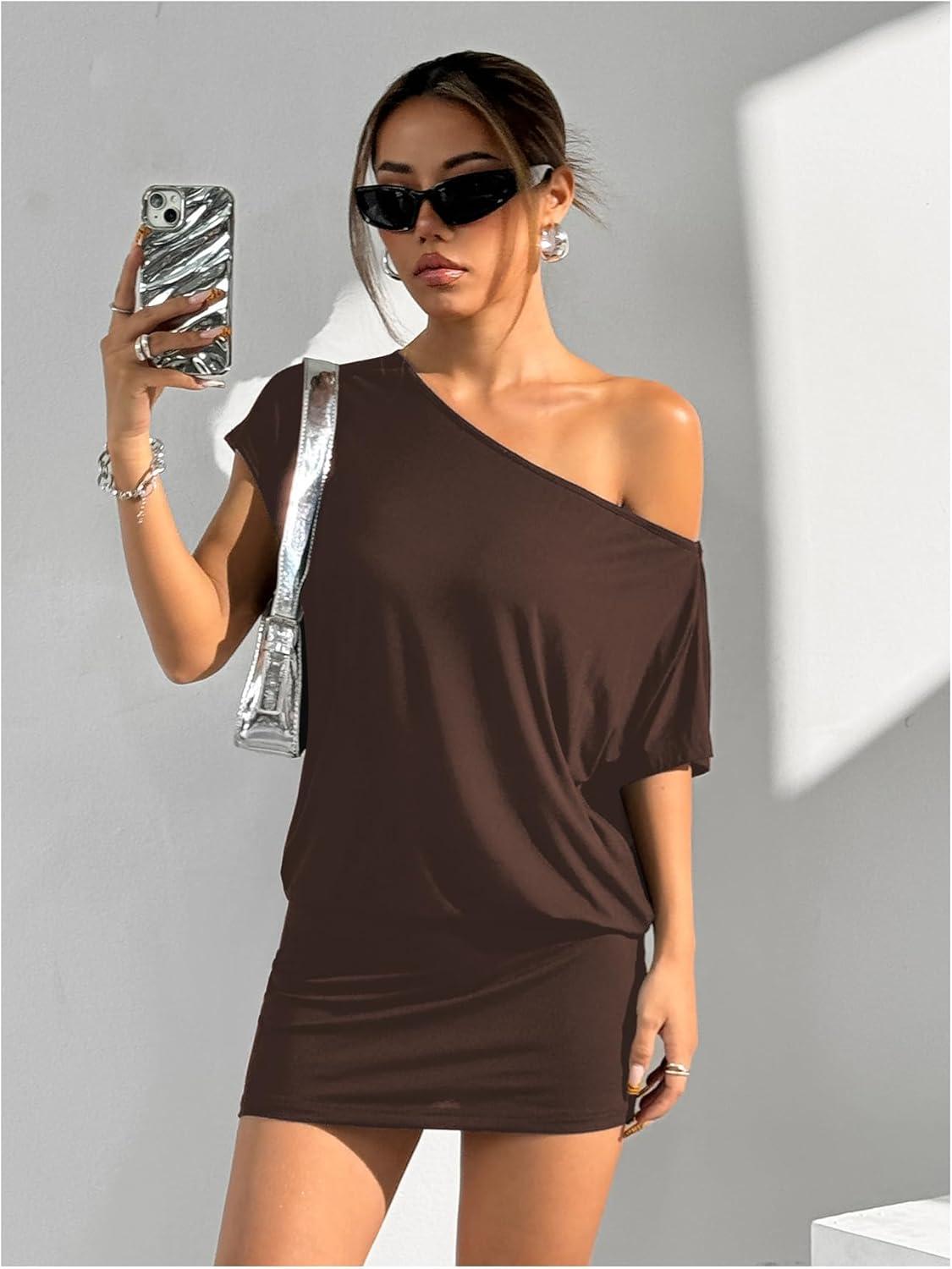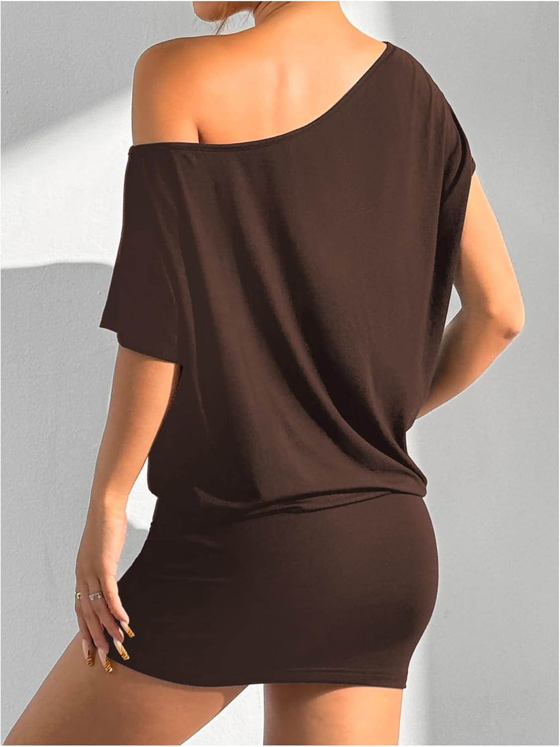 SOLY HUX Women’s Off The Shoulder Mini Dress Going Out Asymmetrical Neck Short Sleeve Casual Bodycon T Shirt Dresses(Plain Coffee Brown)