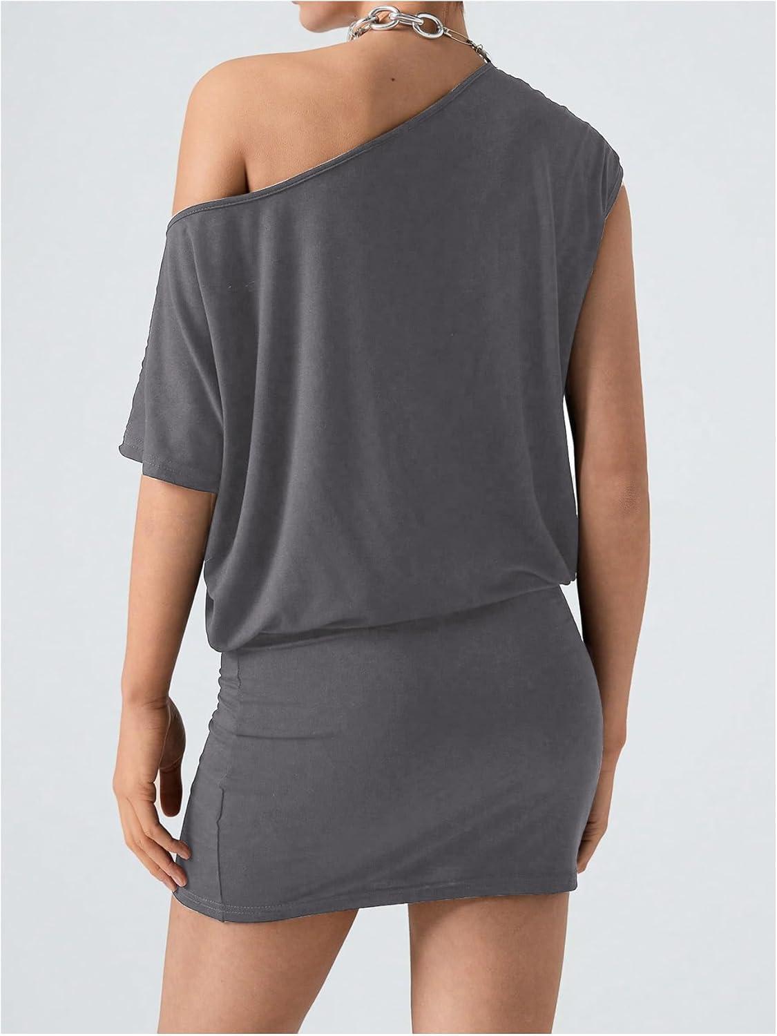 SOLY HUX Women’s Off The Shoulder Mini Dress Going Out Asymmetrical Neck Short Sleeve Casual Bodycon T Shirt Dresses(Plain Grey)