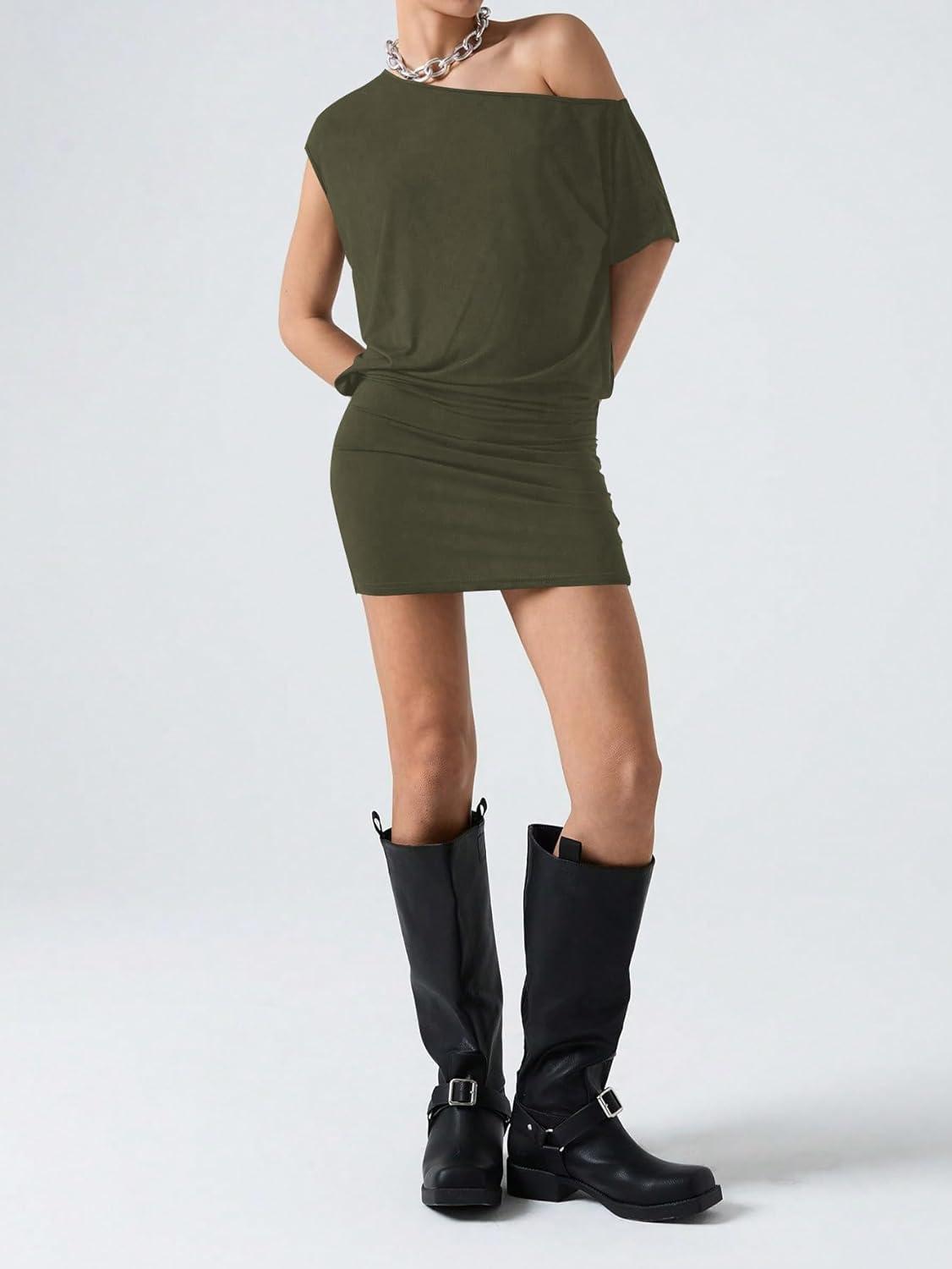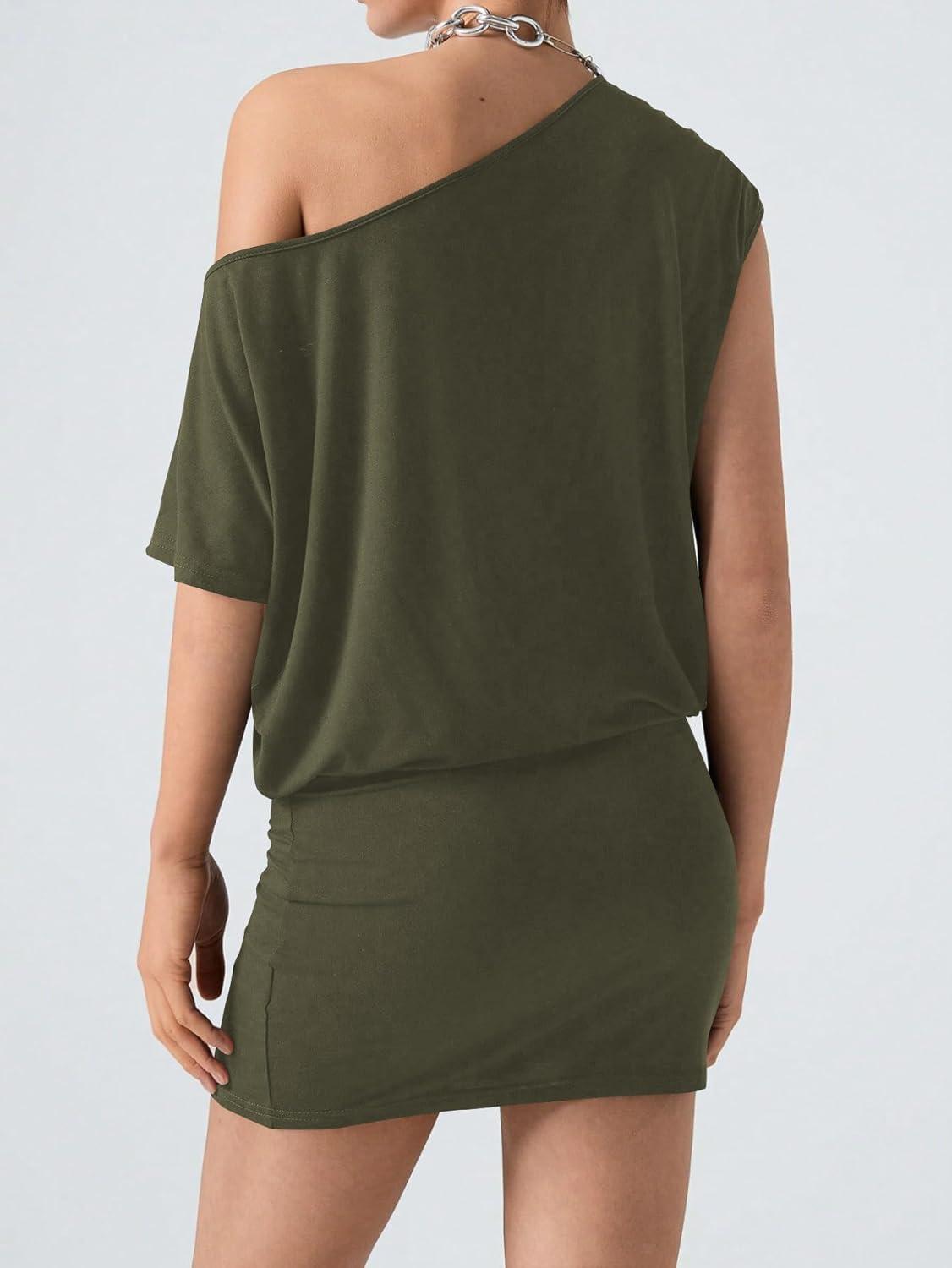SOLY HUX Women’s Off The Shoulder Mini Dress Going Out Asymmetrical Neck Short Sleeve Casual Bodycon T Shirt Dresses(Pure Army Green)