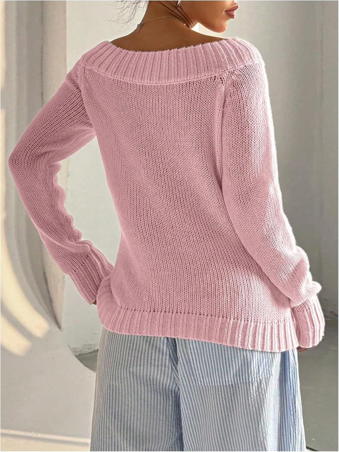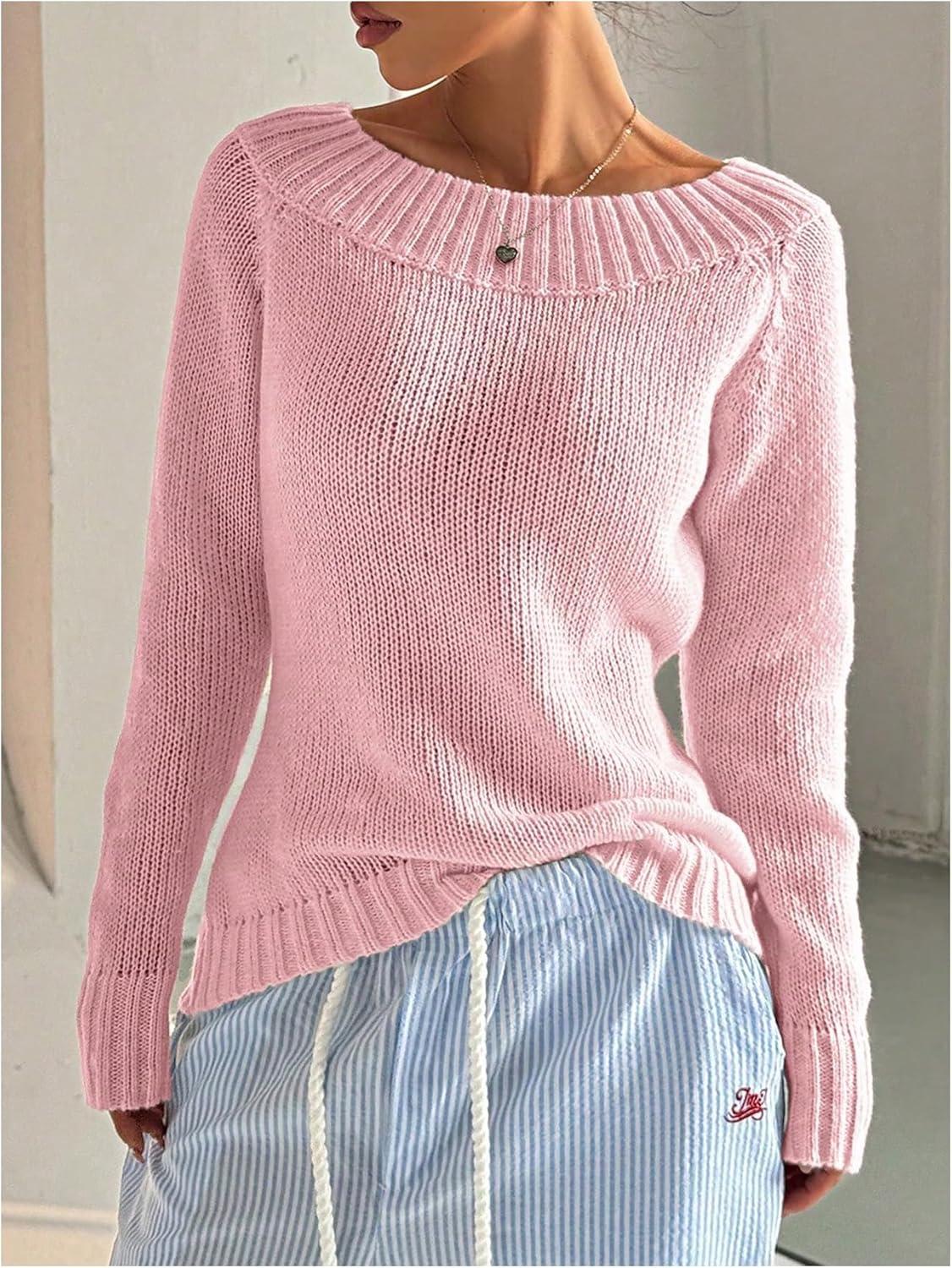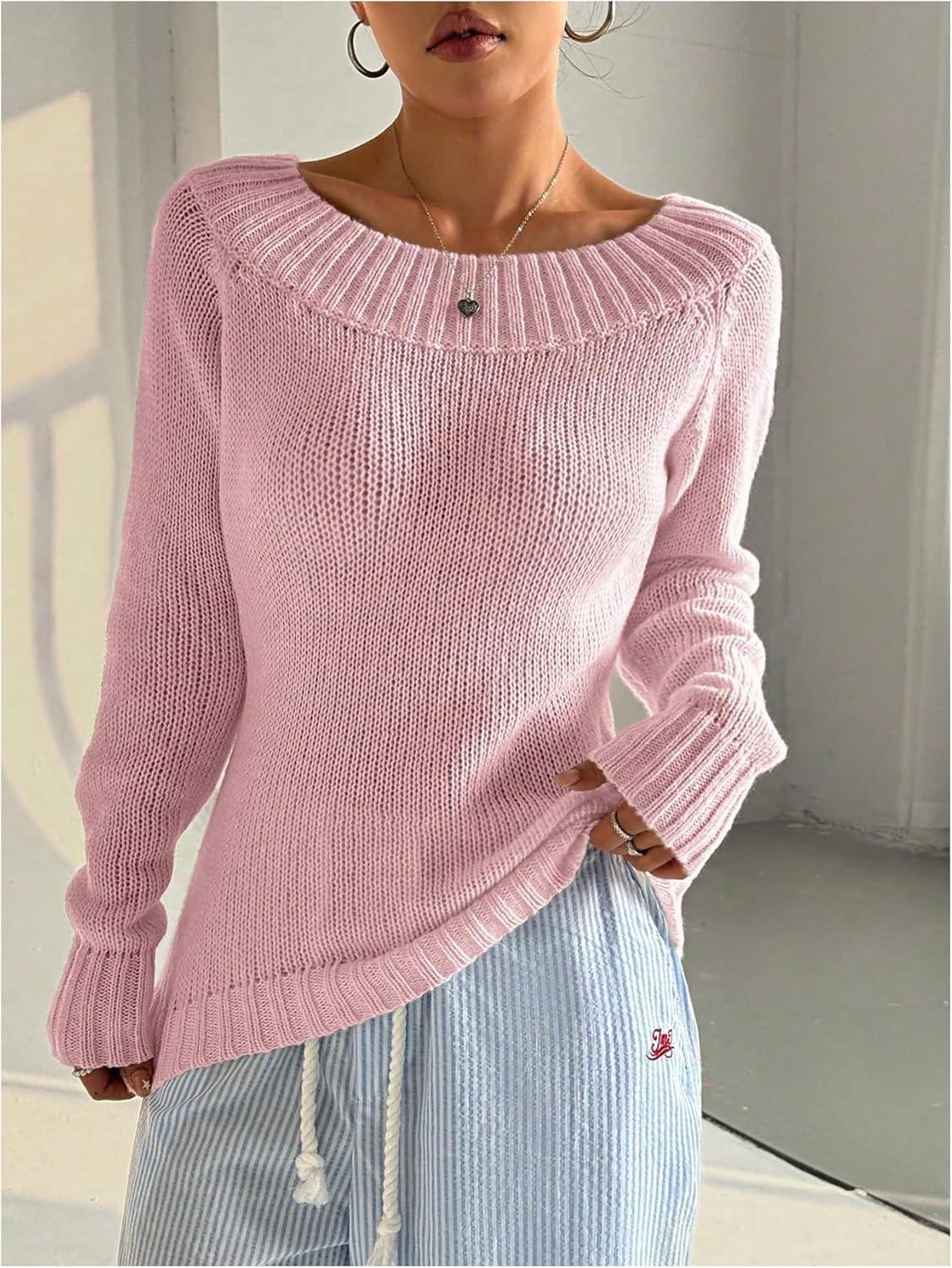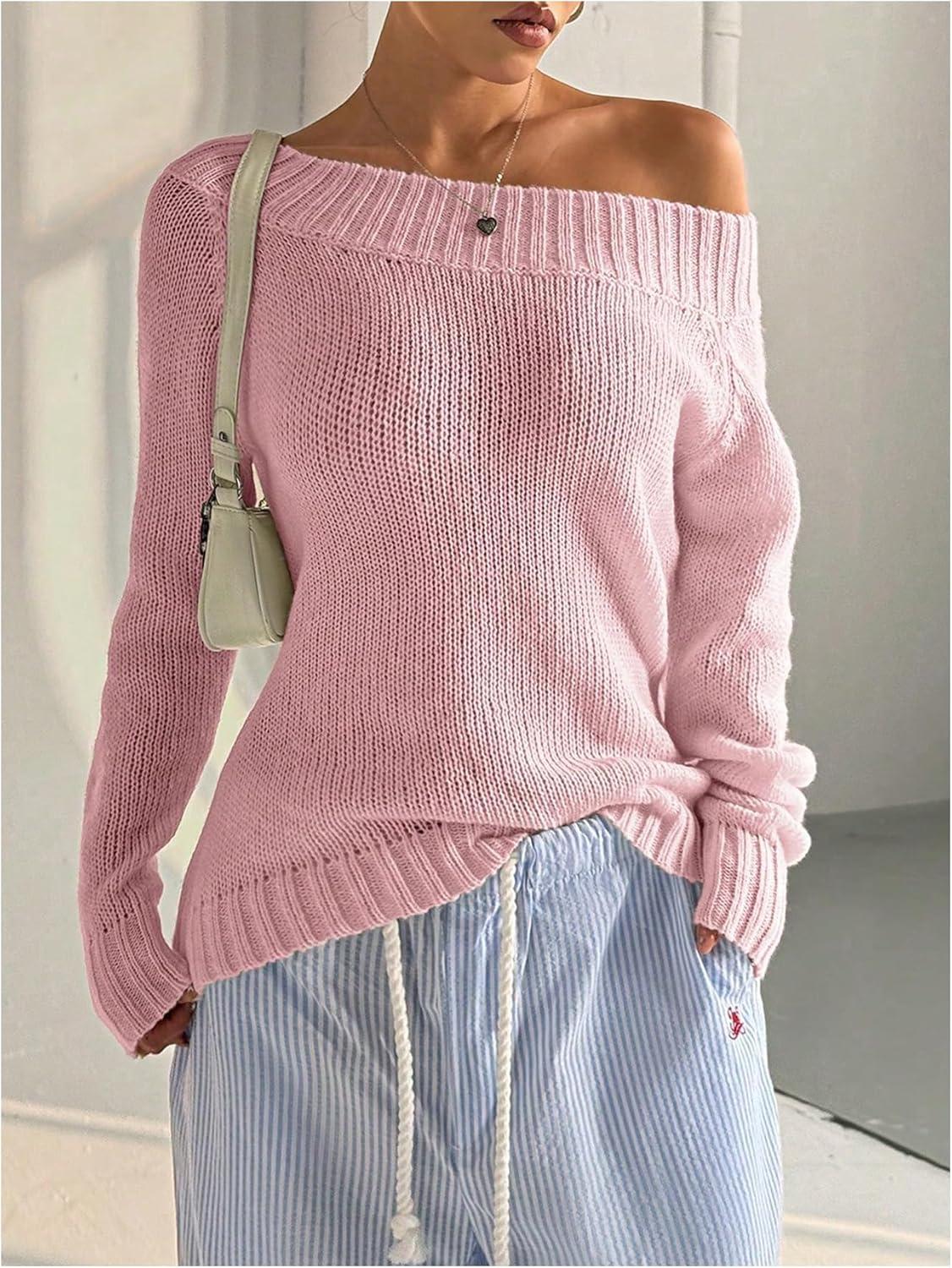 SOLY HUX Women’s Off The Shoulder Sweater Boat Neck Knit Top Pullover Fall Clothes(Plain Pink)