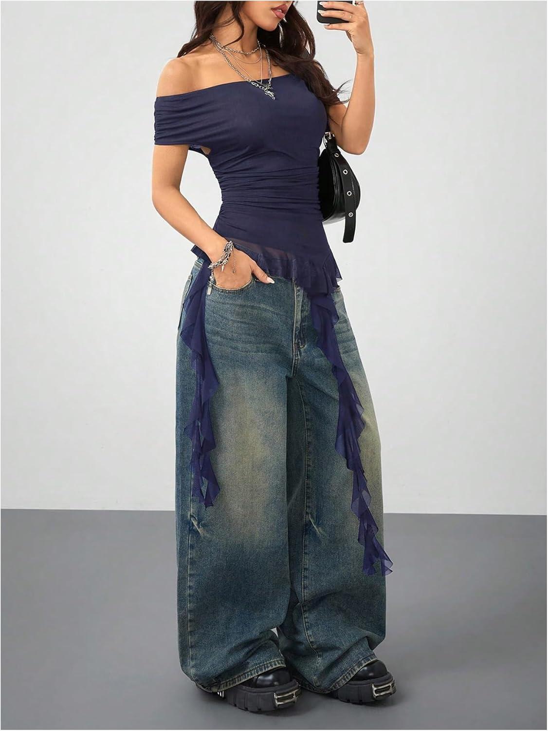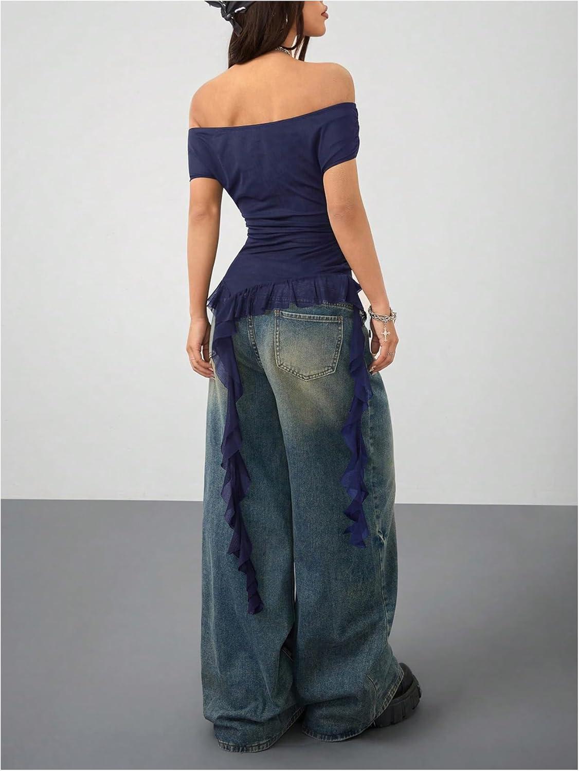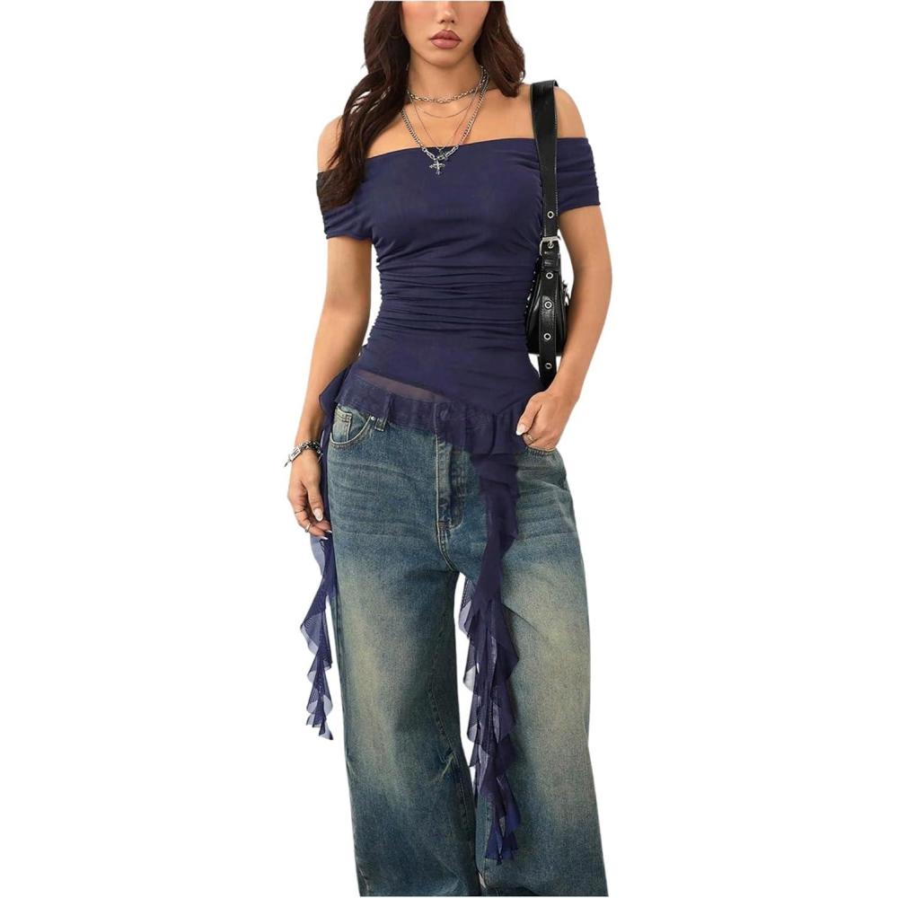 SOLY HUX Women’s Off The Shoulder T Shirt Cap Sleeve Ruffle Asymmetrical Hem Ruched Tee Y2k Summer Tops(Plain Dark Blue)