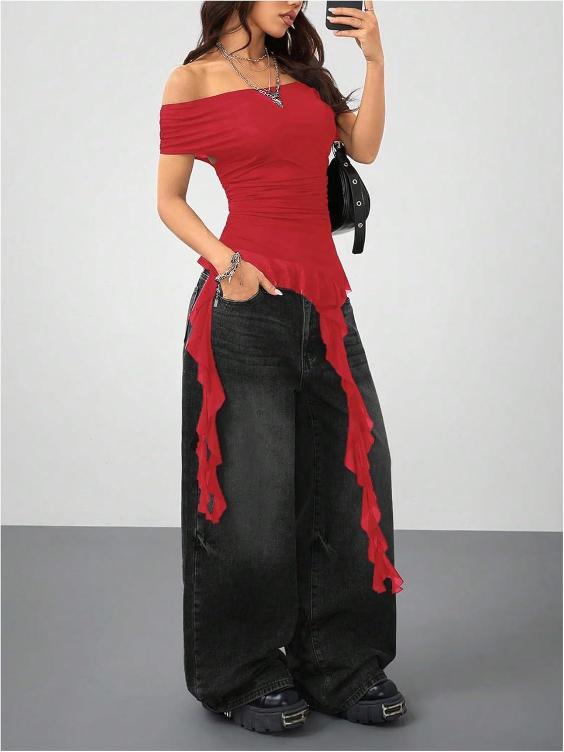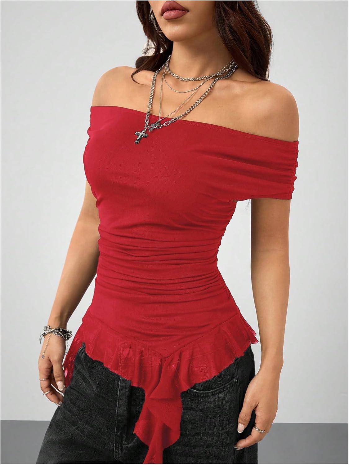 SOLY HUX Women’s Off The Shoulder T Shirt Cap Sleeve Ruffle Asymmetrical Hem Ruched Tee Y2k Summer Tops(Plain Red)