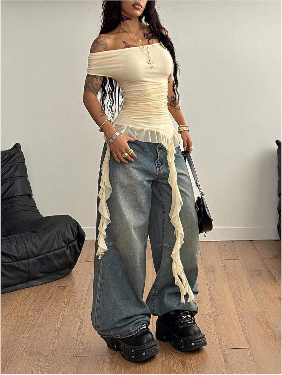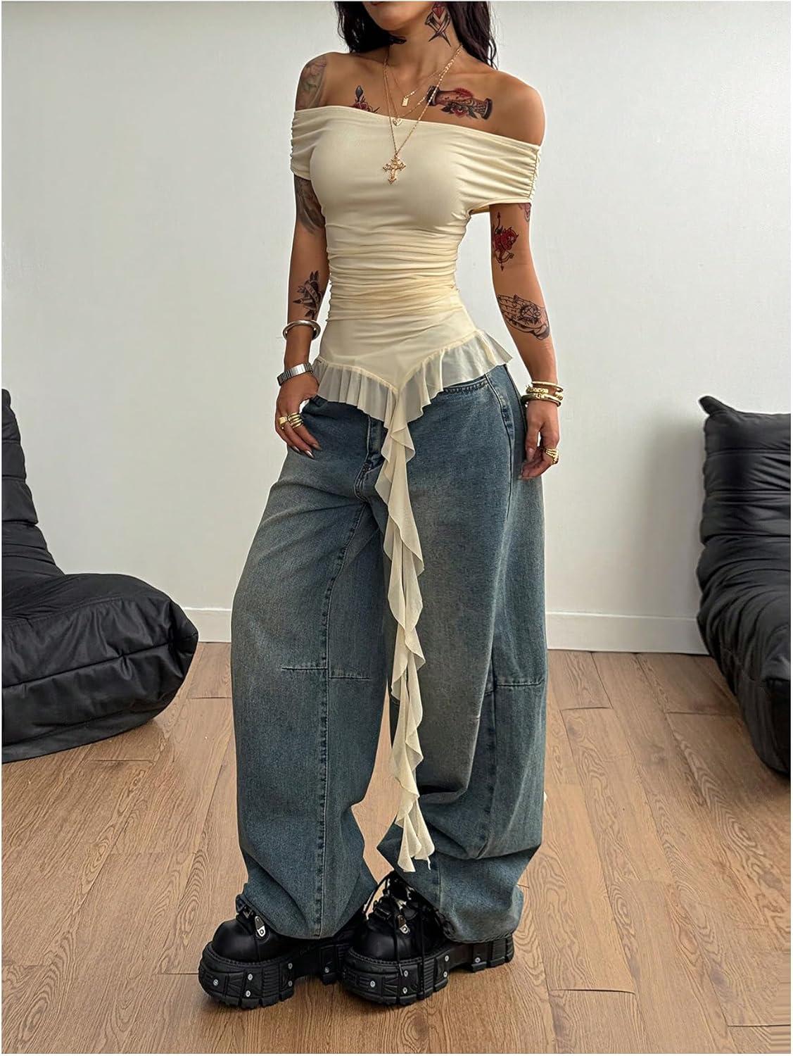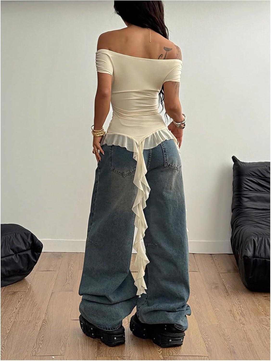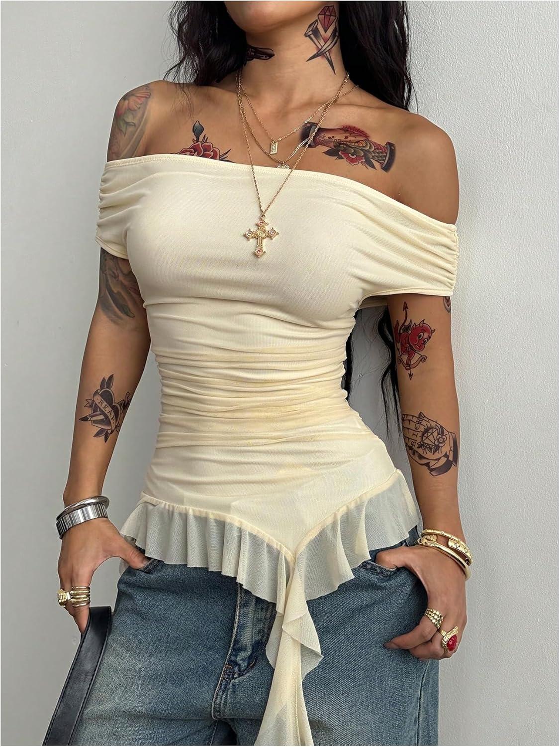 SOLY HUX Women’s Off The Shoulder T Shirt Cap Sleeve Ruffle Asymmetrical Hem Ruched Tee Y2k Summer Tops(Pure Apricot)
