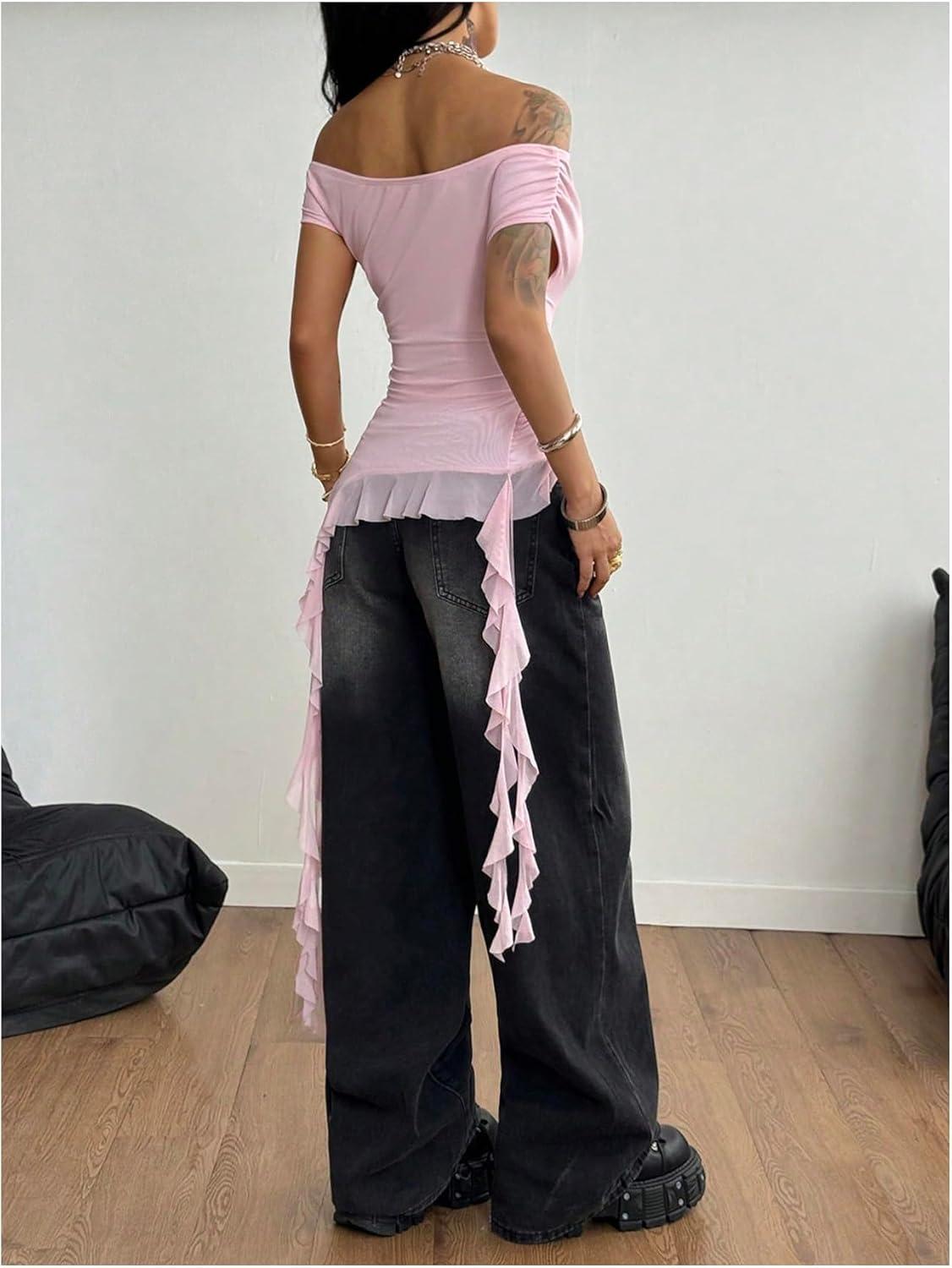 SOLY HUX Women’s Off The Shoulder T Shirt Cap Sleeve Ruffle Asymmetrical Hem Ruched Tee Y2k Summer Tops(Pure Light Pink)