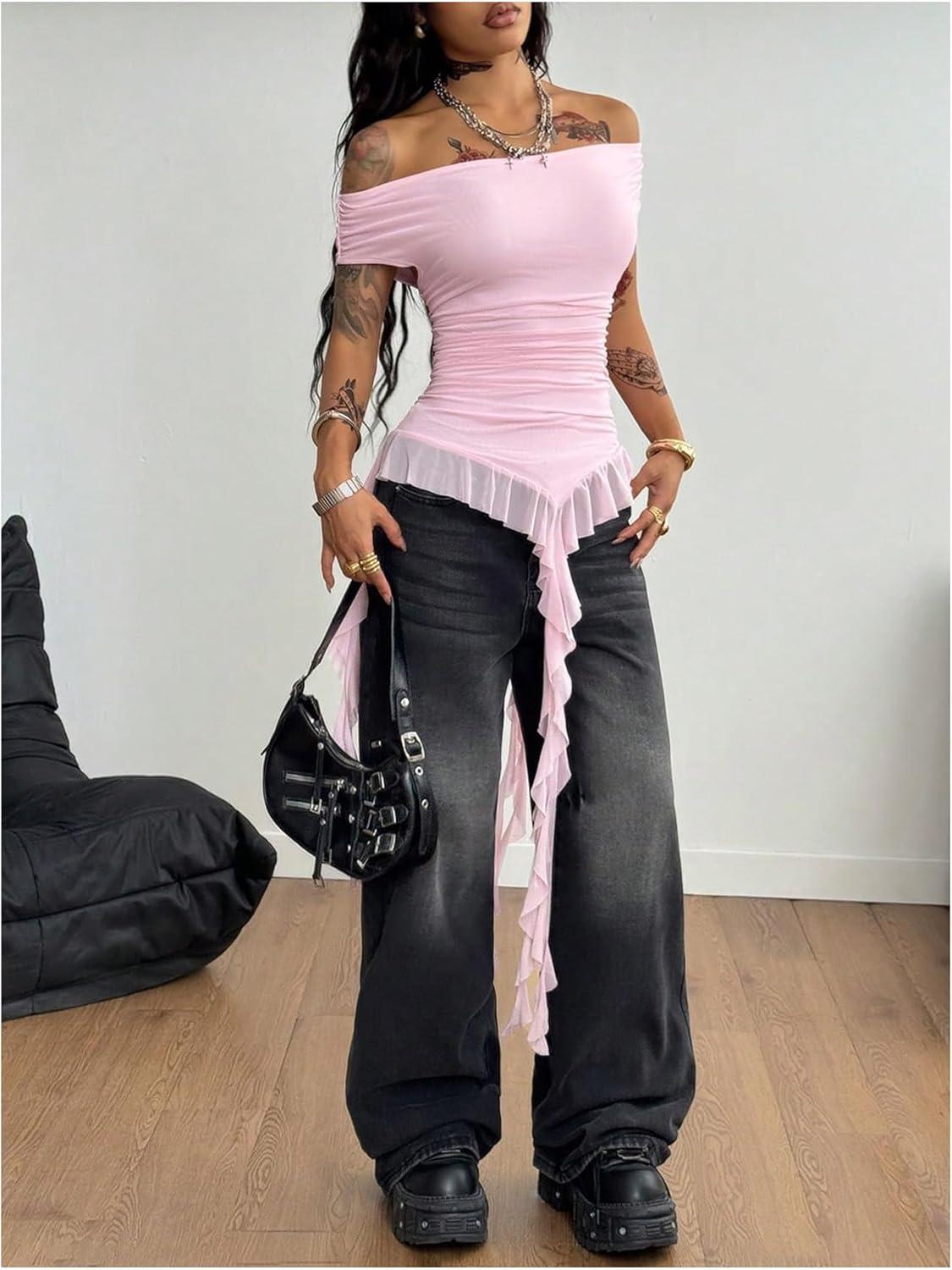 Our holiday sale features the best deals on SOLY HUX Women’s Off The Shoulder T Shirt Cap Sleeve Ruffle Asymmetrical Hem Ruched Tee Y2k Summer Tops(Pure Light Pink) and accessories. Shop now and save!