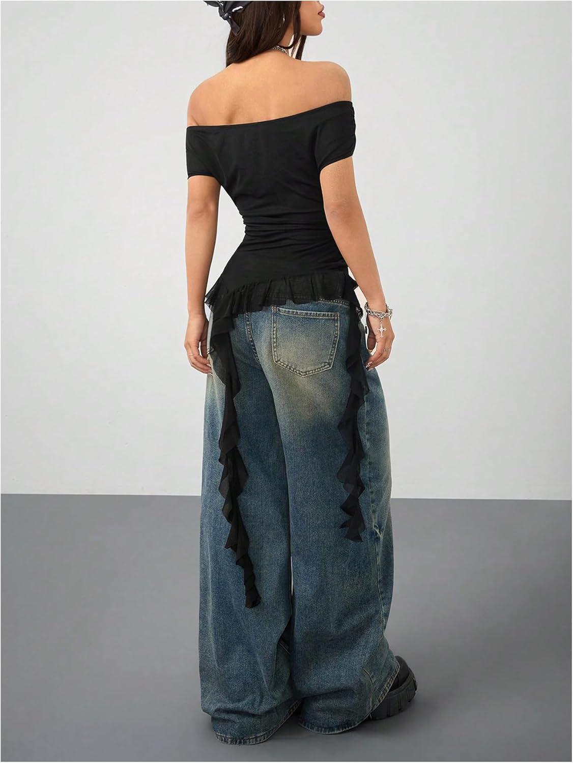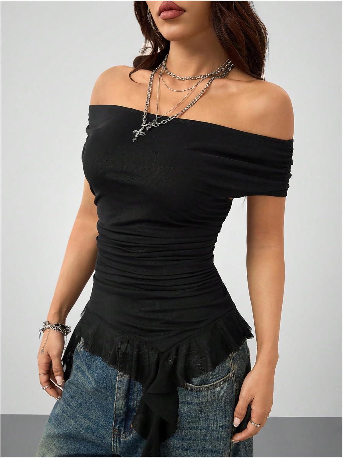 SOLY HUX Women’s Off The Shoulder T Shirt Cap Sleeve Ruffle Asymmetrical Hem Ruched Tee Y2k Summer Tops(Solid Black)