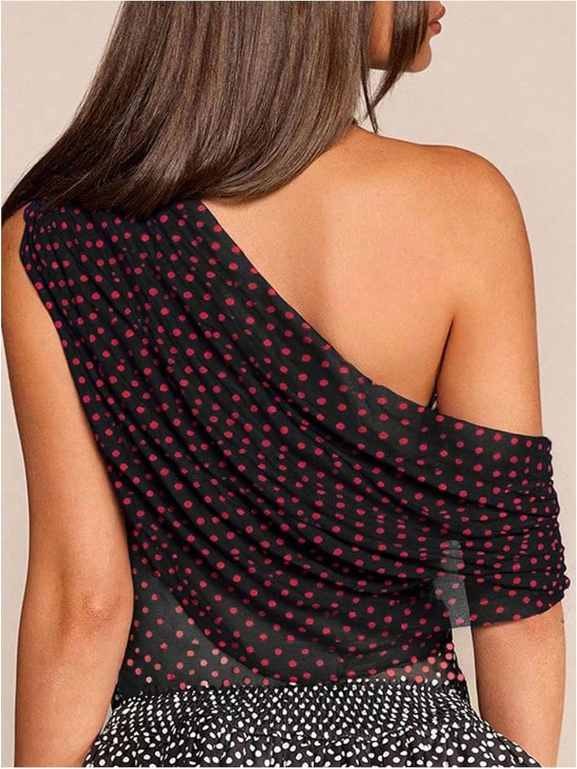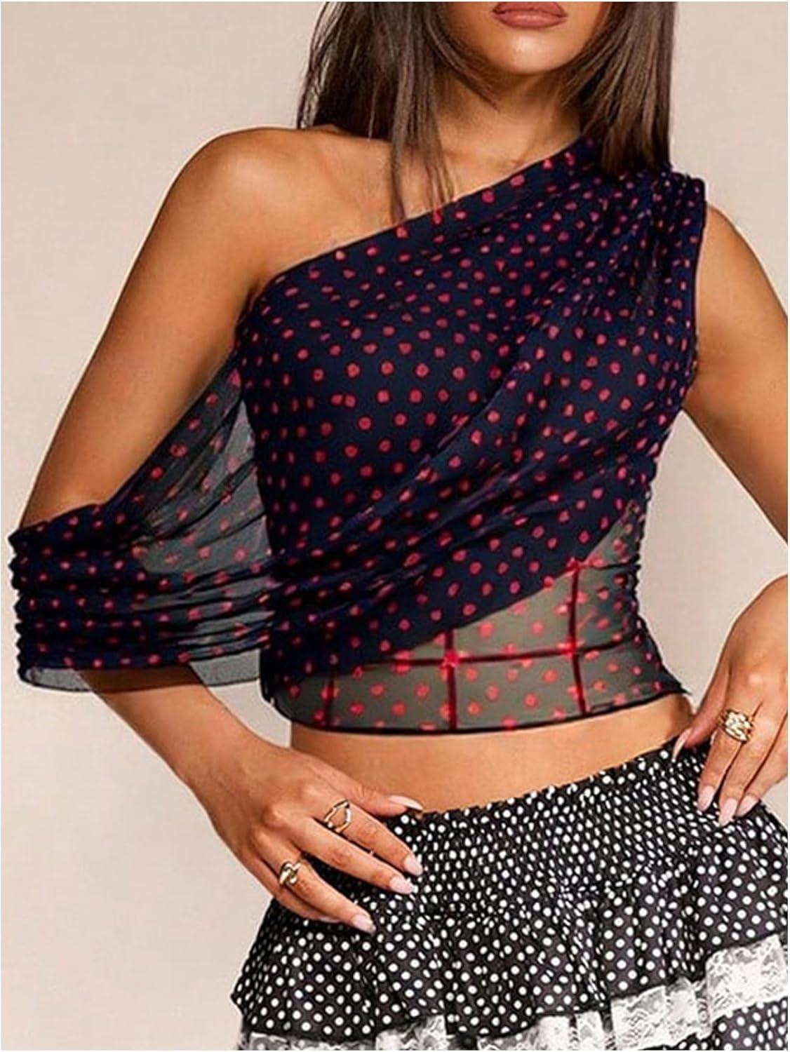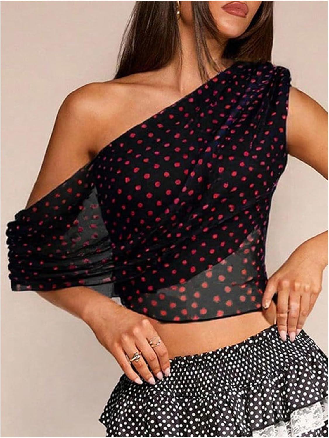 SOLY HUX Women’s Off The Shoulder Tops Polka Dots Mesh See Through Crop Tank Shirts Aesthetic Clothes(Red and White)