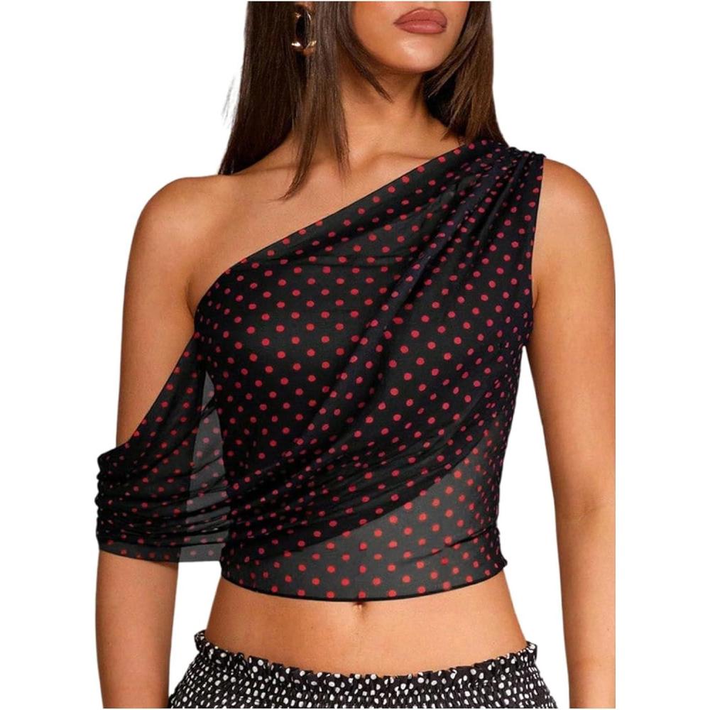 SOLY HUX Women’s Off The Shoulder Tops Polka Dots Mesh See Through Crop Tank Shirts Aesthetic Clothes(Black and Red)