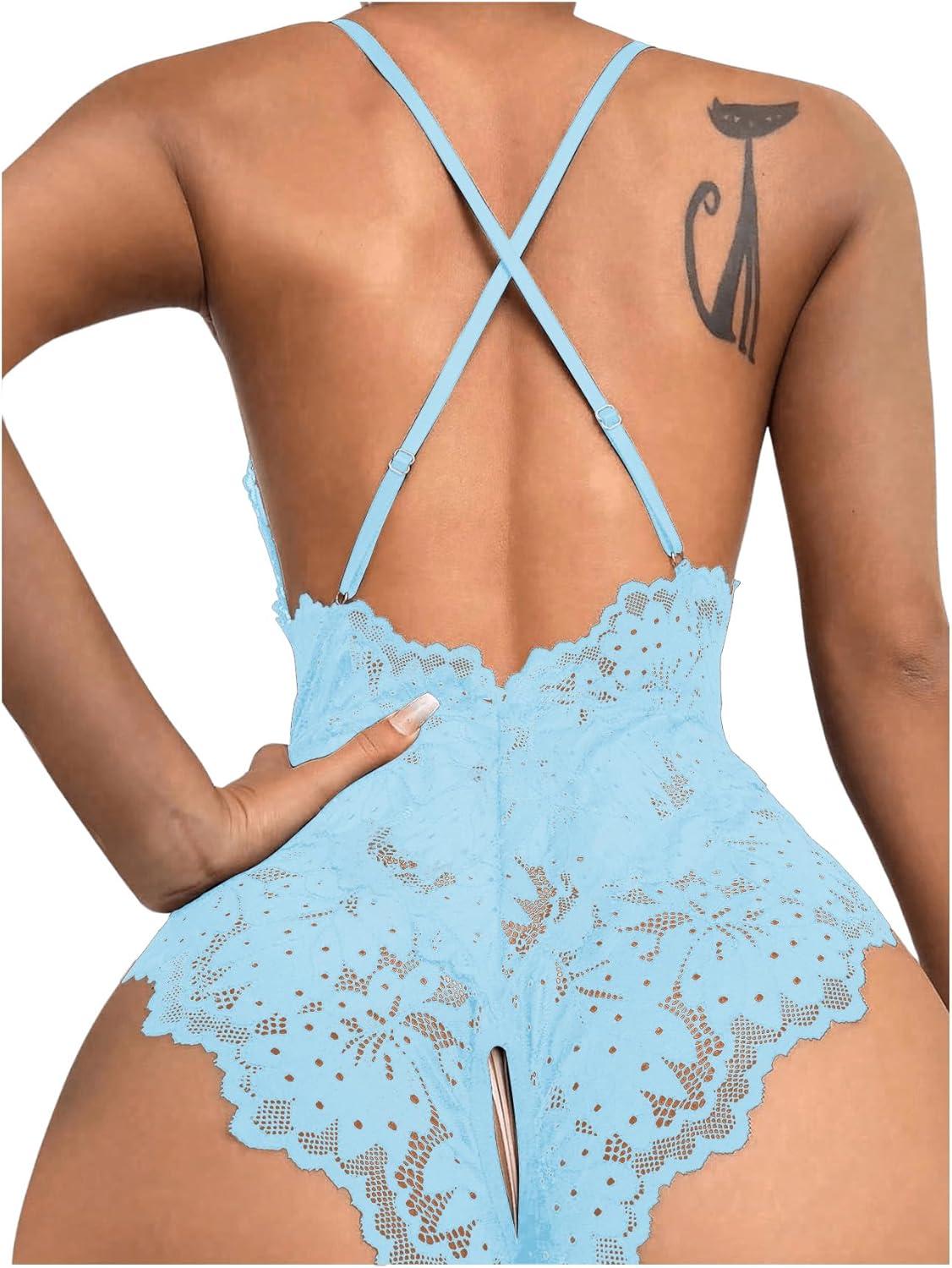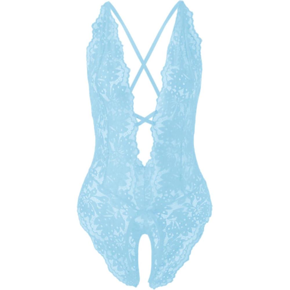 SOLY HUX Women’s One Piece Lingerie Sexy Lace Babydoll Deep V Teddy Criss Cross Backless Teddy Mini Bodysuit(Light Blue)