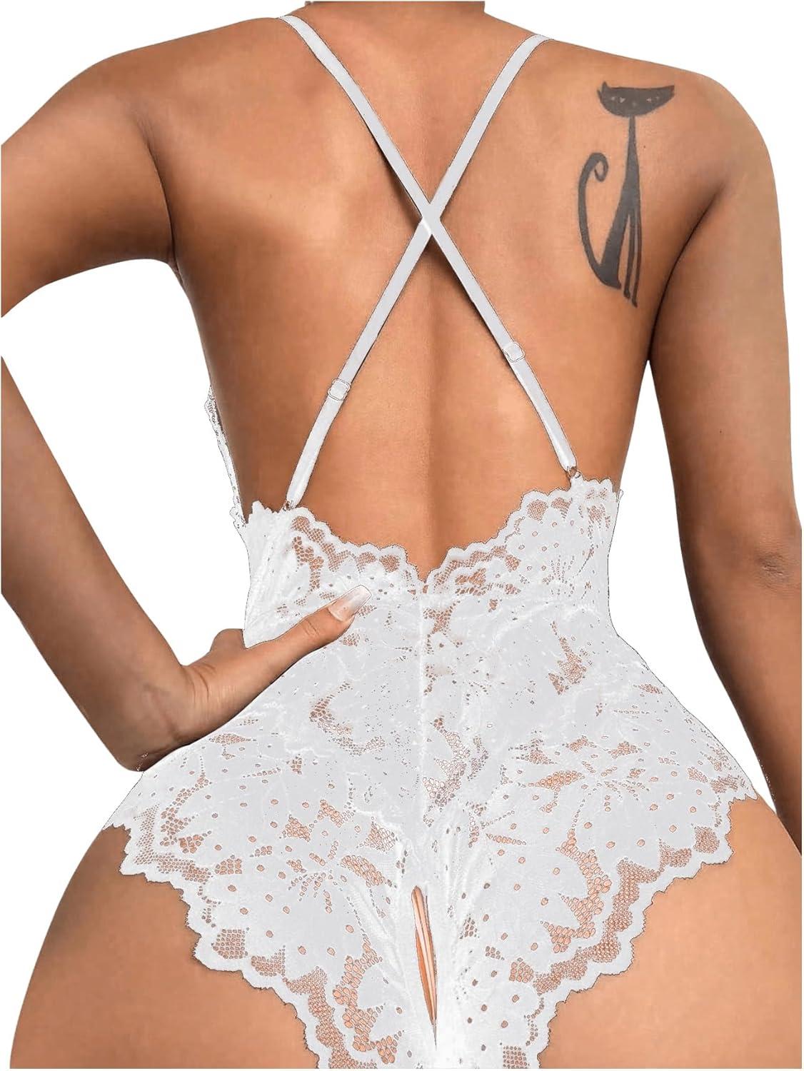 SOLY HUX Women’s One Piece Lingerie Sexy Lace Babydoll Deep V Teddy Criss Cross Backless Teddy Mini Bodysuit(Pure White)