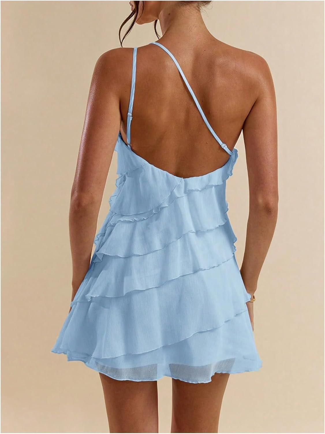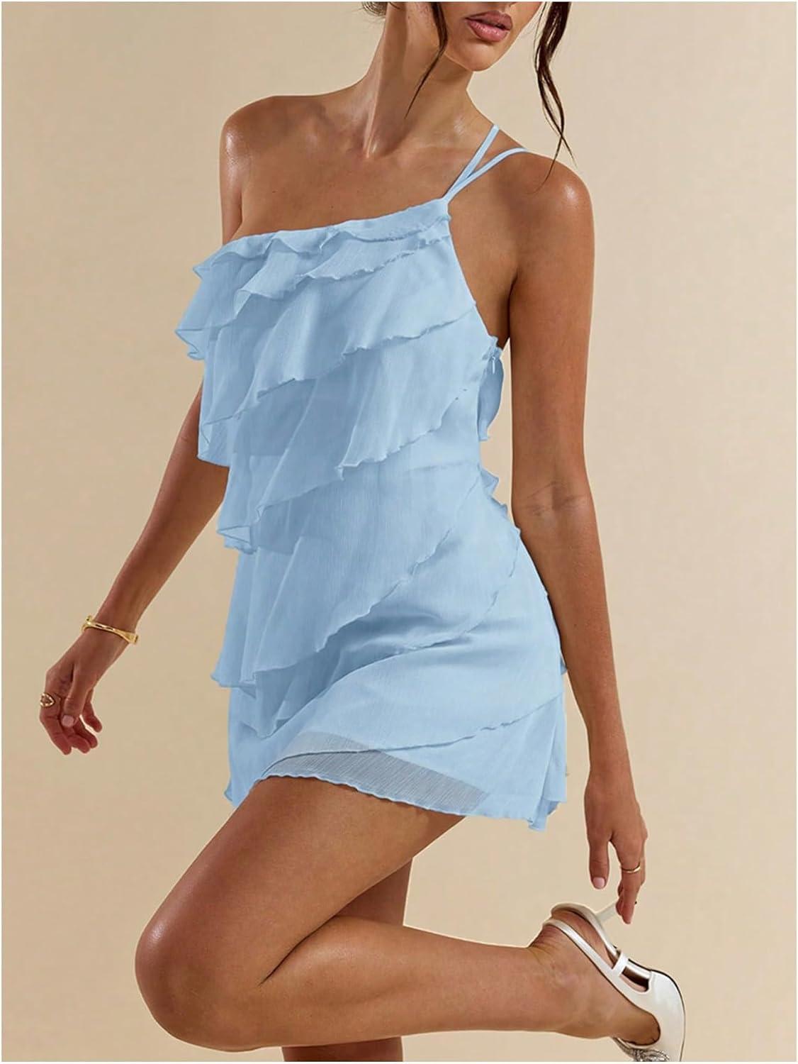 SOLY HUX Women’s One Shoulder Ruffle Mesh Mini Dress Layered Backless Vacation Party Sundresses(Light Blue)