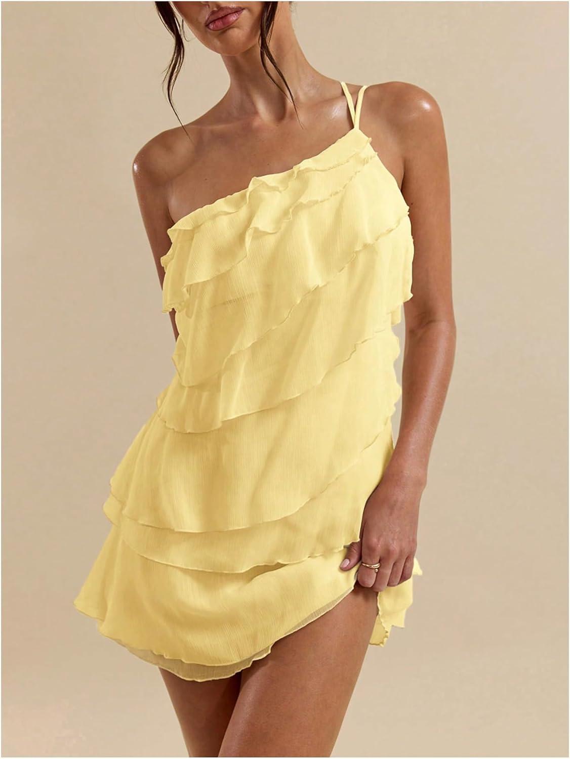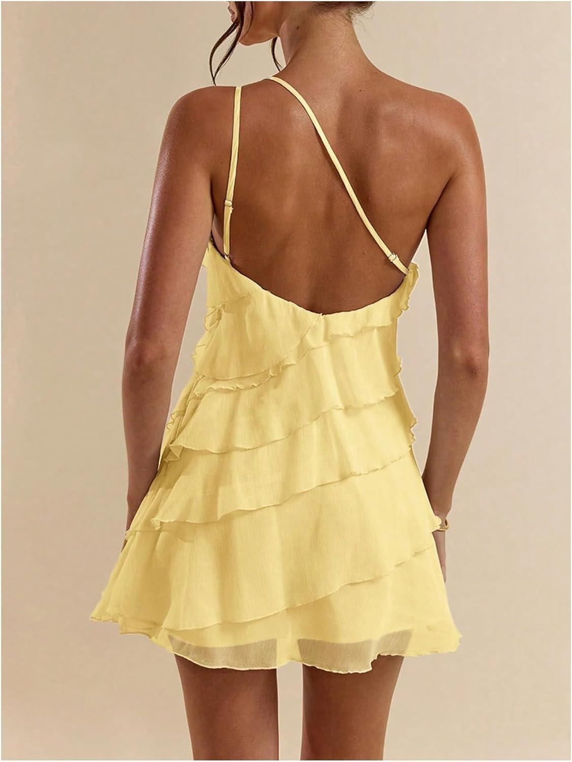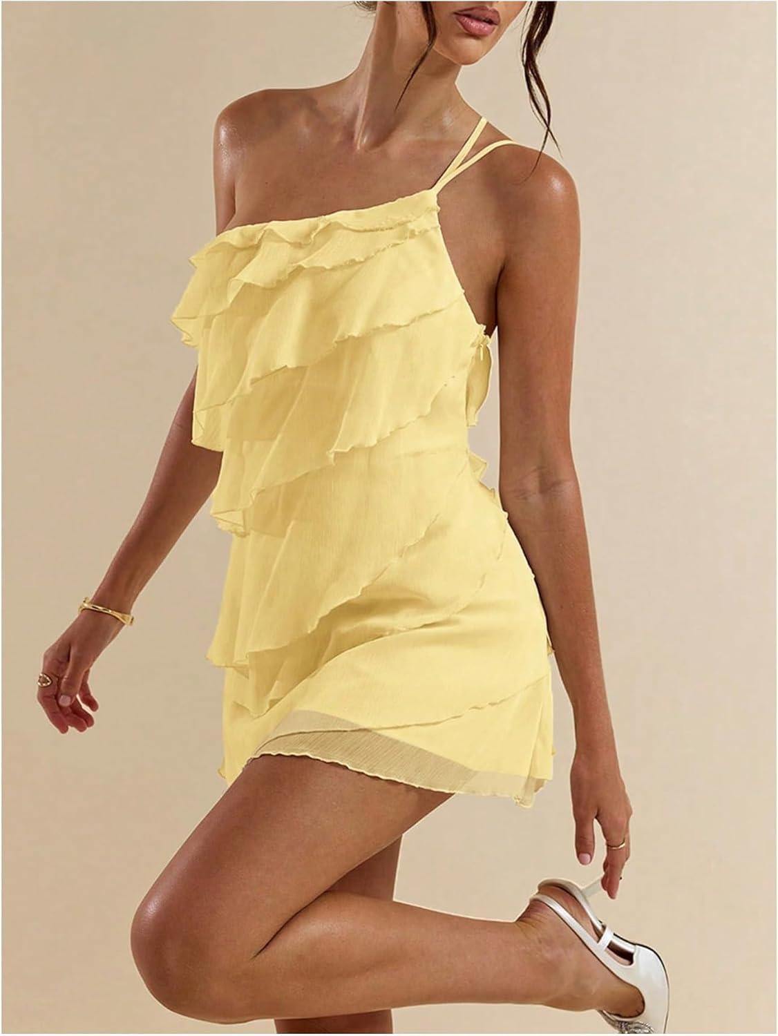 SOLY HUX Women’s One Shoulder Ruffle Mesh Mini Dress Layered Backless Vacation Party Sundresses(Plain Yellow)