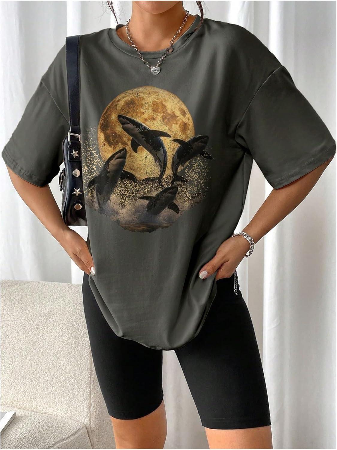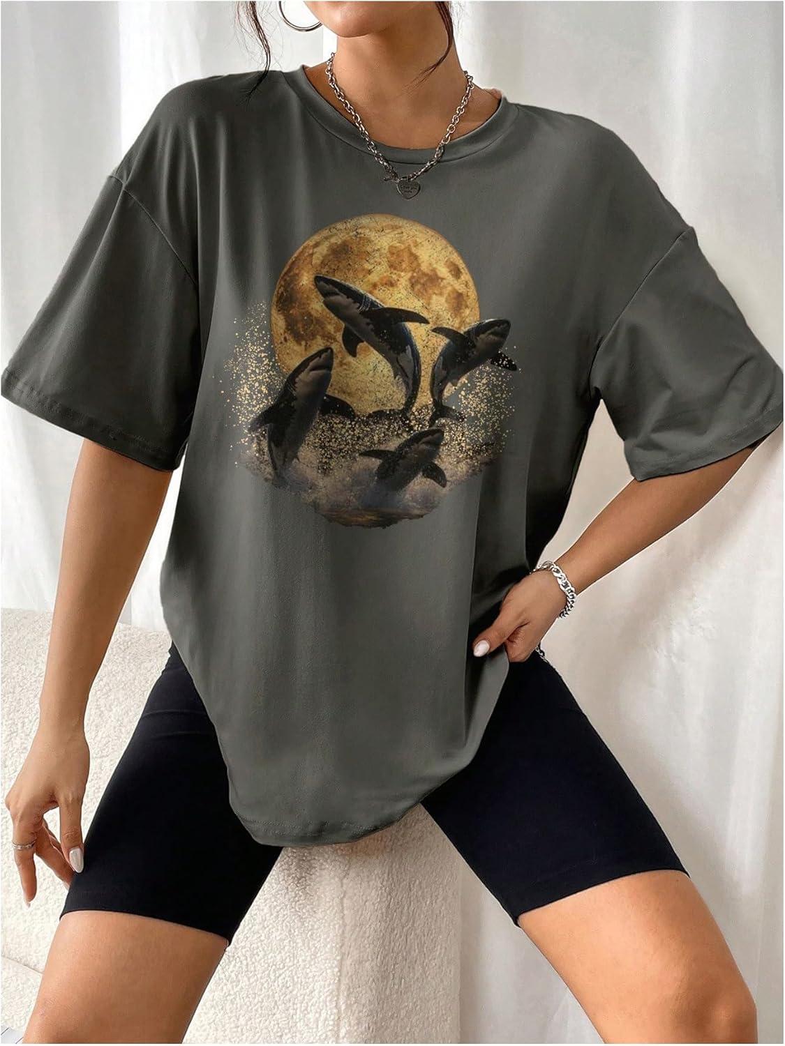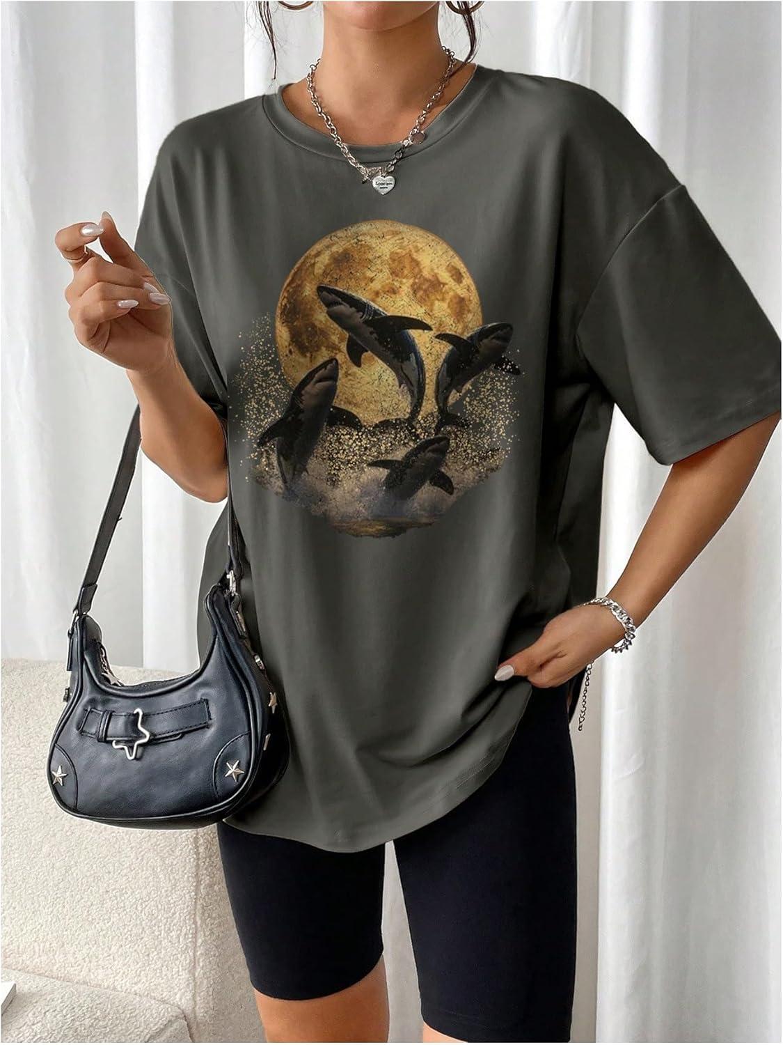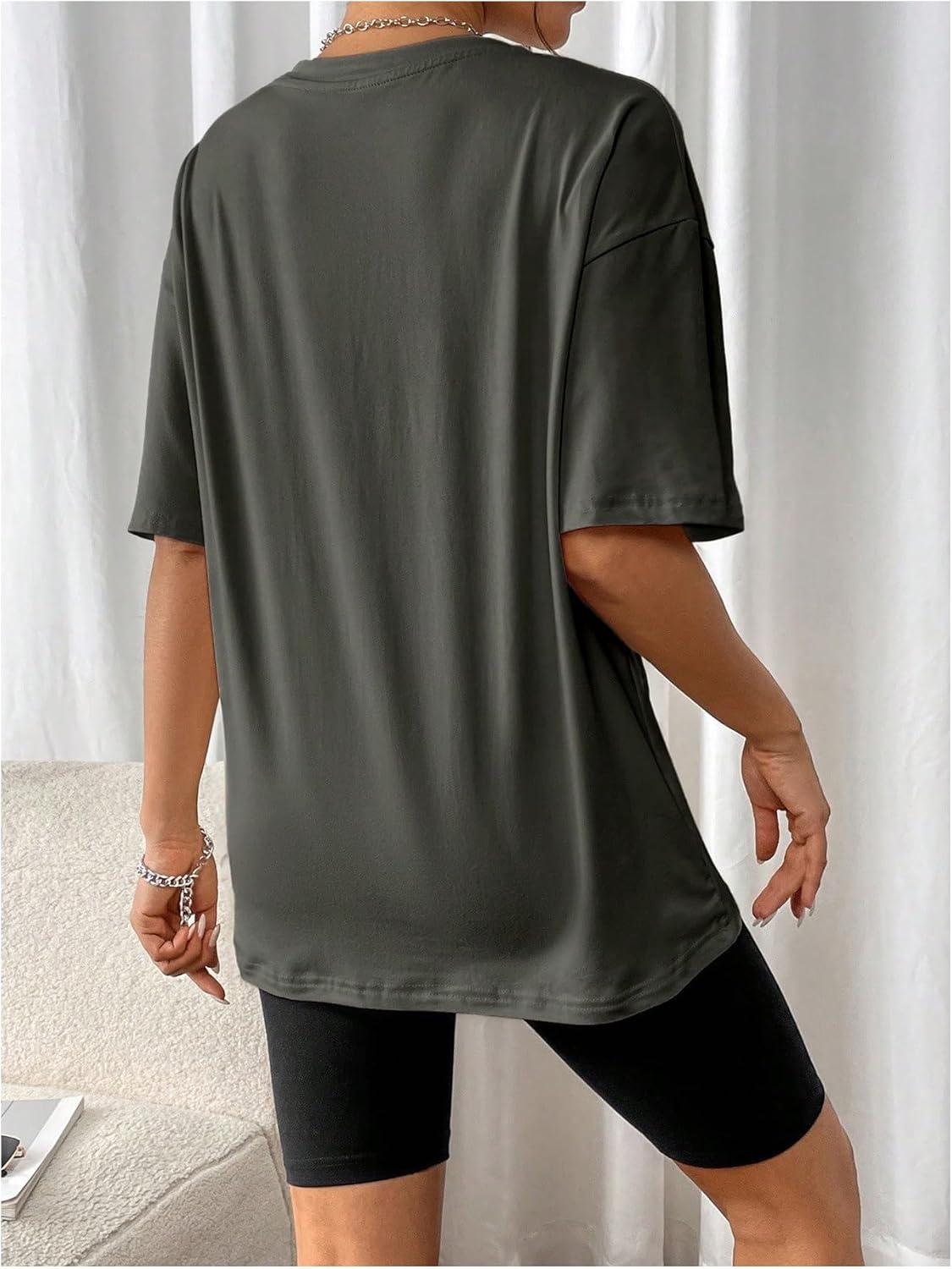 SOLY HUX Women’s Oversized Graphic Tees Drop Shoulder Half Sleeve Loose Casual T Shirt Tops(Dark Grey Graphic Print)