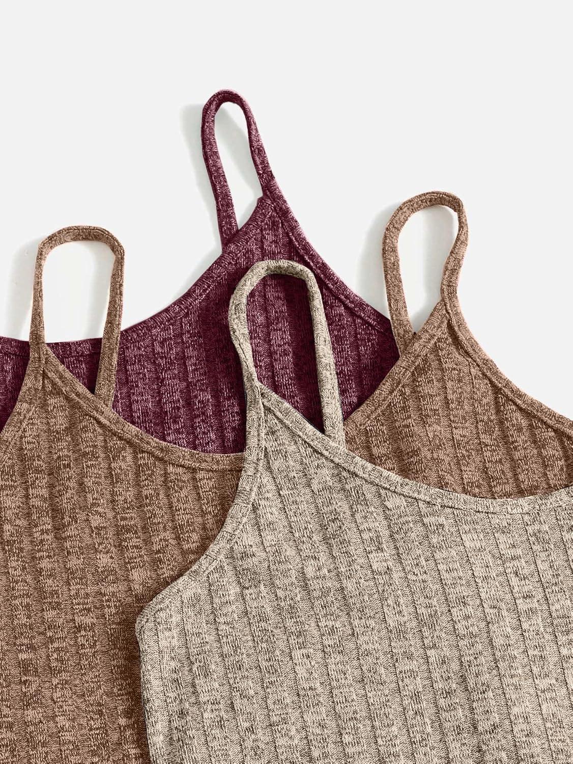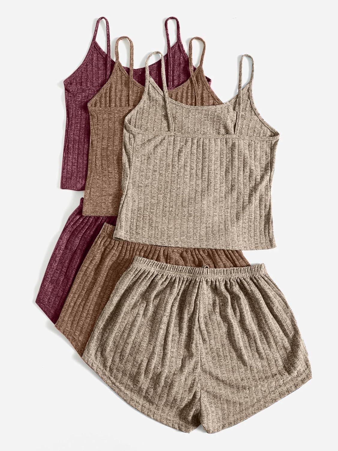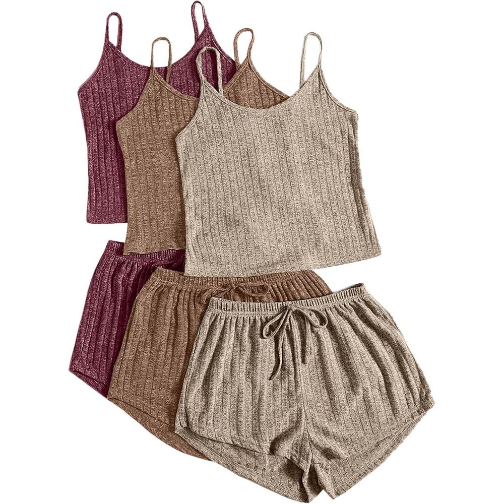 SOLY HUX Womens Pajama Sets Lounge Sets Ribbed Knit Cami Crop Top and Shorts Sleepwear PJ 3 Sets(Red Brown Khaki)