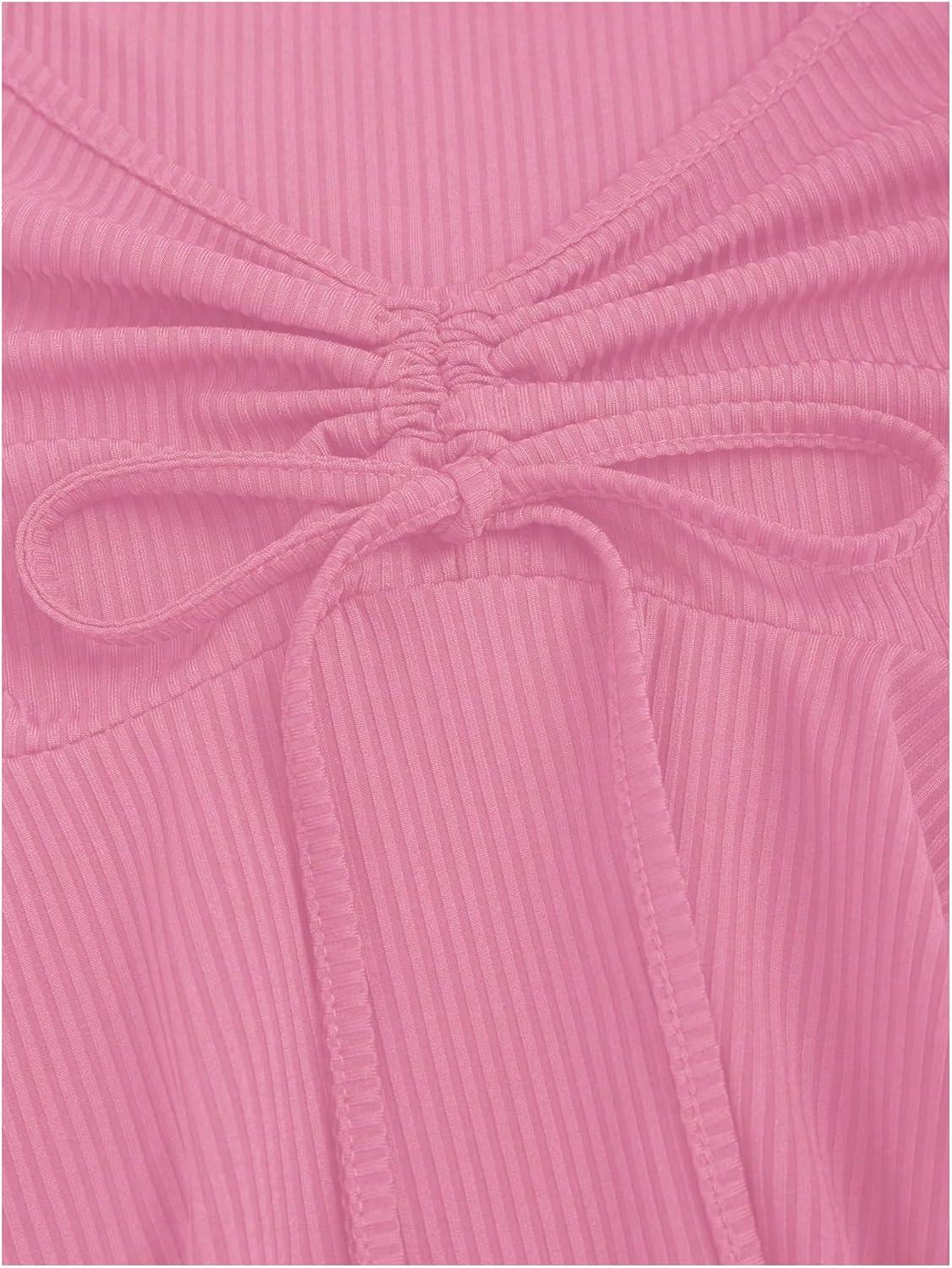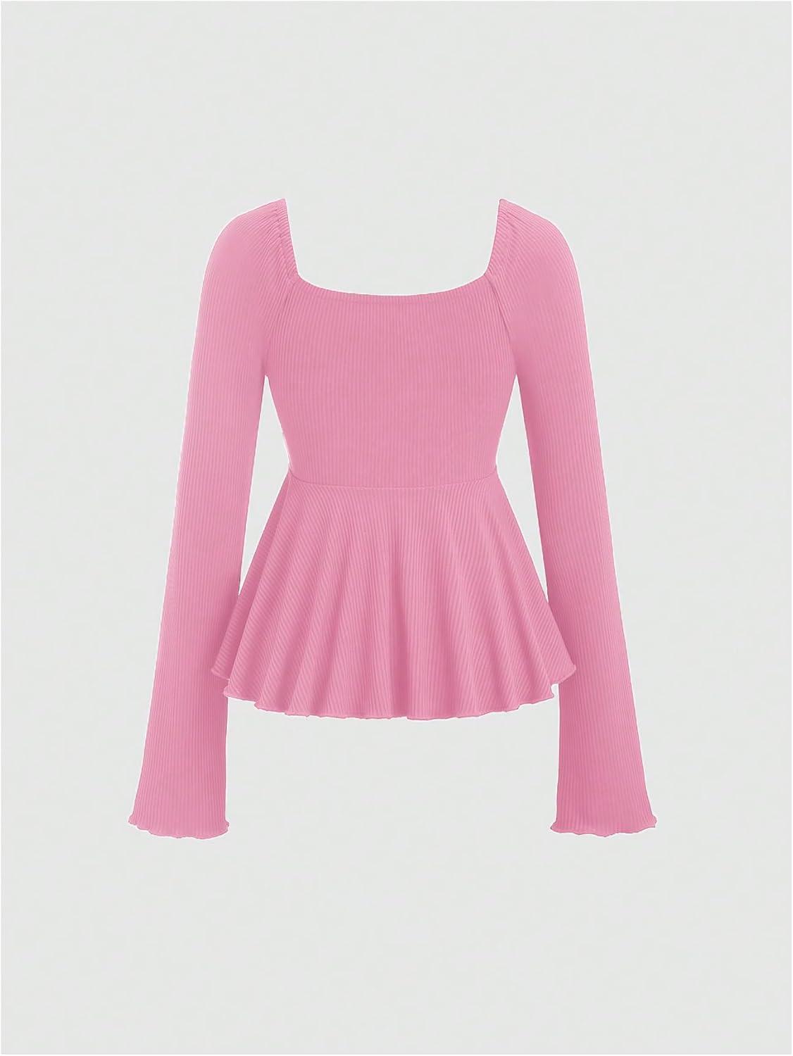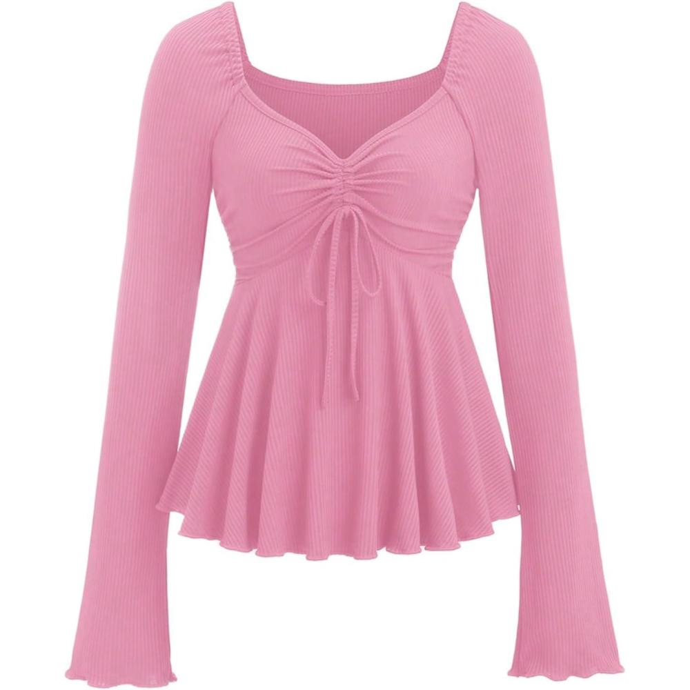 SOLY HUX Women’s Peplum Tops Long Sleeve Babydoll Shirts Y2k Cute Tie Front Sweetheart Neckline Top(Pure Pink)