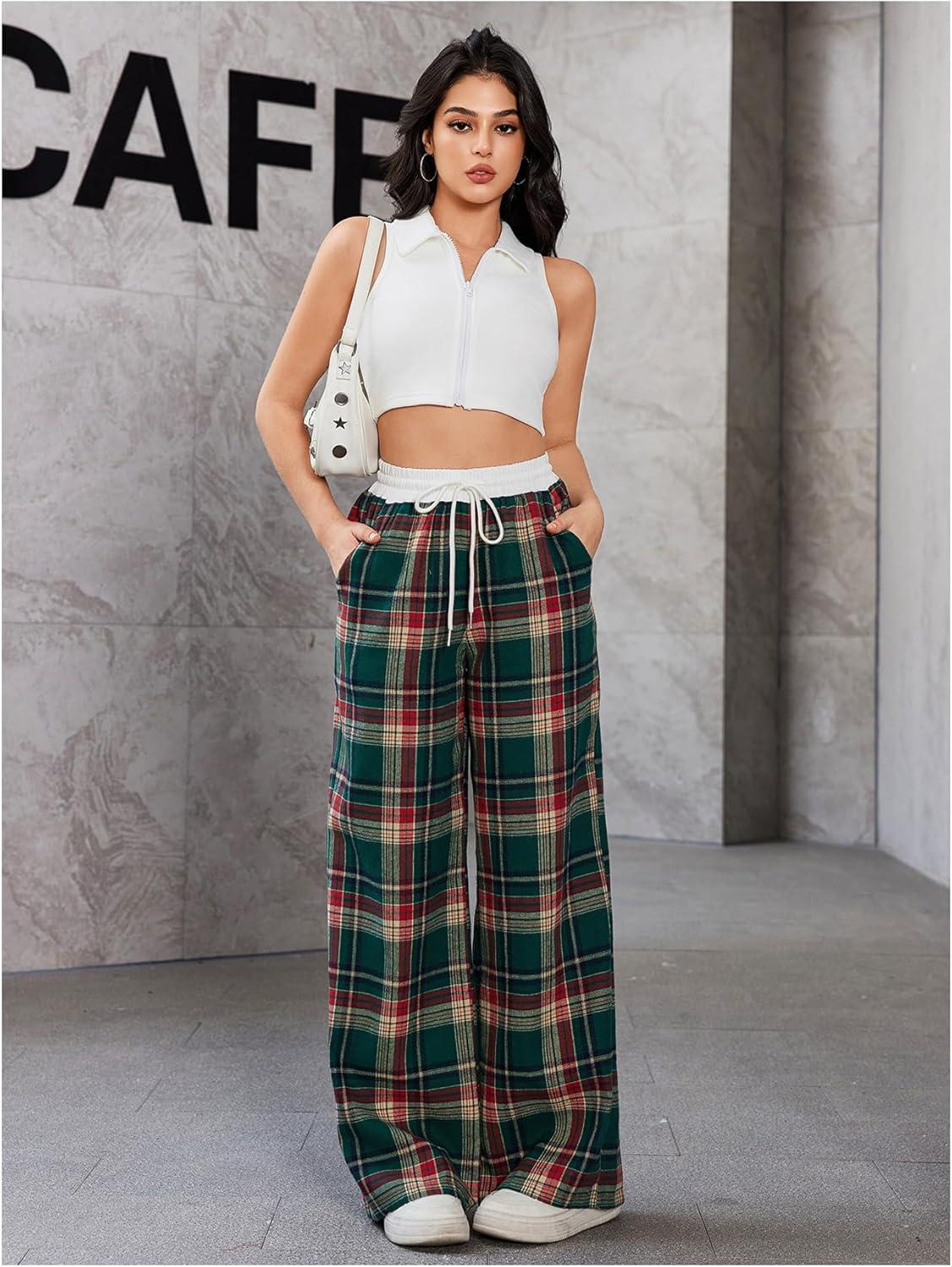 SOLY HUX Women’s Plaid Checkered Pants Flannel Pajama Pants Lounge Wide Leg Baggy Sweatpants with Pockets(Green Plaid)