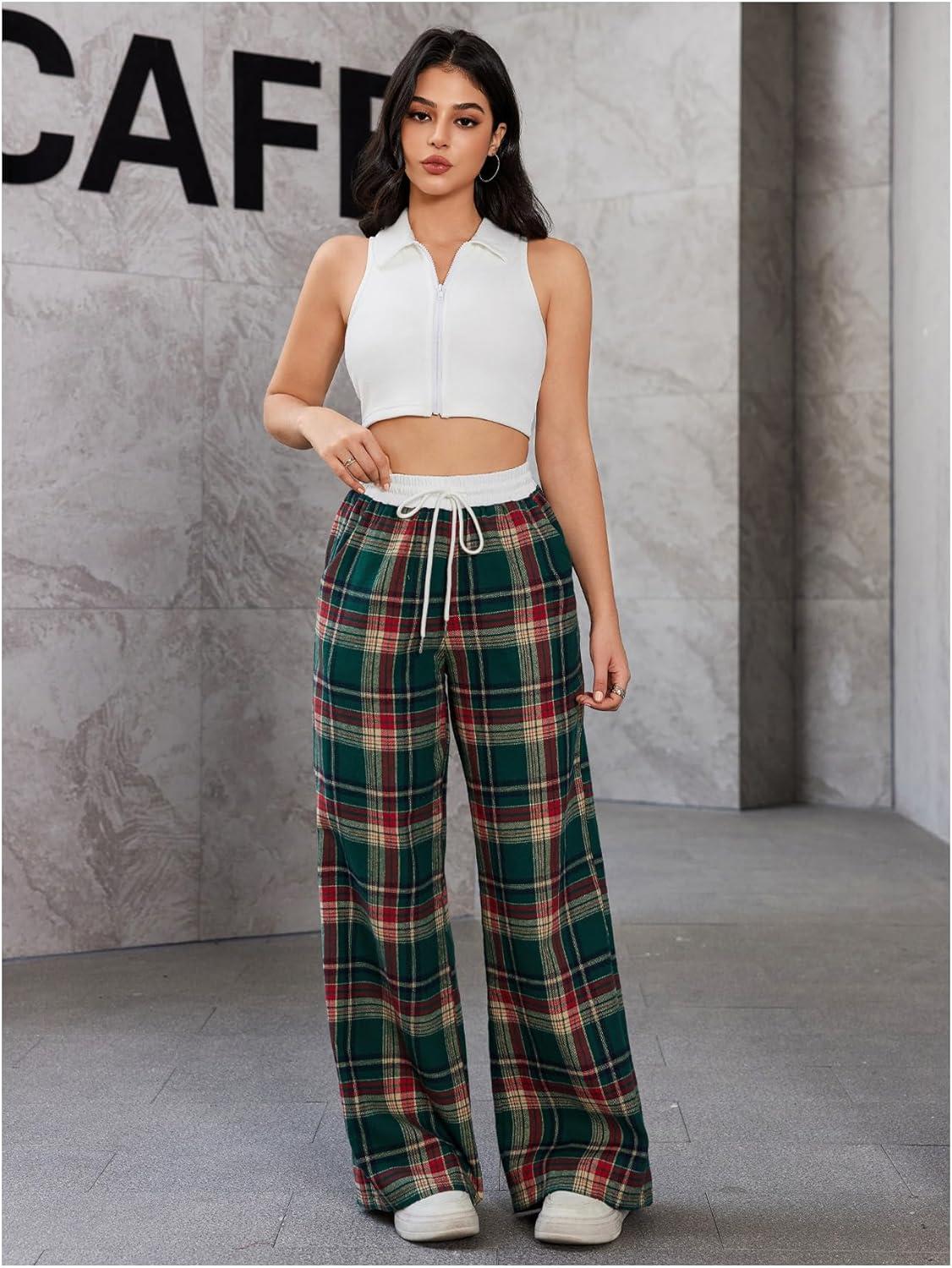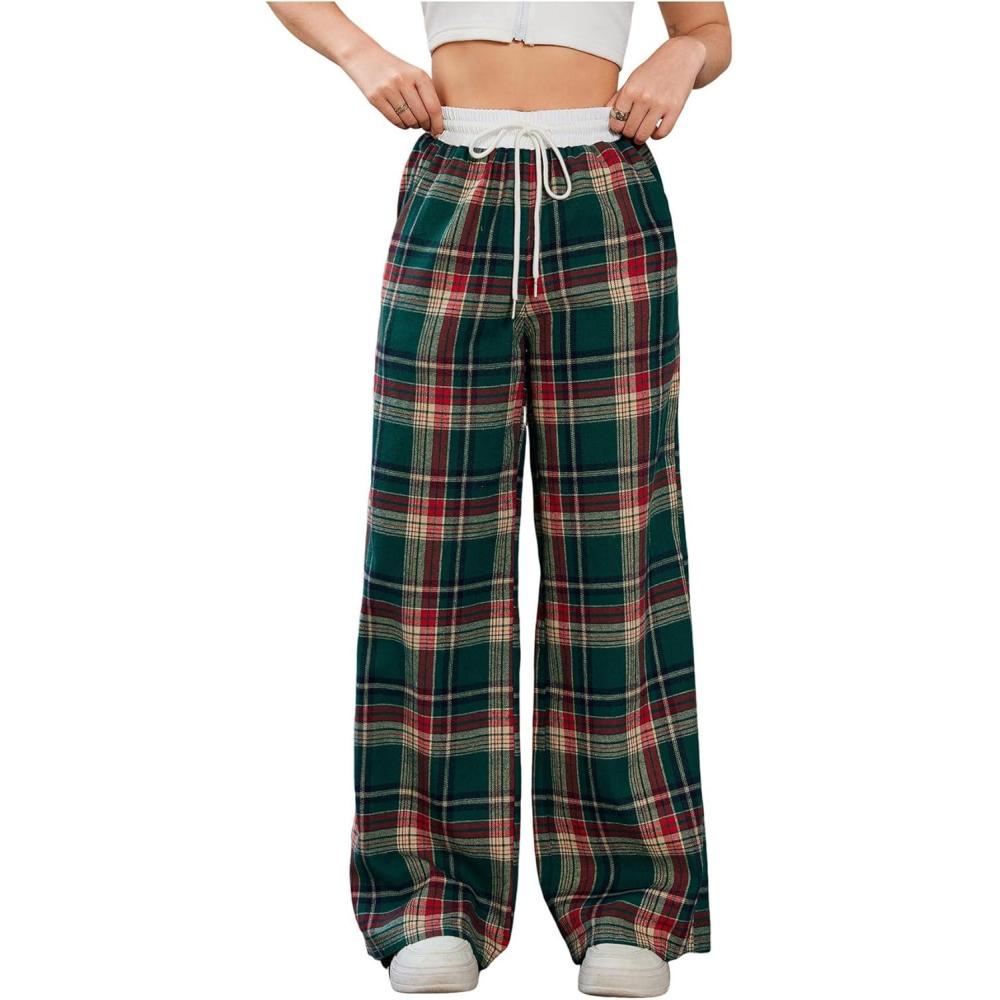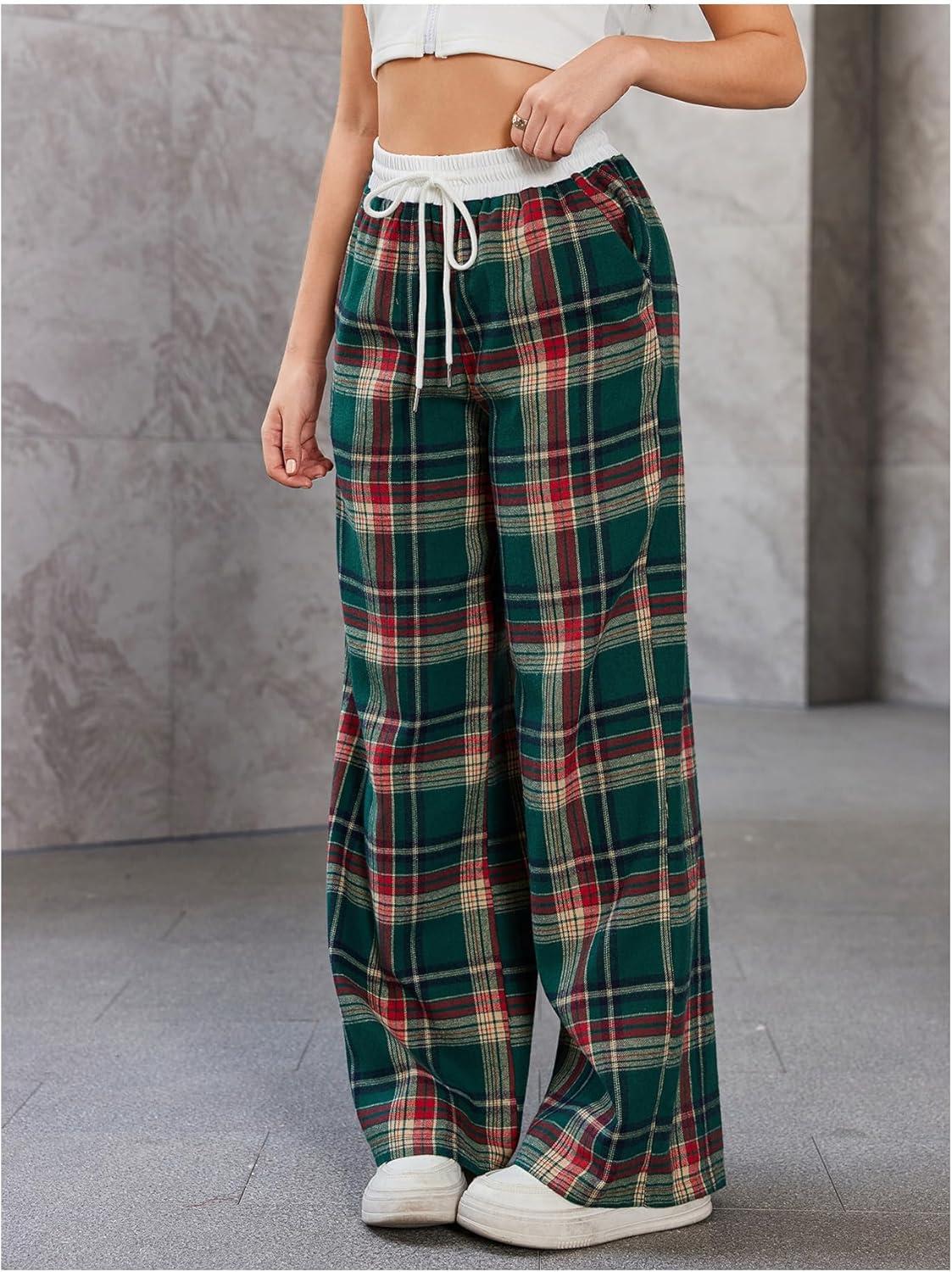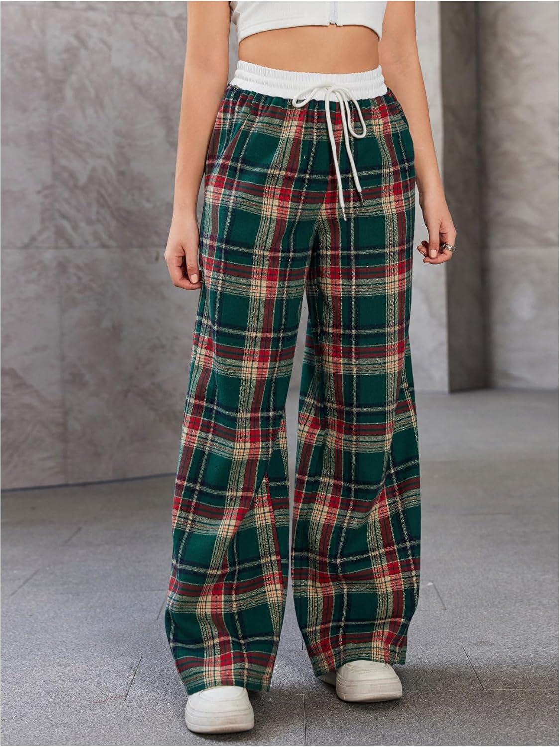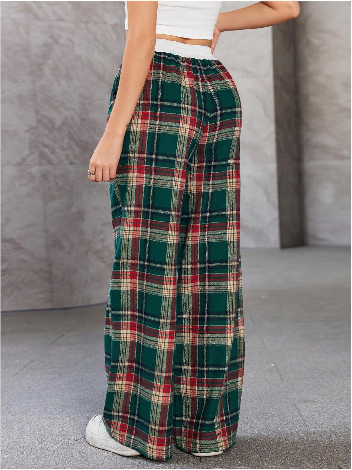 SOLY HUX Women’s Plaid Checkered Pants Flannel Pajama Pants Lounge Wide Leg Baggy Sweatpants with Pockets(Dark Green and Red Tarten)