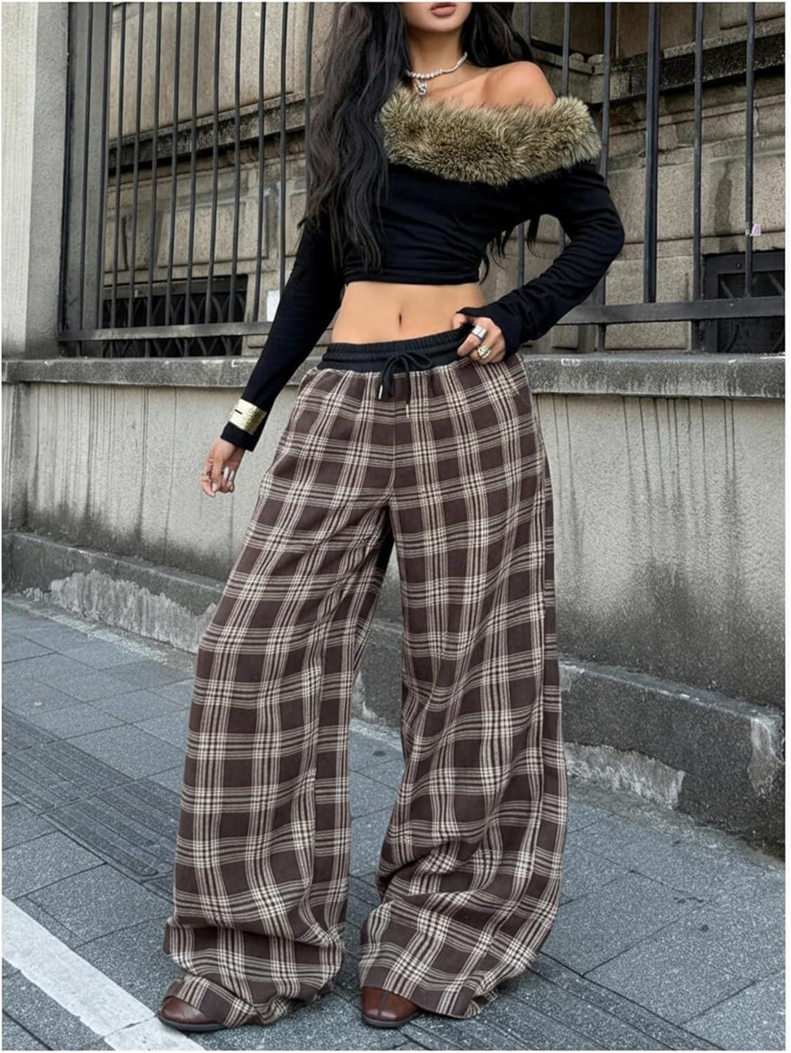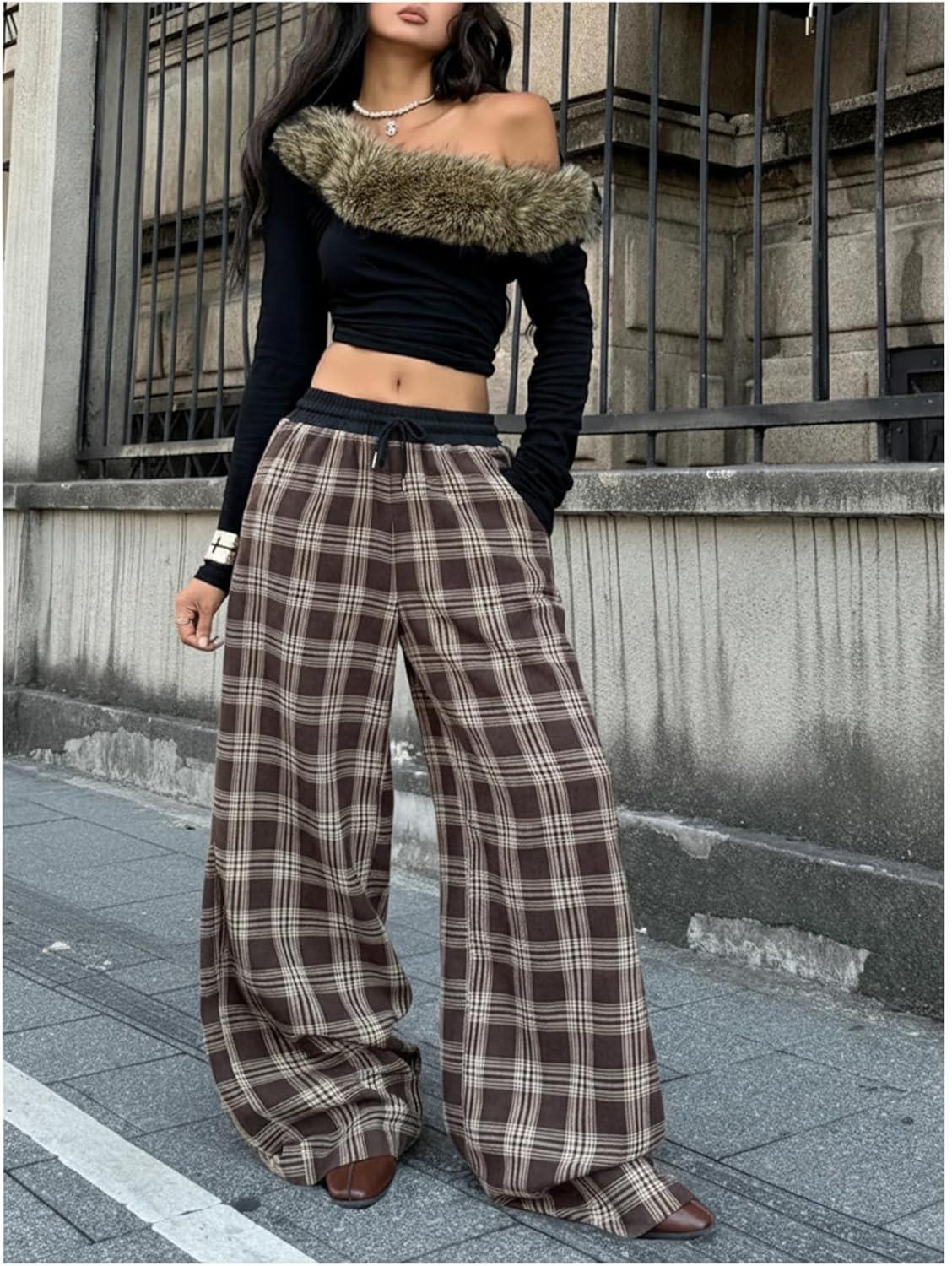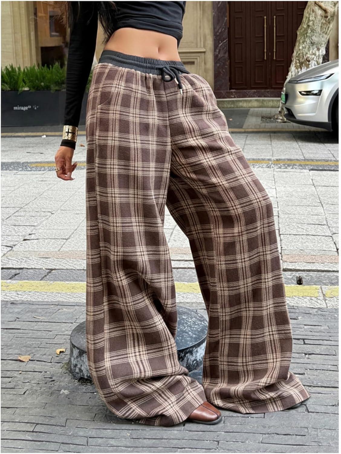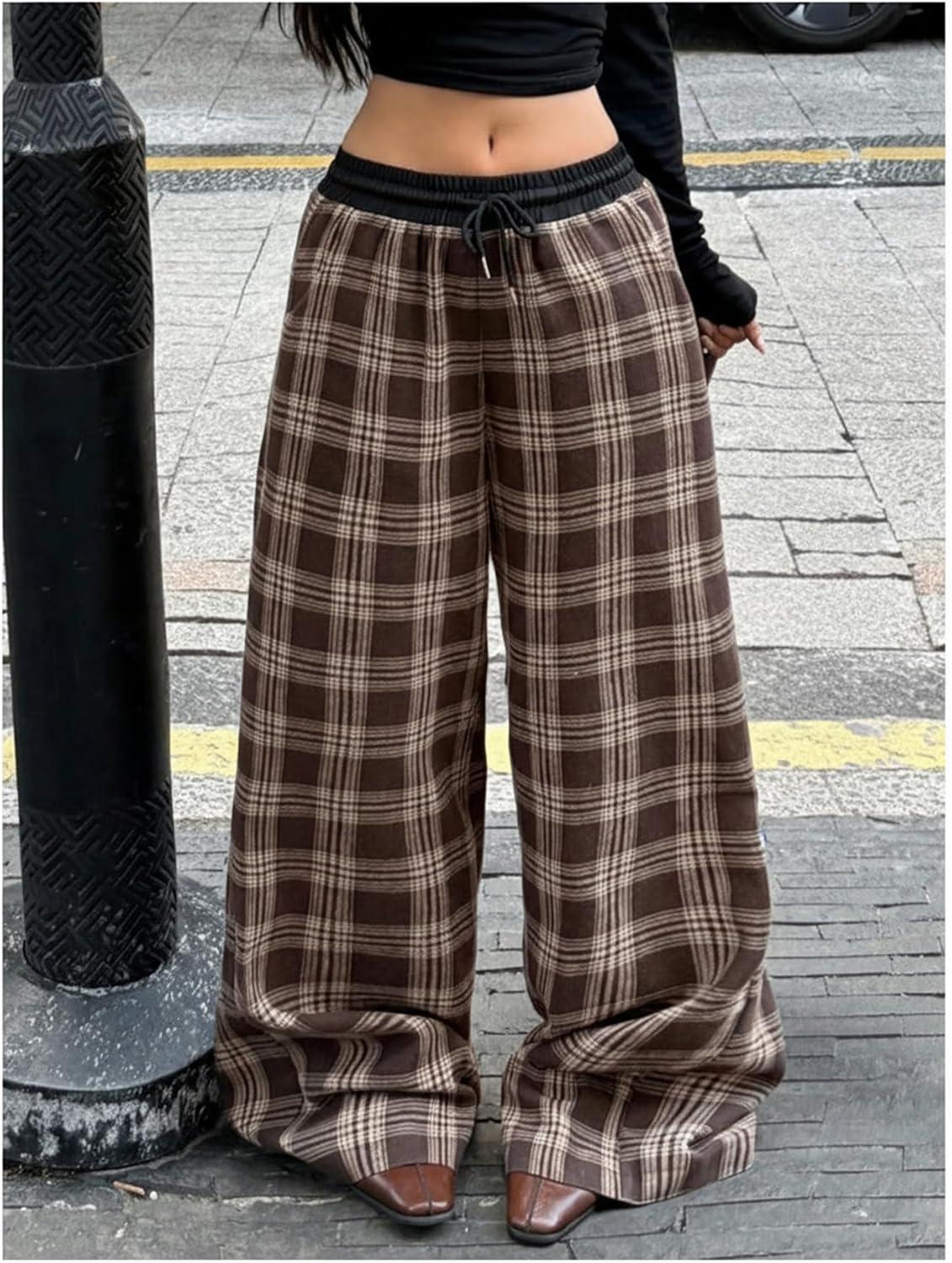 SOLY HUX Women’s Plaid Checkered Pants Flannel Pajama Pants Lounge Wide Leg Baggy Sweatpants with Pockets(Khaki Plaid)