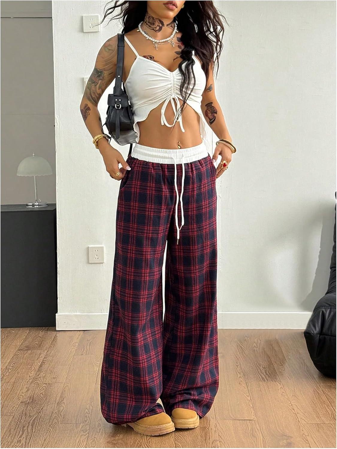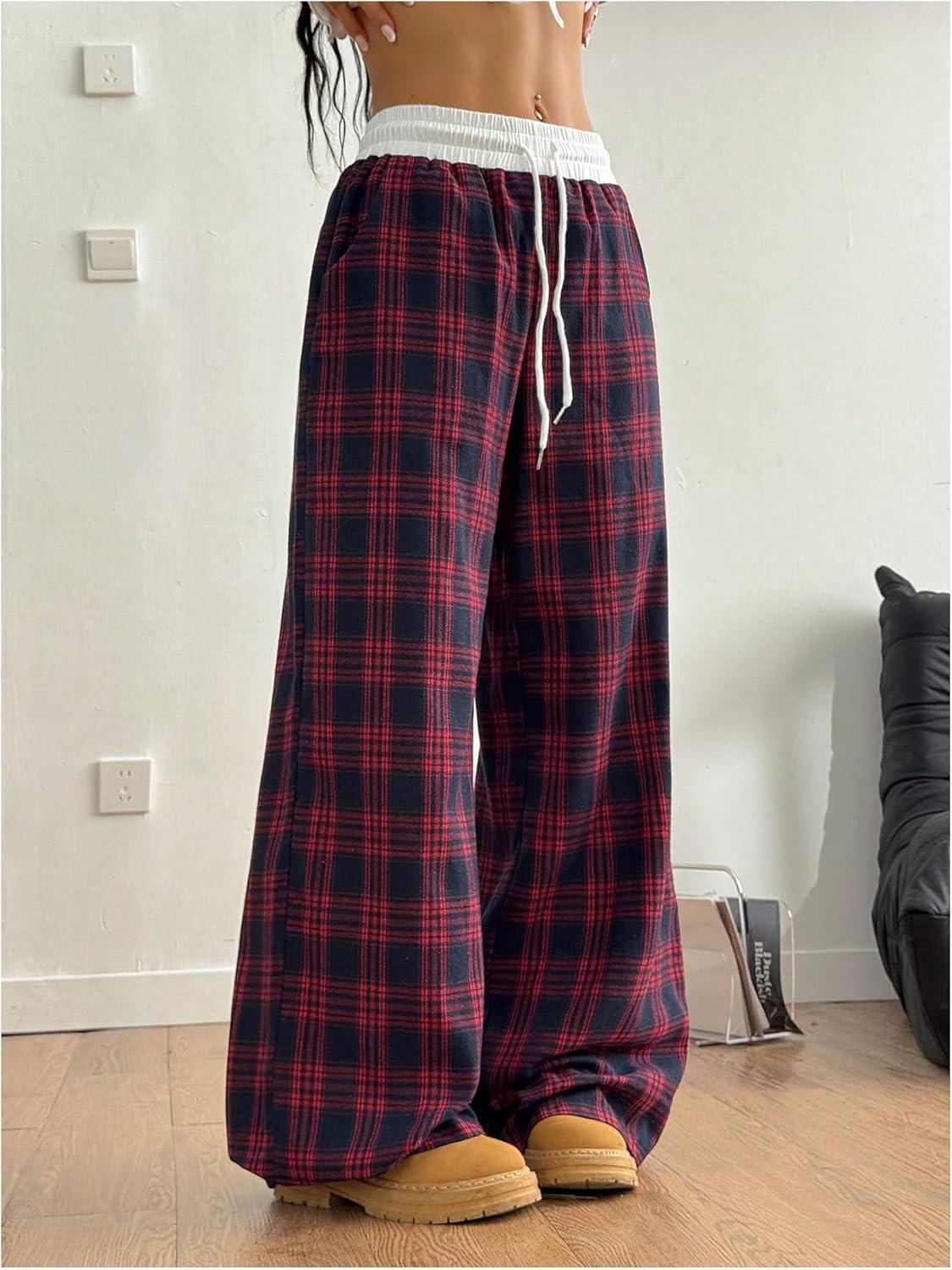 SOLY HUX Women’s Plaid Checkered Pants Flannel Pajama Pants Lounge Wide Leg Baggy Sweatpants with Pockets(Red and White Plaid)