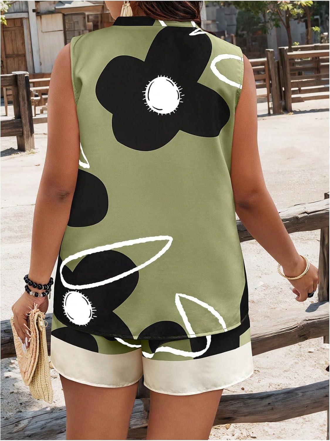 SOLY HUX Women’s Plus Size 2 Piece Outfits Floral Print Notch V Neck Tank Top and Shorts Set(Green Floral)