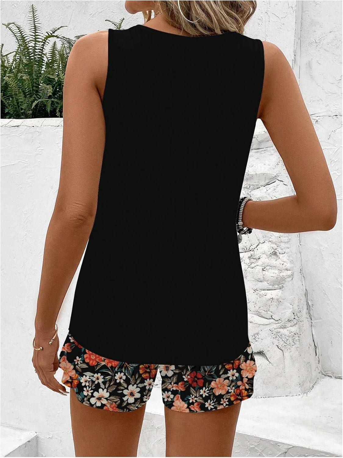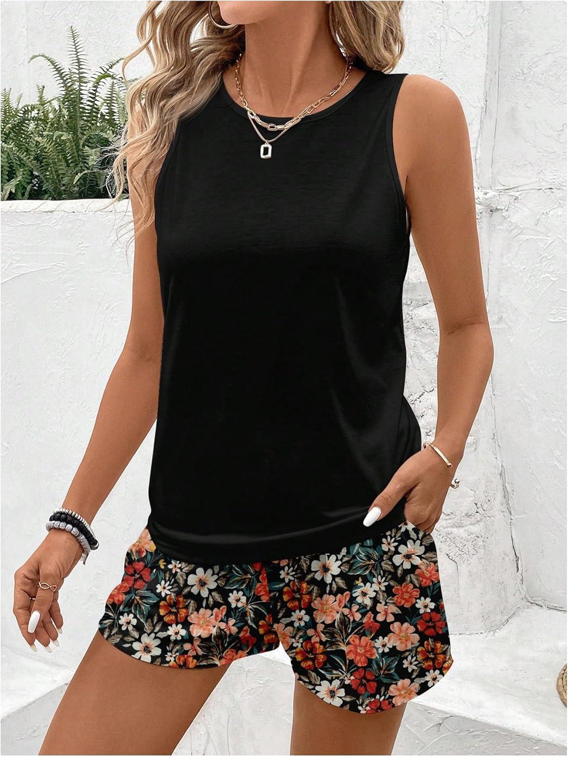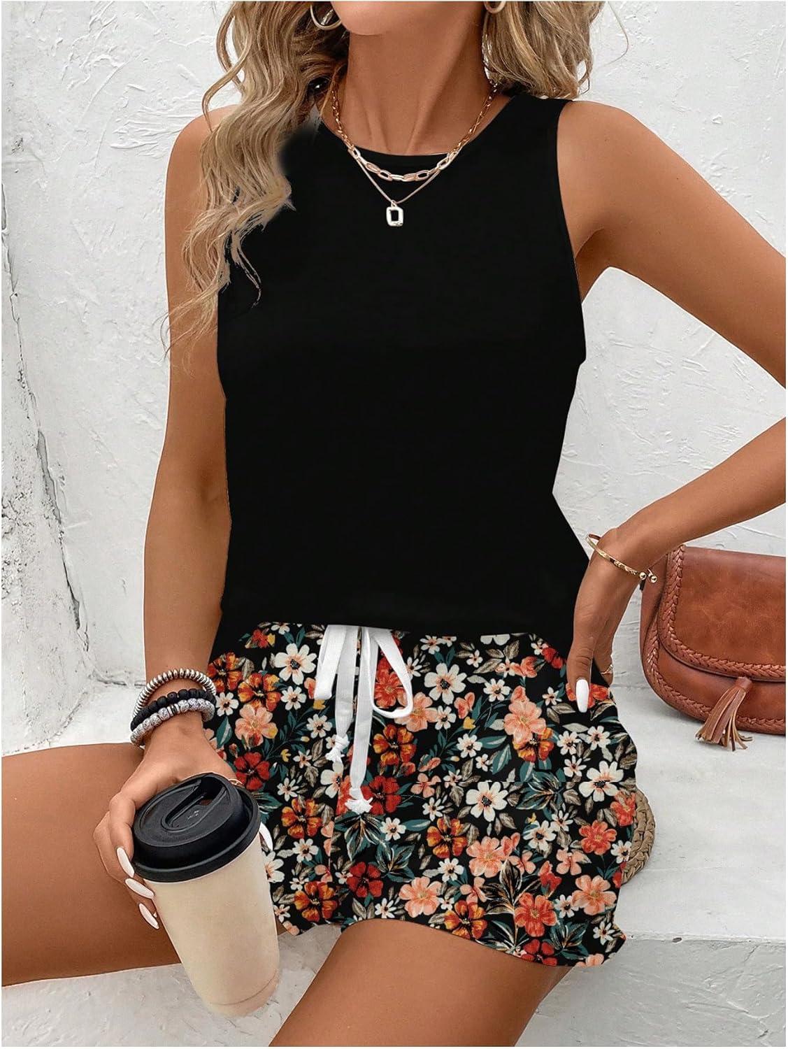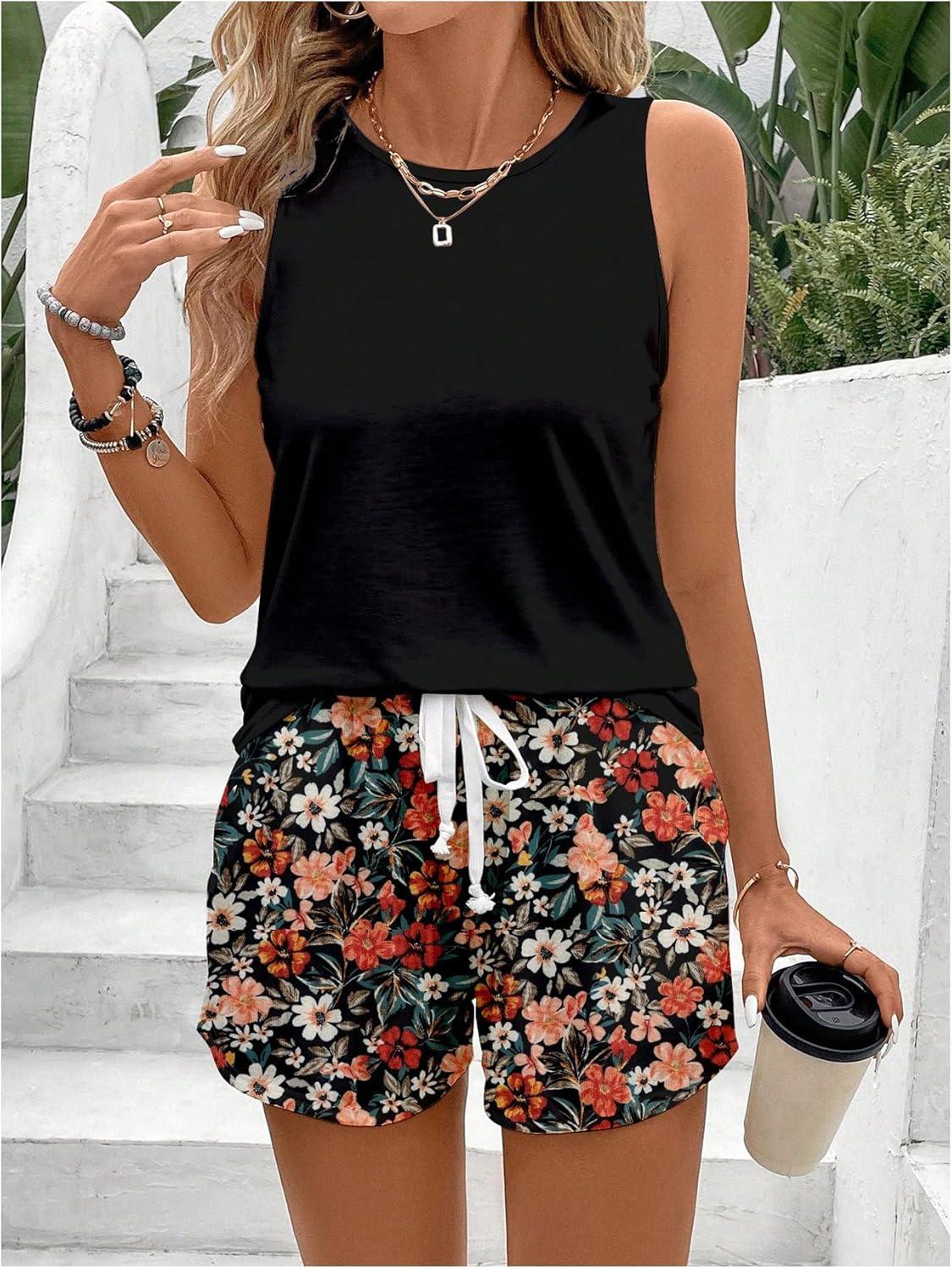 SOLY HUX Women’s Plus Size 2 Piece Summer Vacation Outfits Sleeveless Tank Tops and Floral Print Shorts Set(Black Floral)
