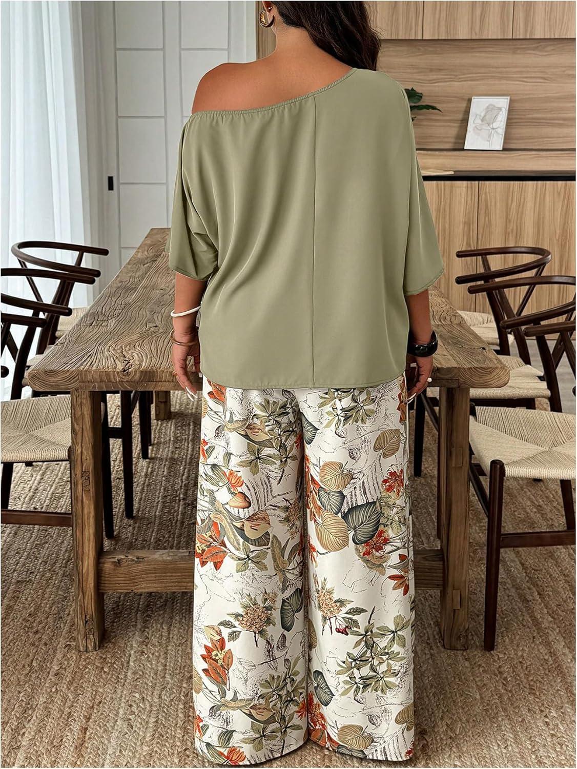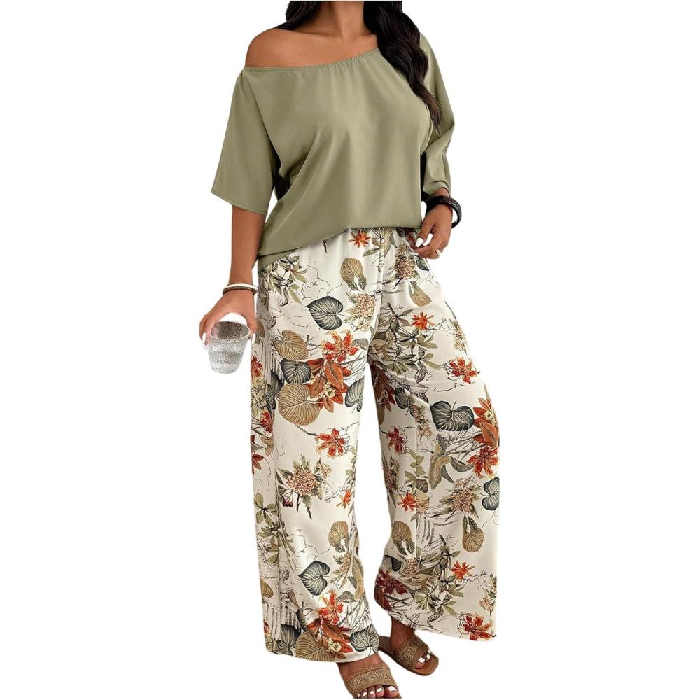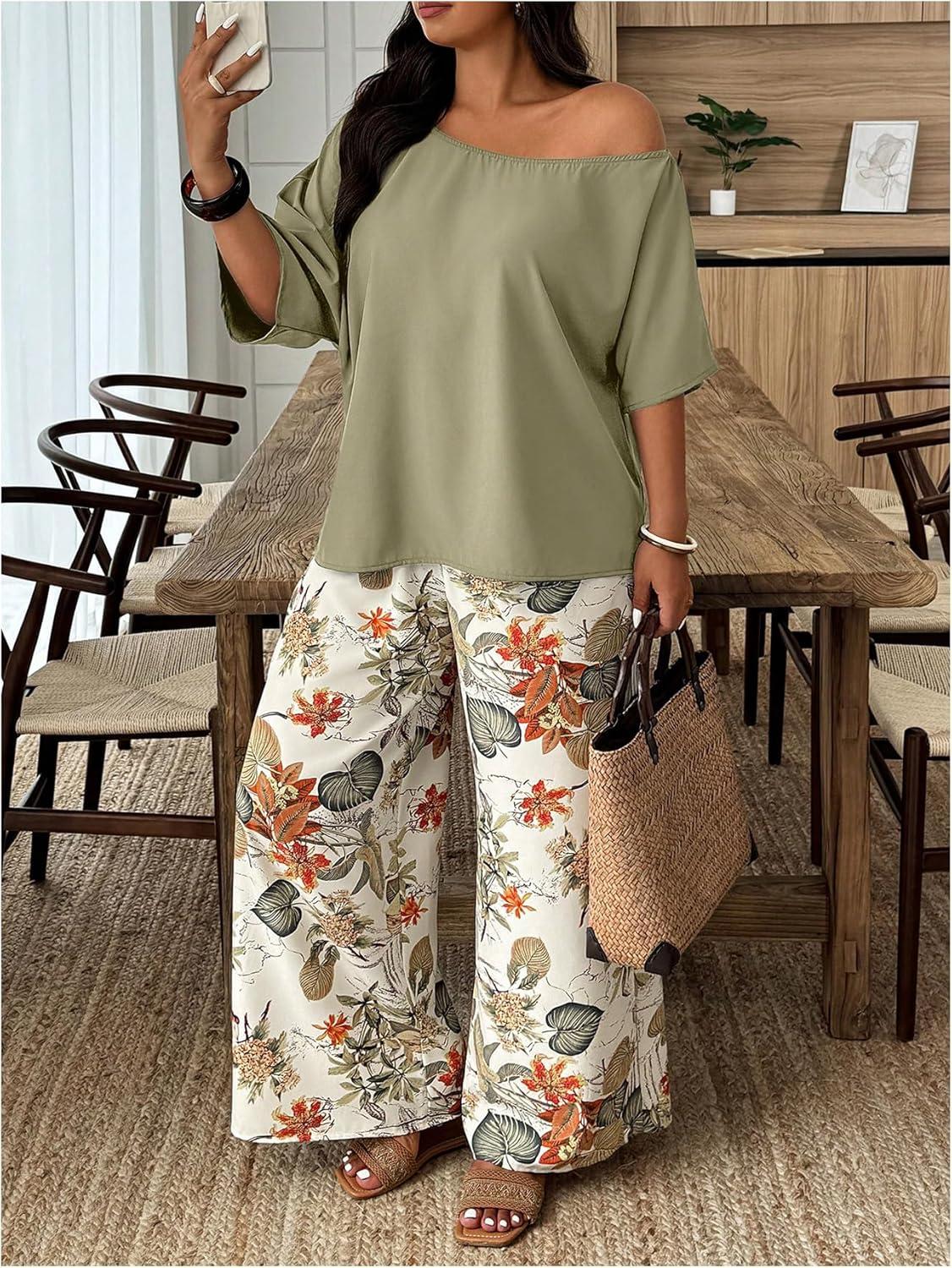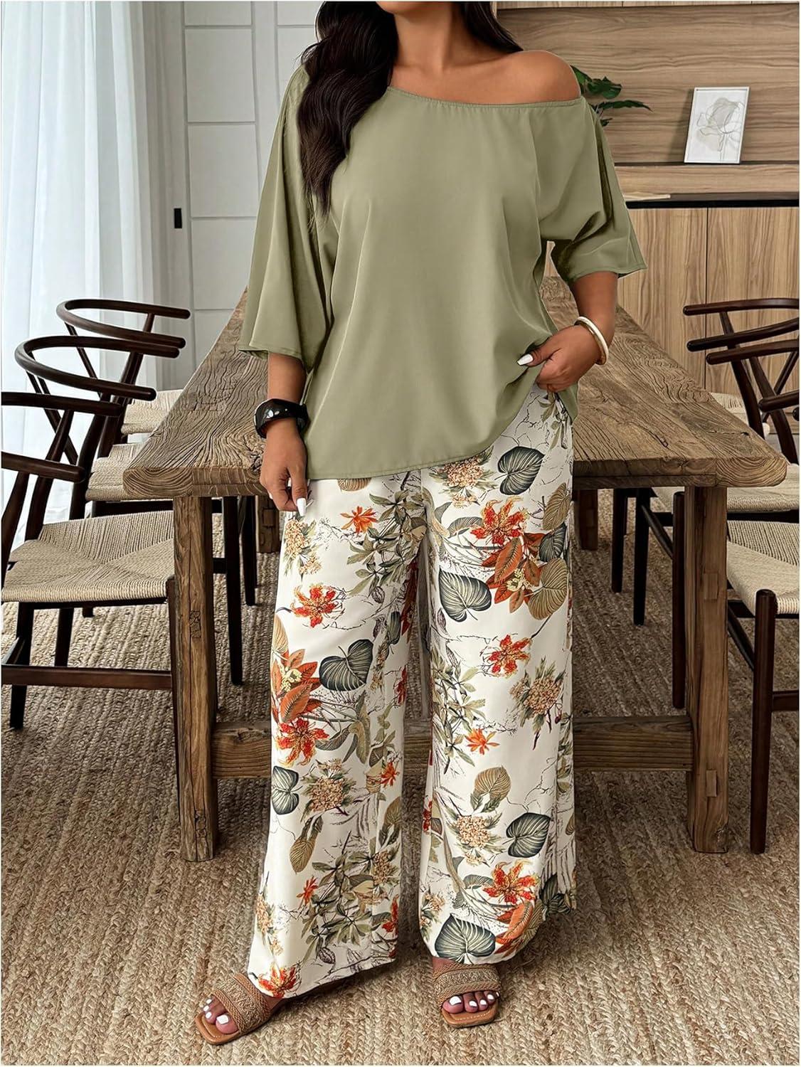 SOLY HUX Women’s Plus Size 2 Piece Vacation Outfits Off The Shoulder 3/4 Sleeve Top and Boho Print Pants Set(Green Floral)