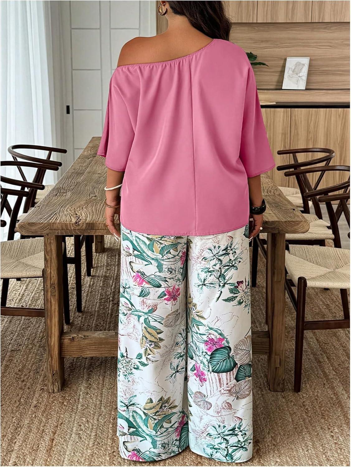 SOLY HUX Women’s Plus Size 2 Piece Vacation Outfits Off The Shoulder 3/4 Sleeve Top and Boho Print Pants Set(Pink Leaf)