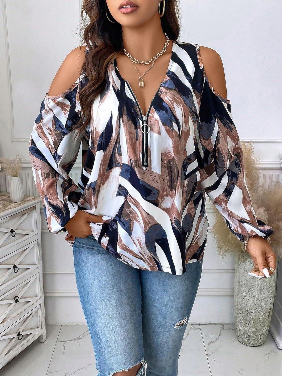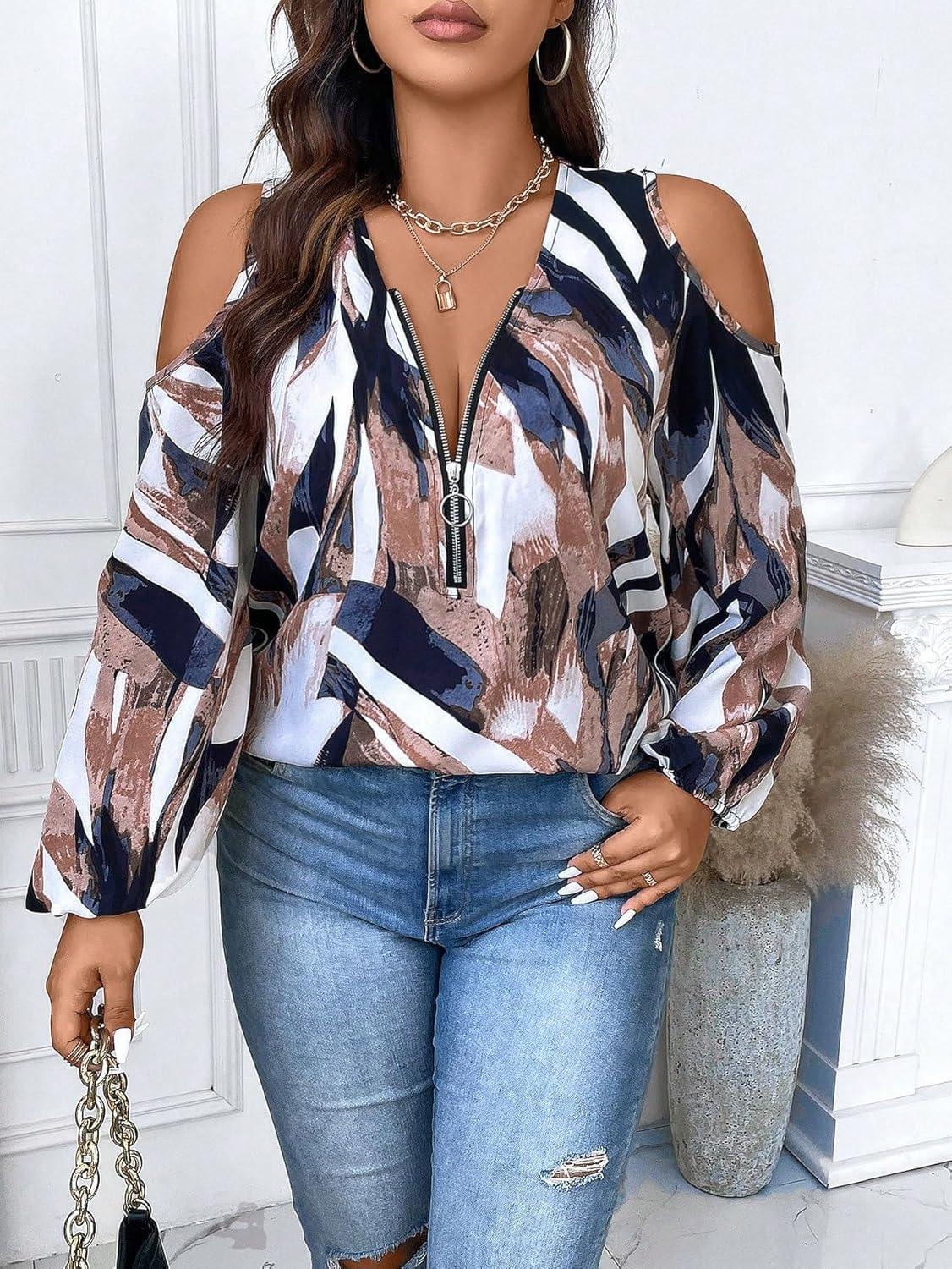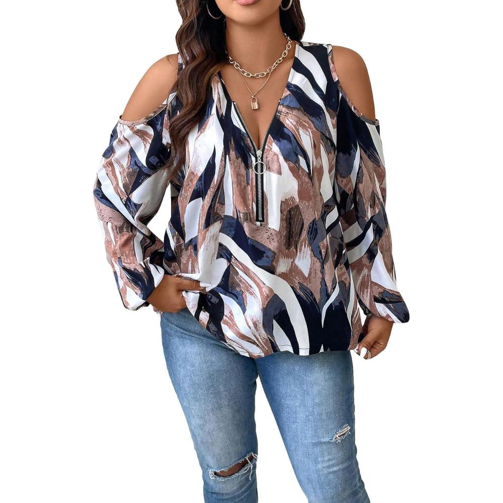 SOLY HUX Women’s Plus Size Blouse Allover Print Cold Shoulder Bishop Long Sleeve Half Zip Tops(Multicoloured Print)