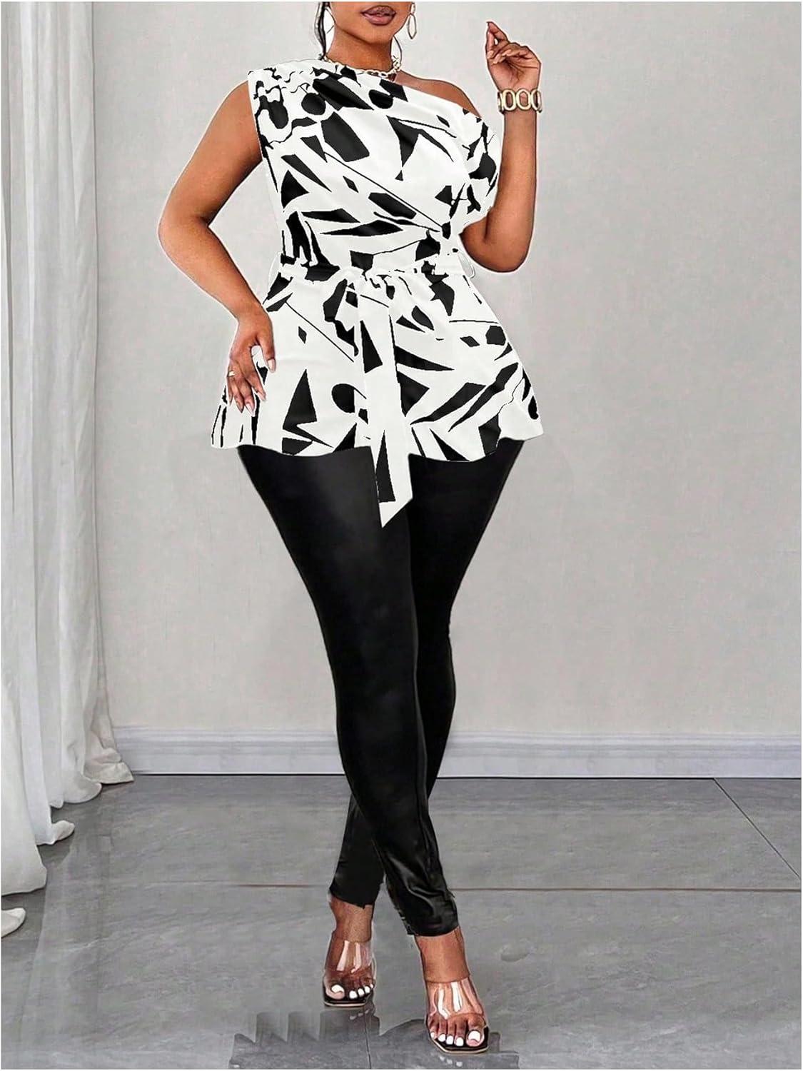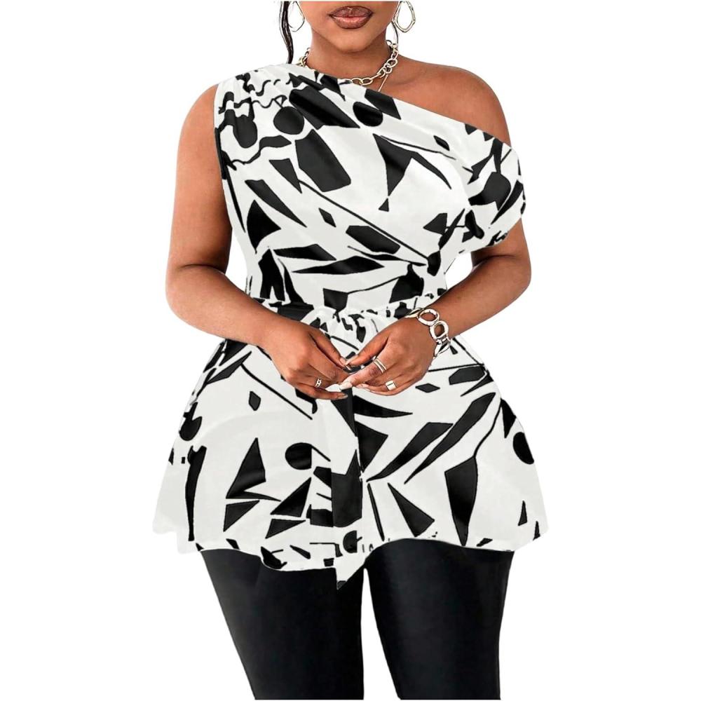 SOLY HUX Women’s Plus Size Blouse Printed Off The Shoulder Short Sleeve Asymmetric Neck Belted Summer Tops(Black and White Printed)