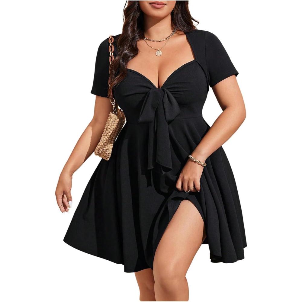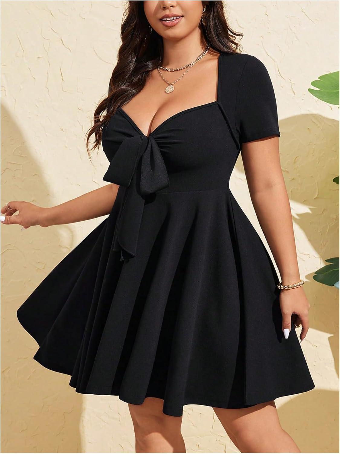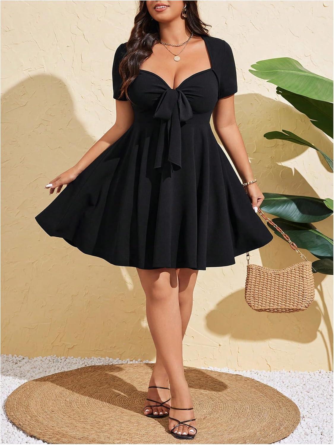 SOLY HUX Women’s Plus Size Bow Tie Short Sleeve Summer Short Dress Cocktail Beach Wedding Dresses(Plain Black)