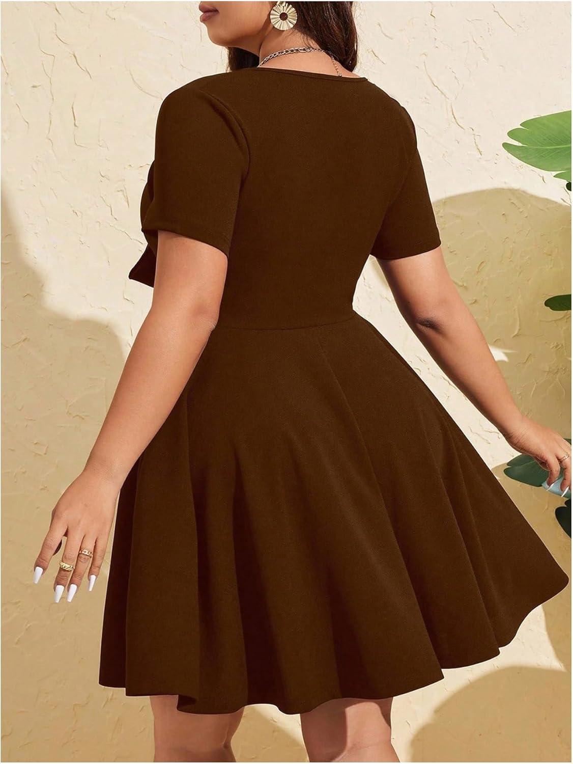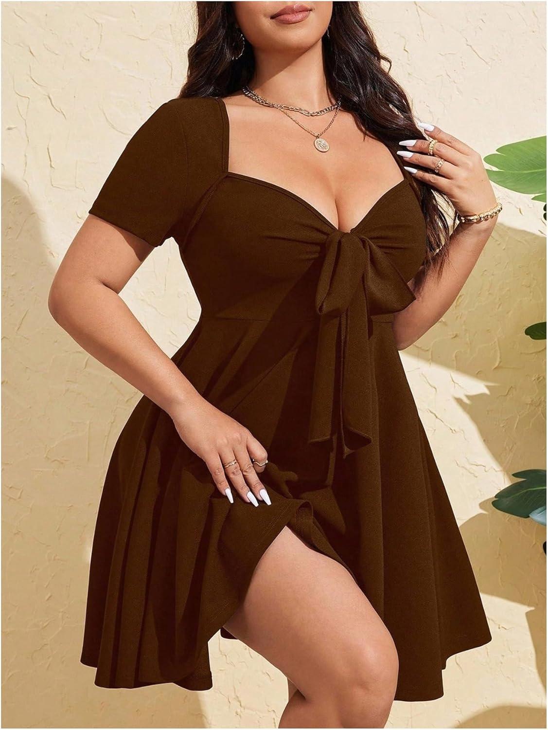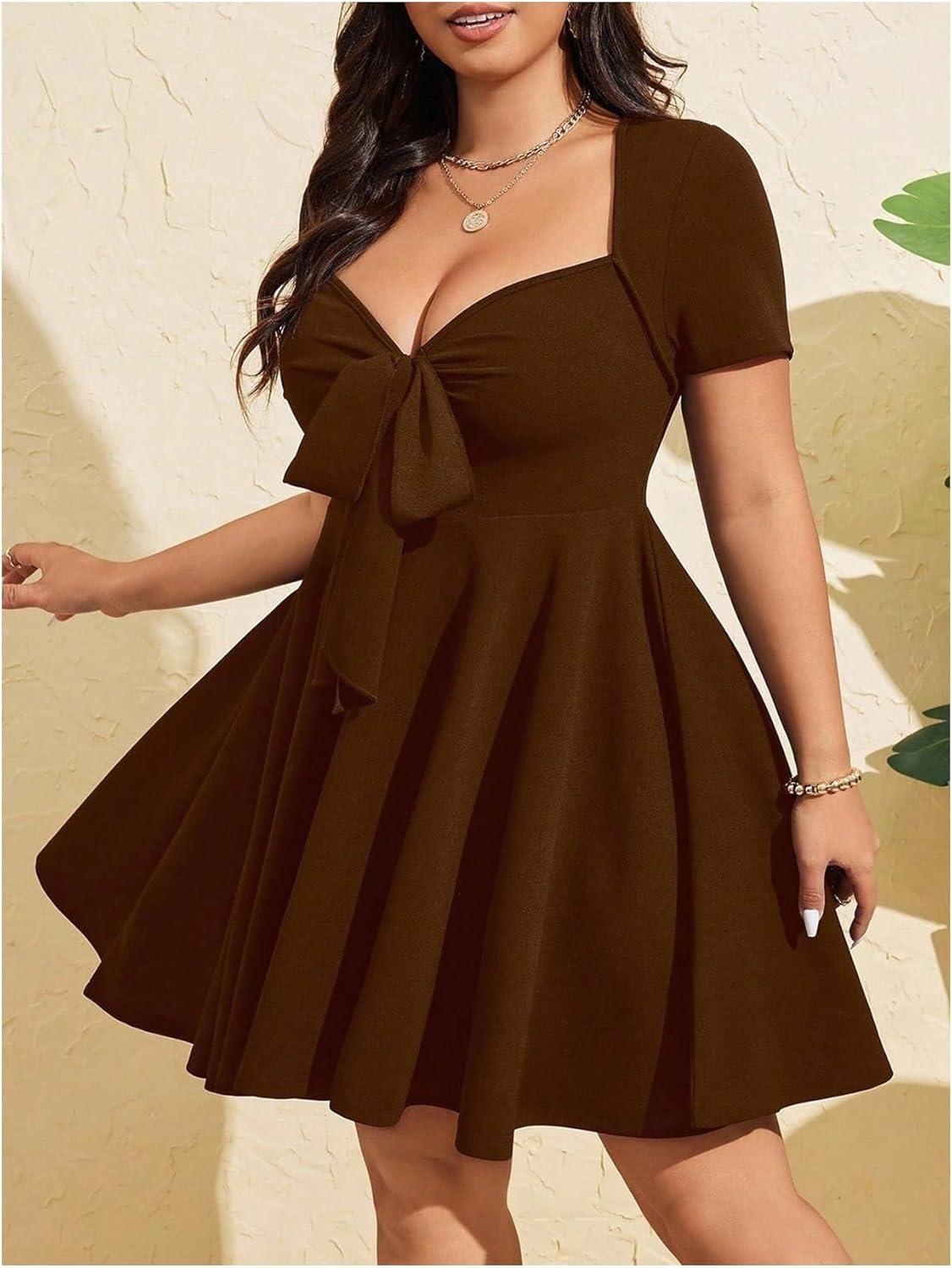 SOLY HUX Women’s Plus Size Bow Tie Short Sleeve Summer Short Dress Cocktail Beach Wedding Dresses(Plain Brown)