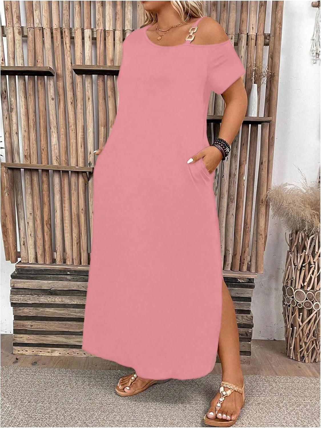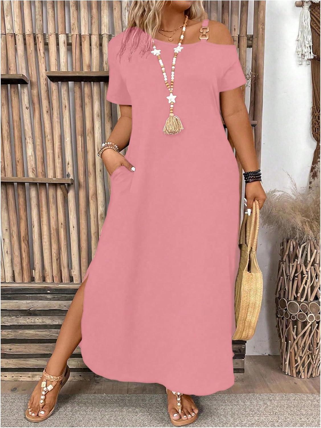 SOLY HUX Women’s Plus Size Cold Shoulder Short Sleeve Split Hem T Shirt Dress Summer Long Maxi Dresses(Pure Pink)