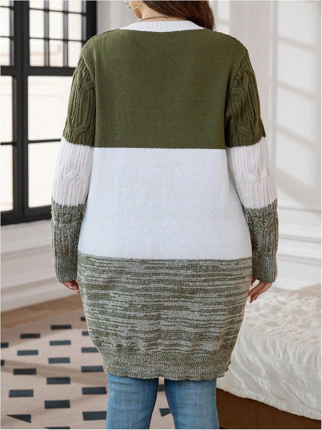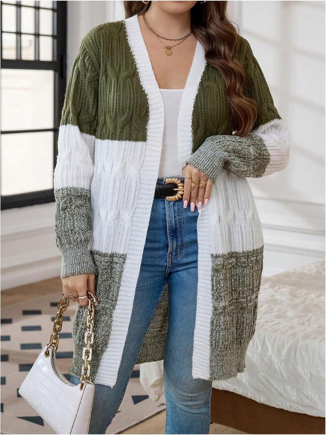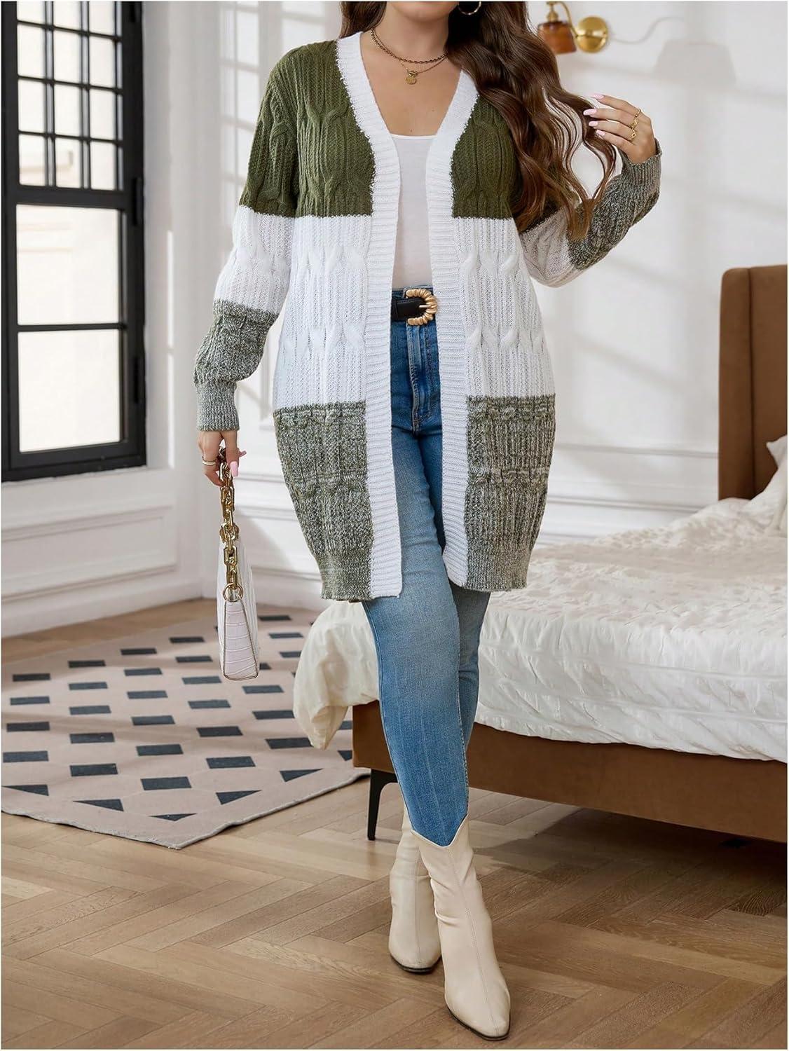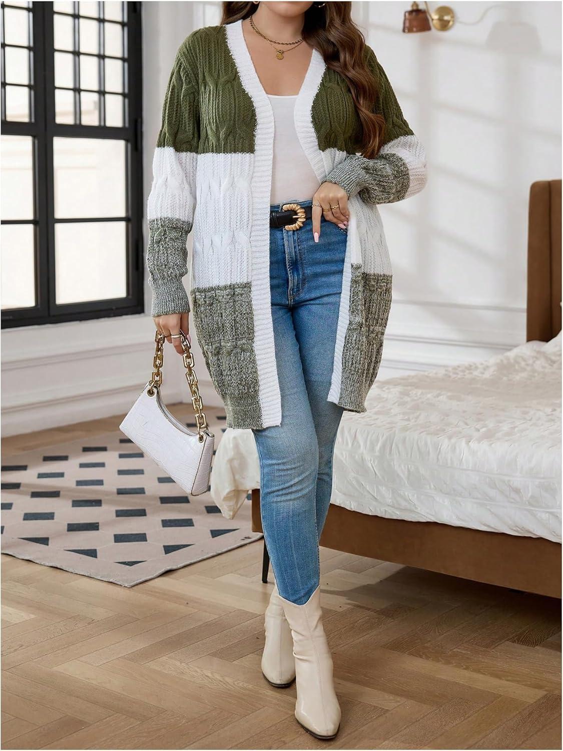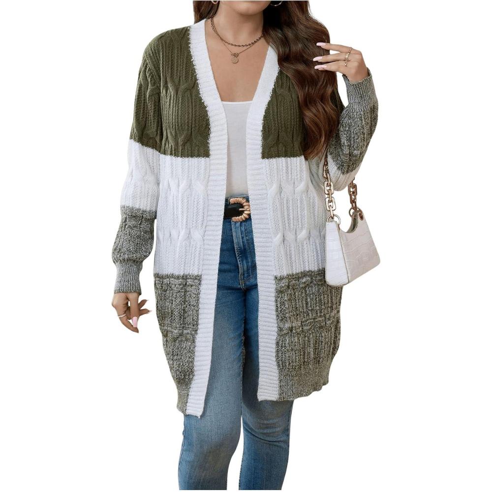 SOLY HUX Women’s Plus Size Color Block Cardigan Sweater Open Front Long Sleeve Casual Cardigans(Army Green Colorblock)