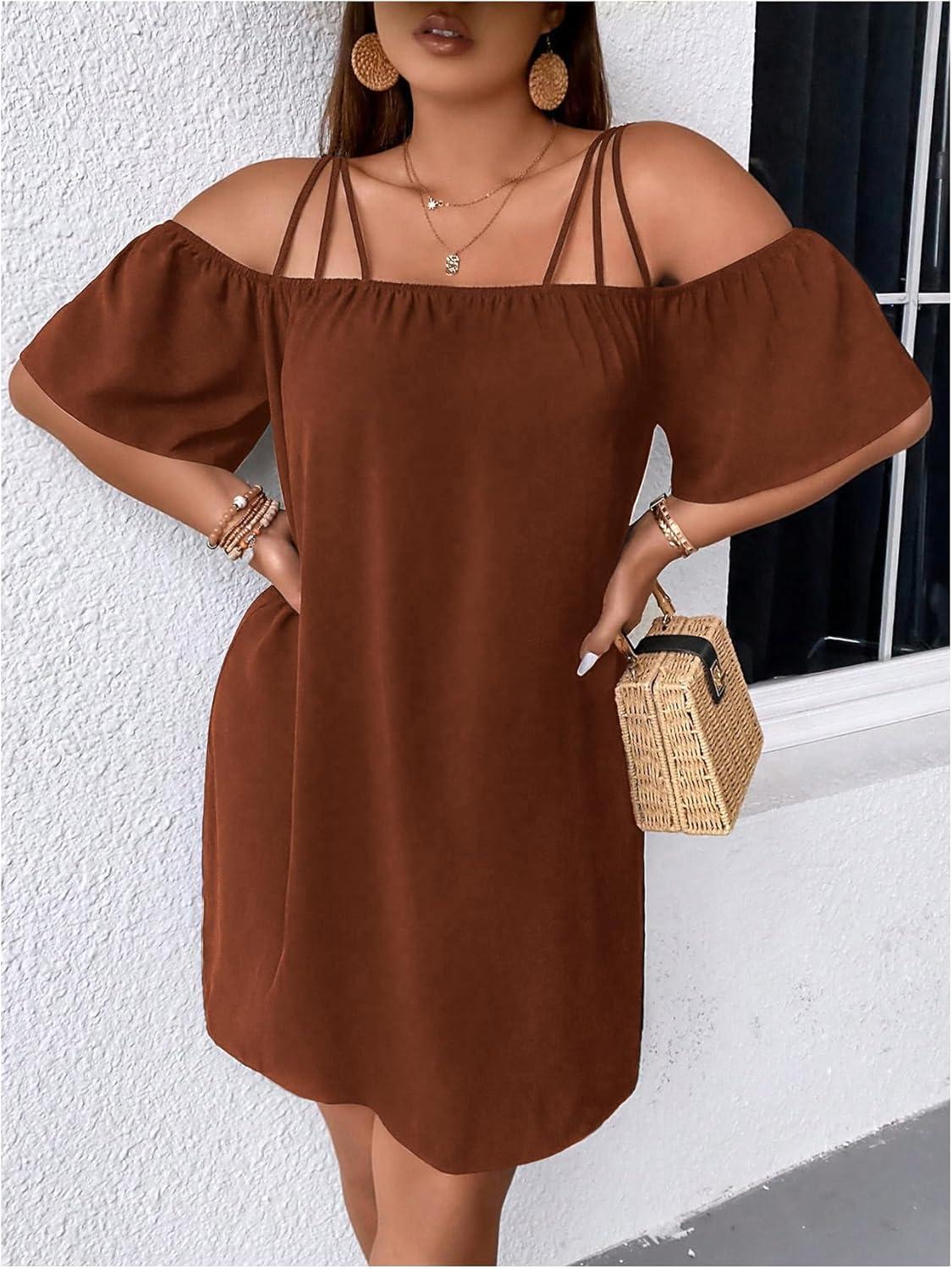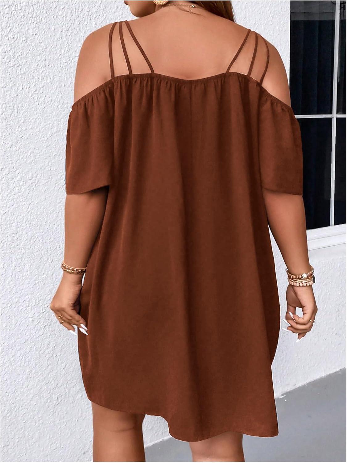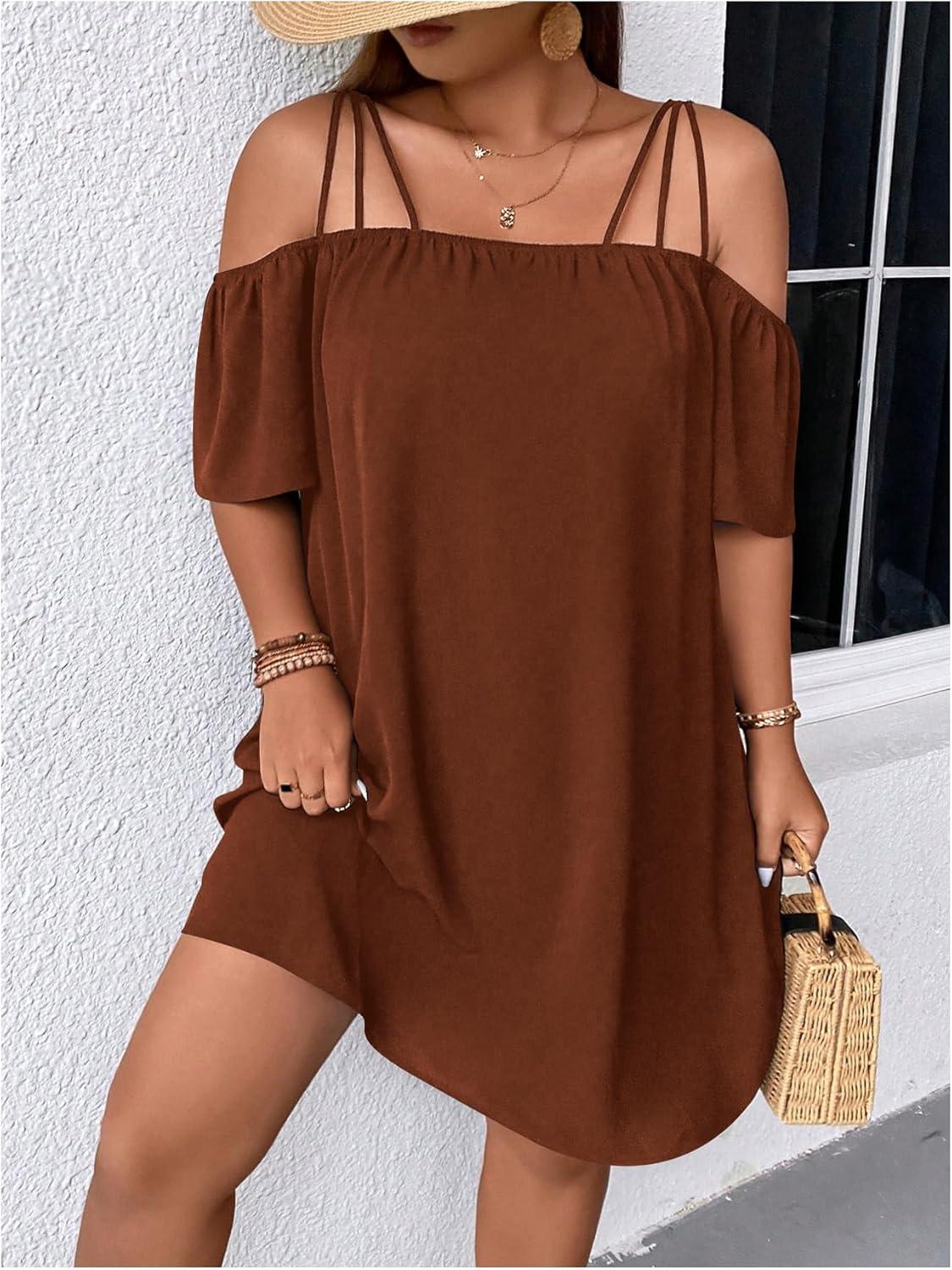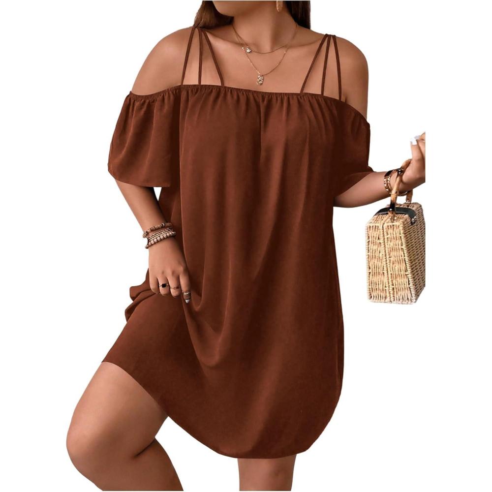 SOLY HUX Women’s Plus Size Dresses Off Shoulder Short Sleeve Short Dresses Causal Loose Tunic Summer Dress(Solid Brown)