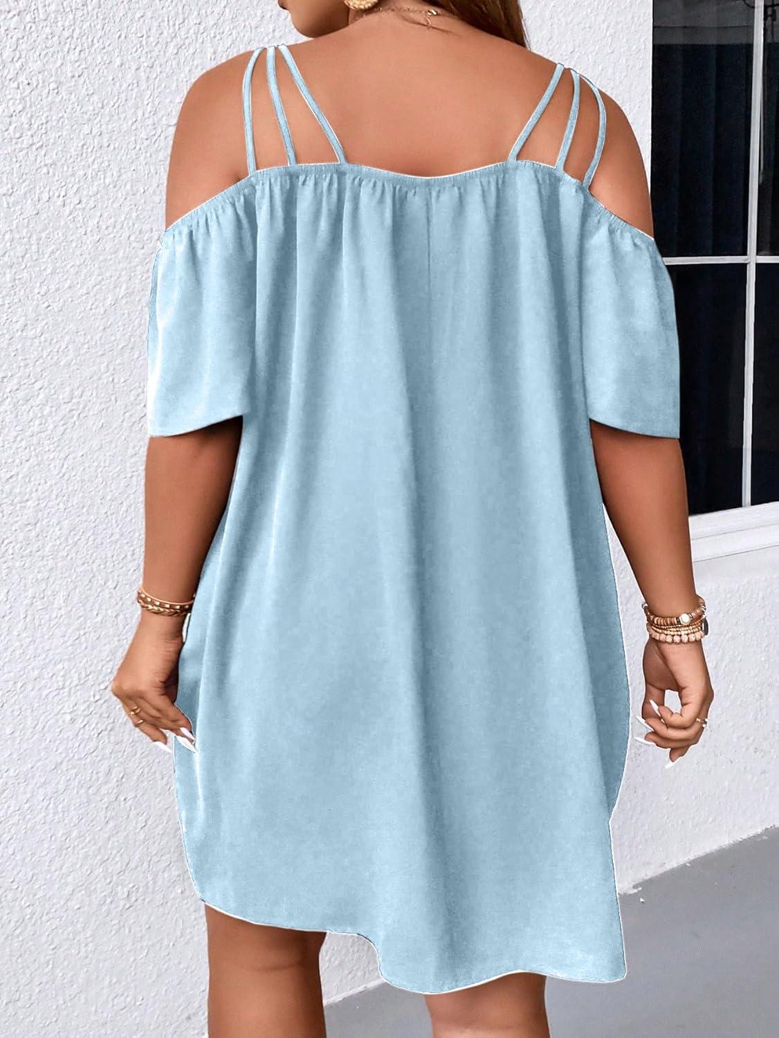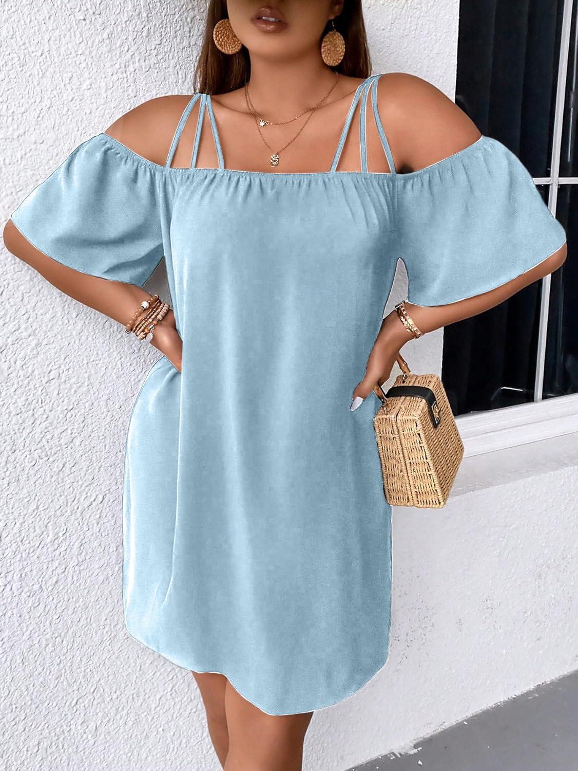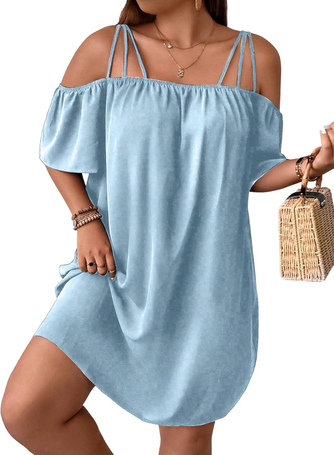 SOLY HUX Women’s Plus Size Dresses Off Shoulder Short Sleeve Short Dresses Causal Loose Tunic Summer Dress(Solid Light Blue)