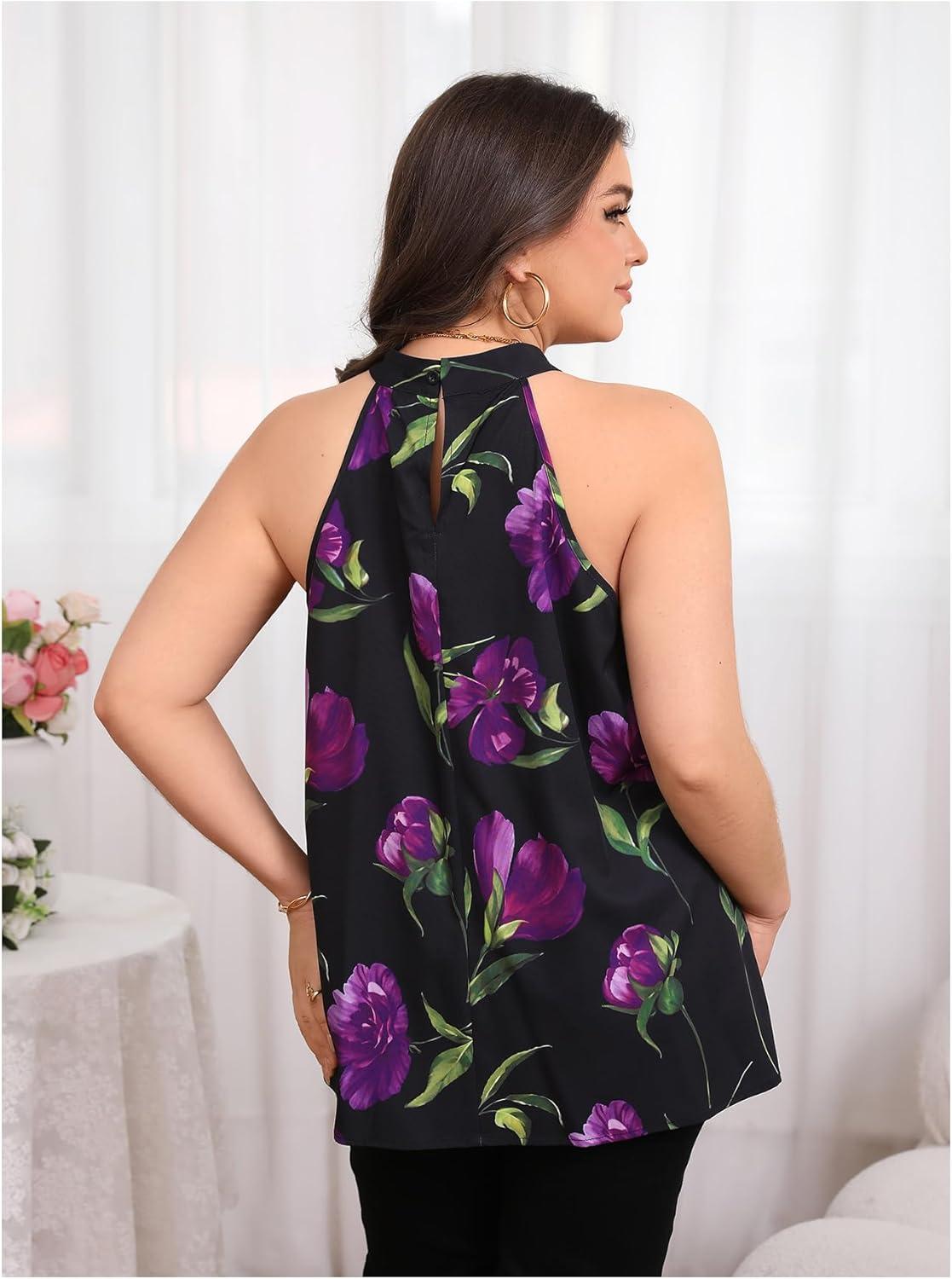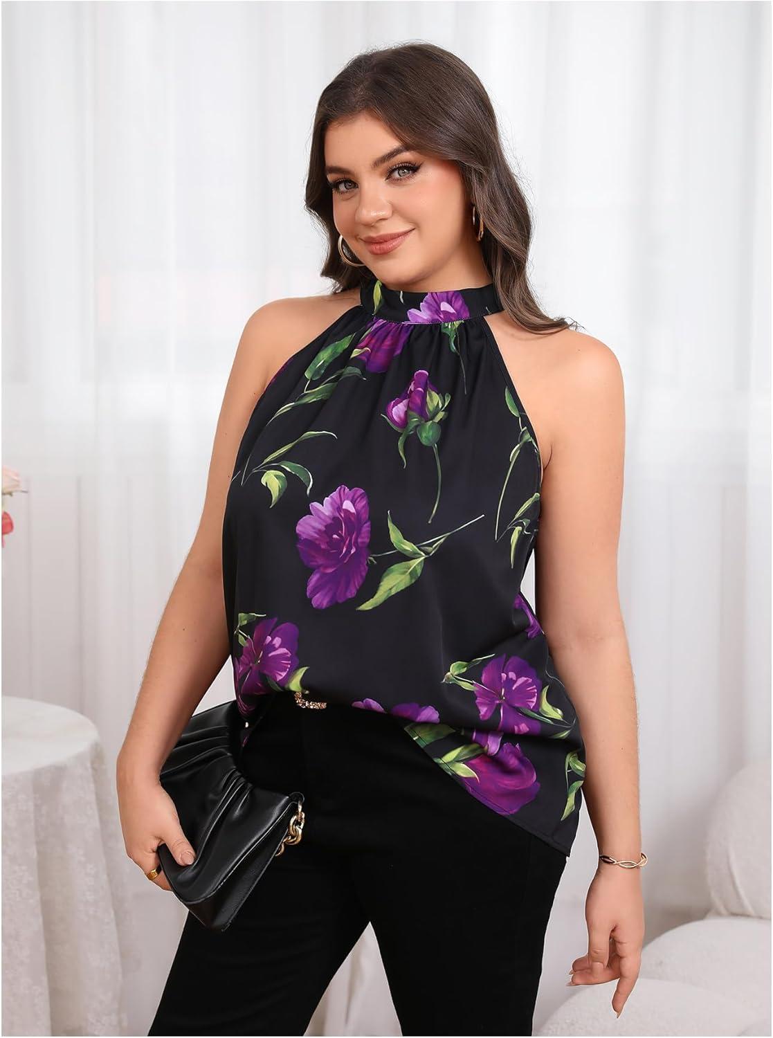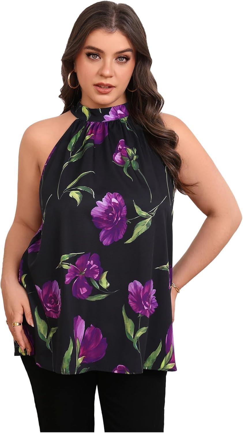 SOLY HUX Women’s Plus Size Floral Halter Tank Top Sleeveless Flowy Summer Going Out Shirts(Black and Purple Printed)