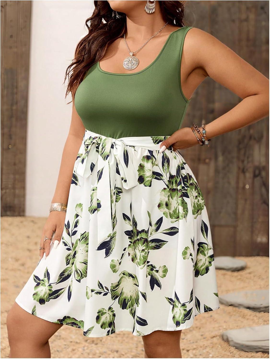SOLY HUX Women’s Plus Size Floral Tank Dress Sleeveless Square Neck A Line Flowy Belted Summer Short Dresses(Green Floral)