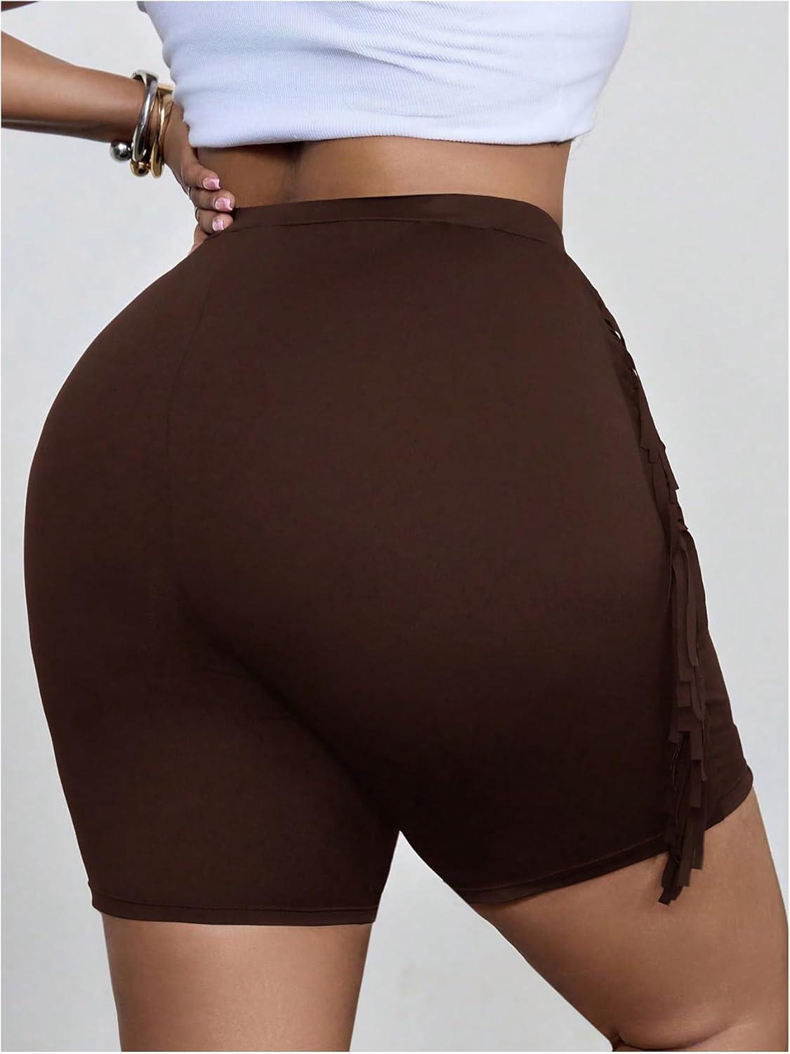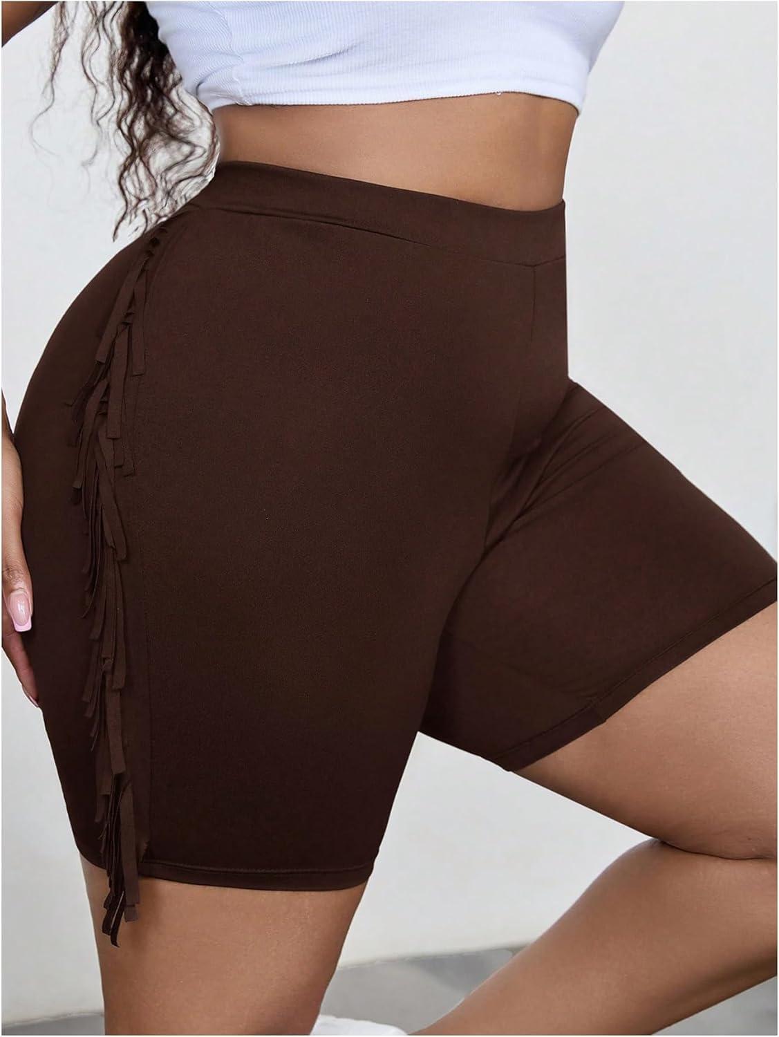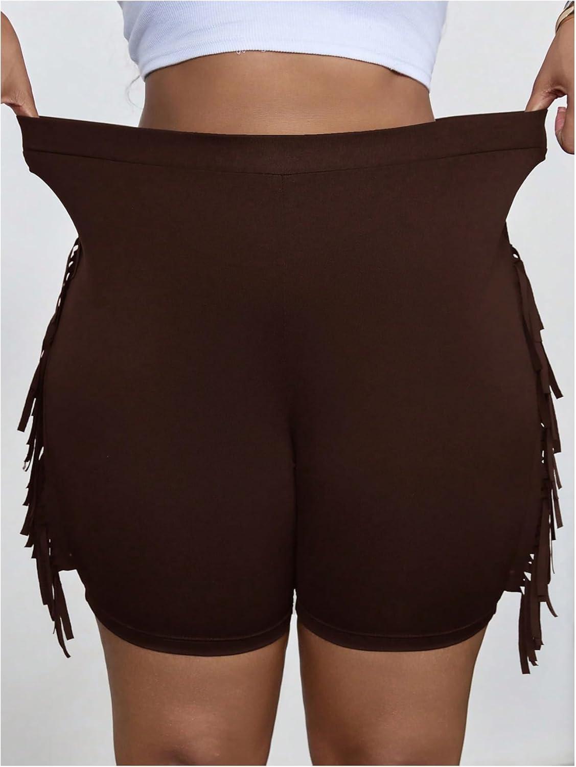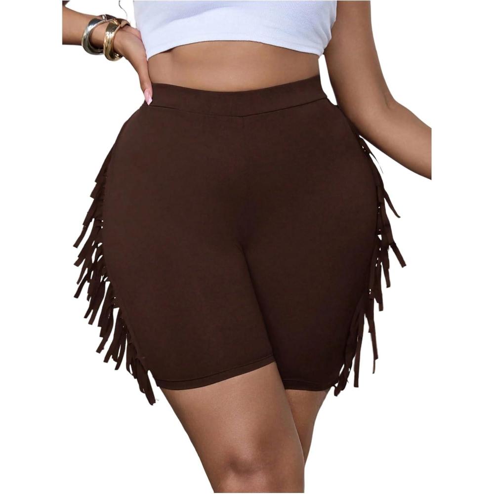 SOLY HUX Women’s Plus Size Fringe Shorts Elastic High Waisted Skinny Shorts Going Out Country Concert Outfits(Plain Brown)