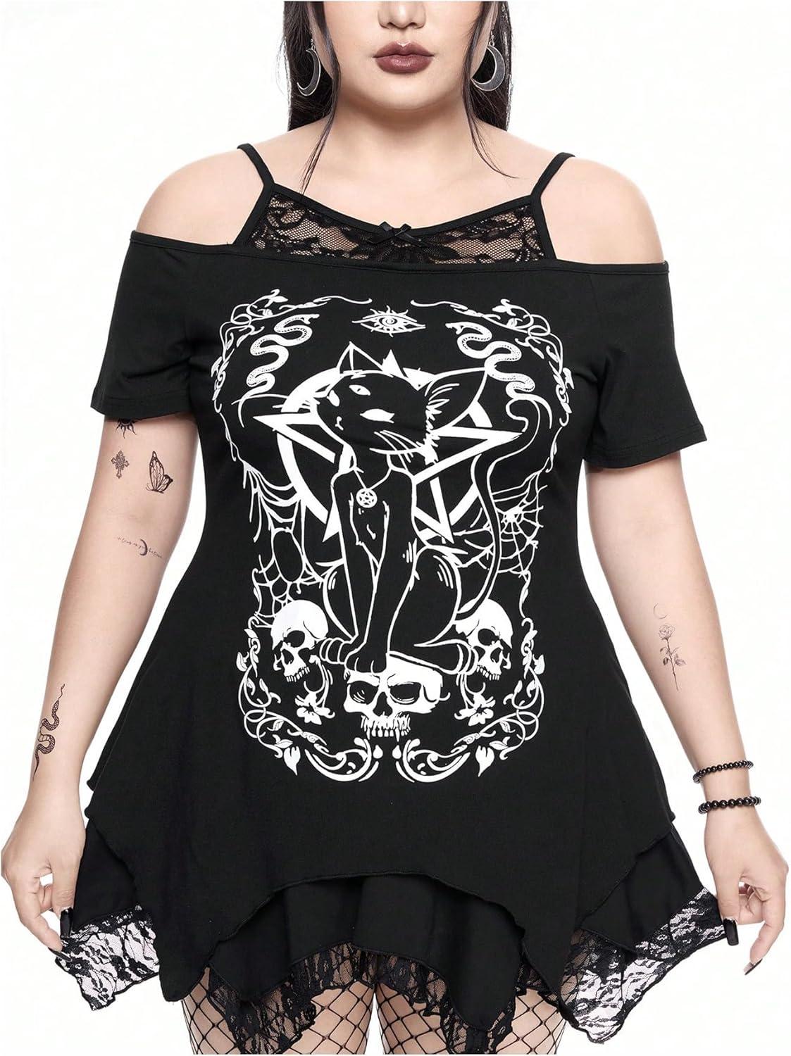 SOLY HUX Women’s Plus Size Gothic Cold Shoulder Graphic Tee Shirts Short Sleeve Y2k Tops Festival Rave Outfits Streetwear(Black Graphic)