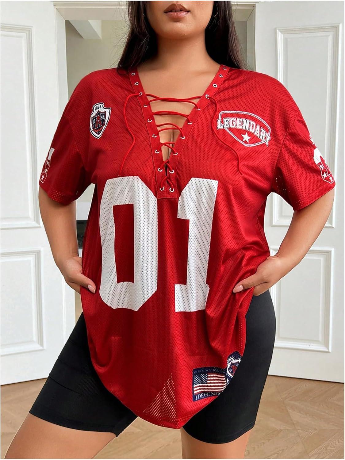 SOLY HUX Women’s Plus Size Jersey Lace Up V Neck Short Sleeve T Shirts Number Graphic Tee Tops Streetwear(Red Graphic)