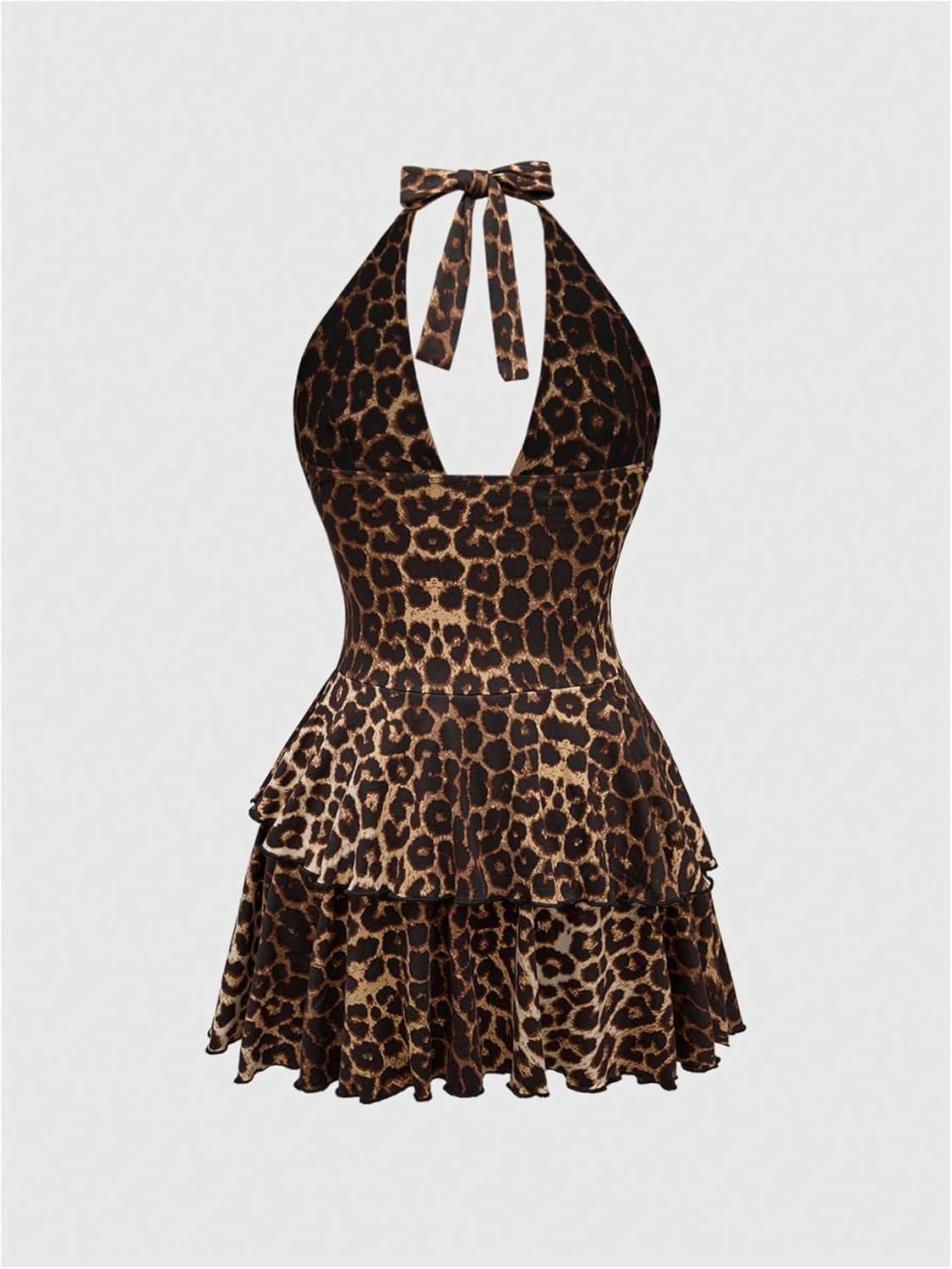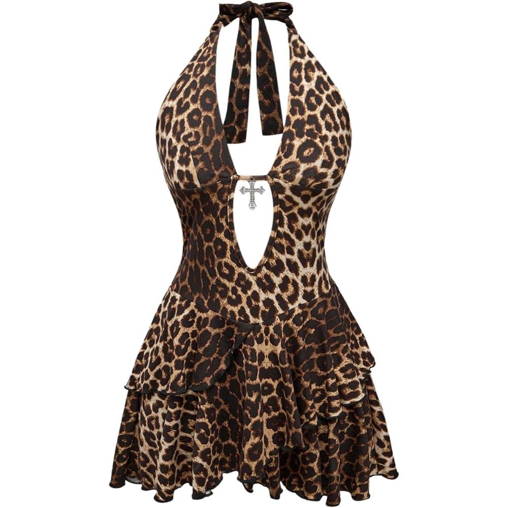 SOLY HUX Women’s Plus Size Leopard Print Halter Dress Y2k Gothic Deep V Cheetah Tie Backless Layered Ruffle Mini Dresses(Brown Leopard)