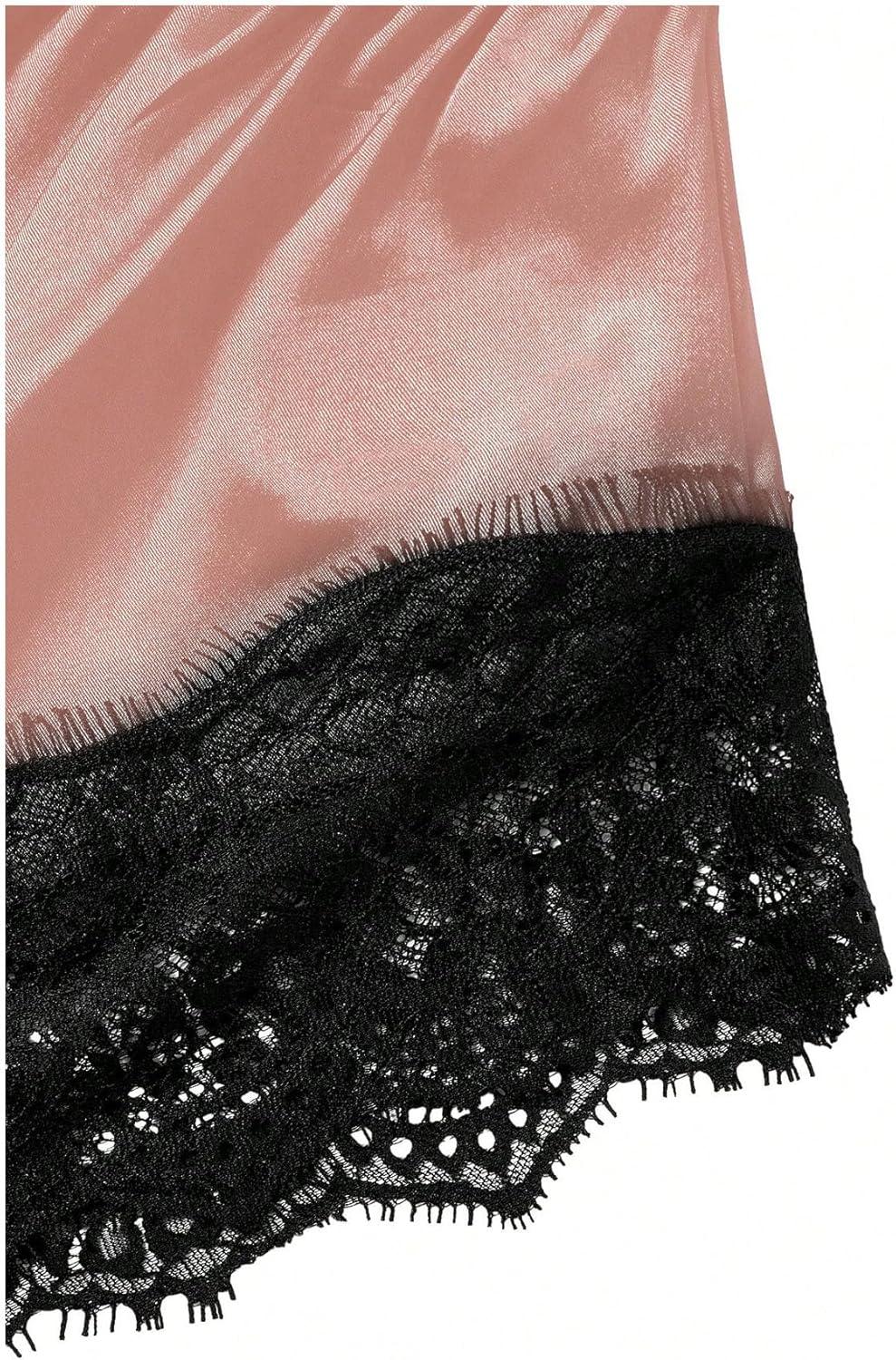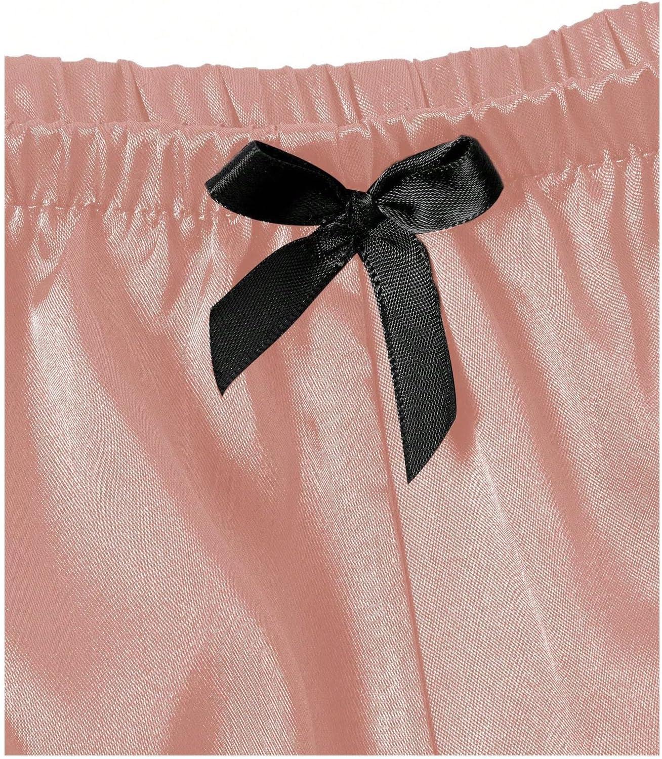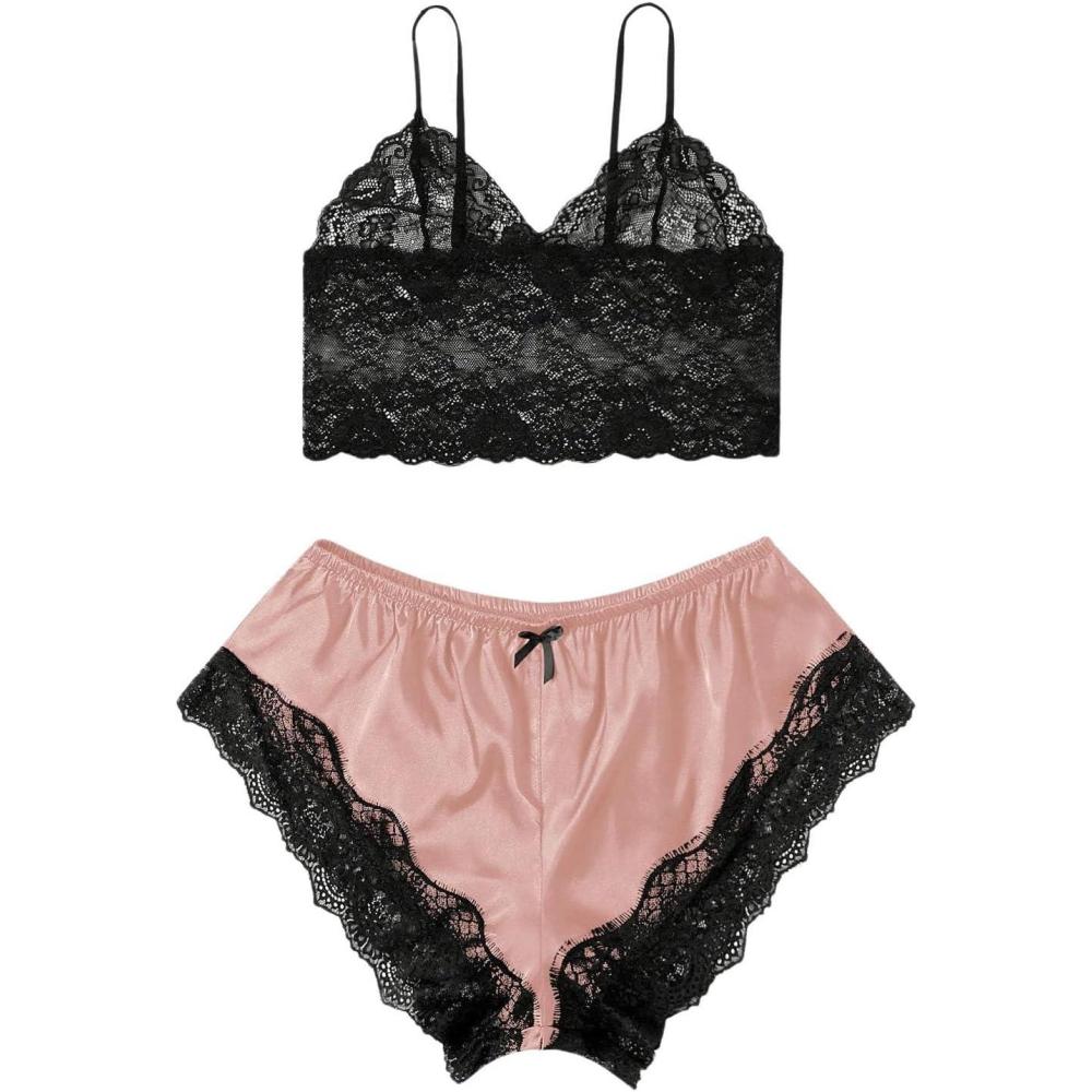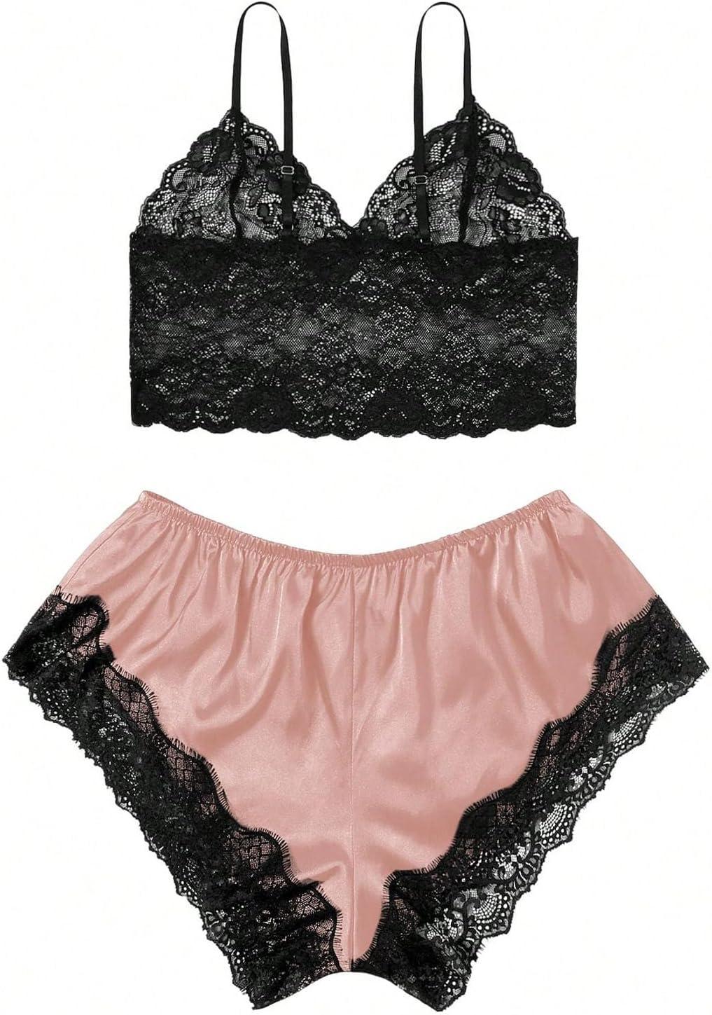 SOLY HUX Women’s Plus Size Lingerie Set Spaghetti Strap Lace Trim Bralette and Shorts Sleepwear Pajama Set(Pink and Black Satin)