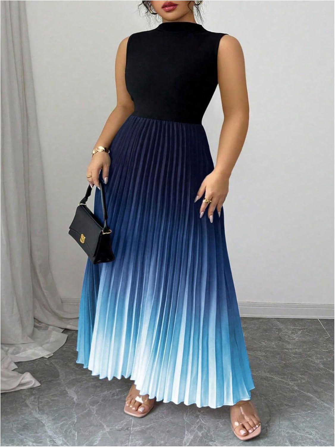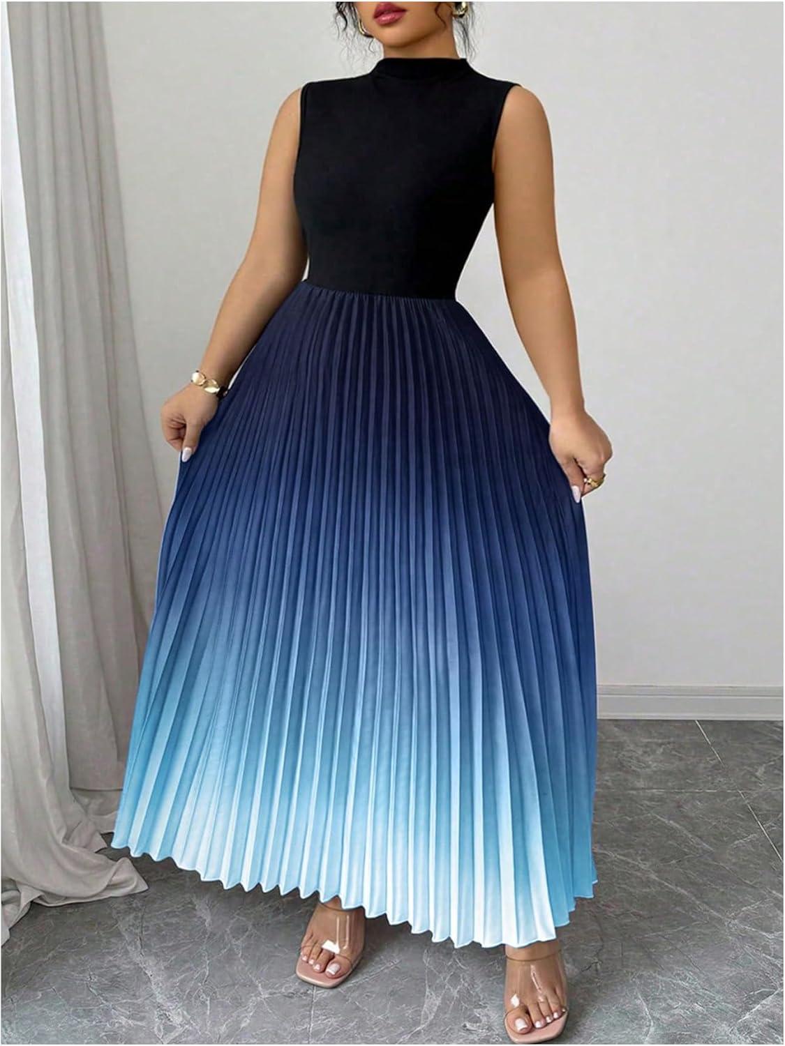 SOLY HUX Women’s Plus Size Maxi Dress Ombre Mock Neck Sleeveless Pleated A Line Flowy Long Dresses(Multicoloured Gradient)