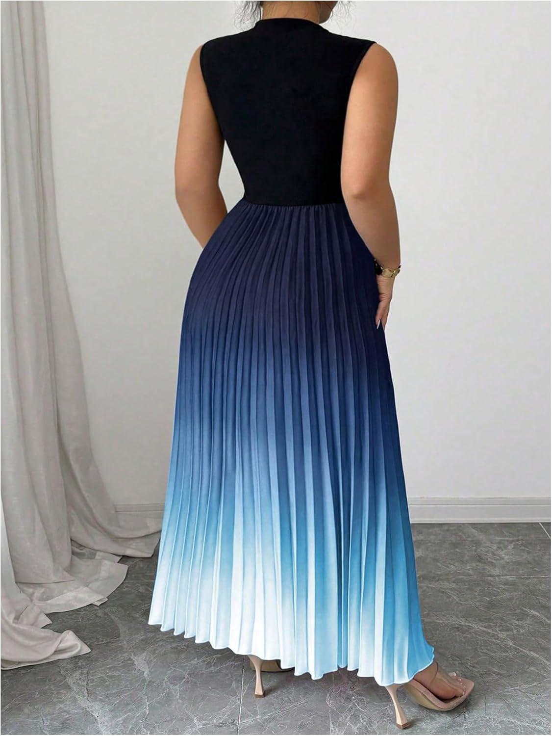SOLY HUX Women’s Plus Size Maxi Dress Ombre Mock Neck Sleeveless Pleated A Line Flowy Long Dresses(Blue Gradient)